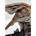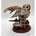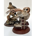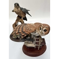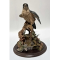 A Country Artists figure of a peregrine falcon 'Lord Of The Skies' seated on a naturalistic tree stump, with foliage, mounted on a wooden base, height approx 40cm, and a Franklin Mint porcelain model of a tawny owl, mounted on a wooden base, height 31cm (2)