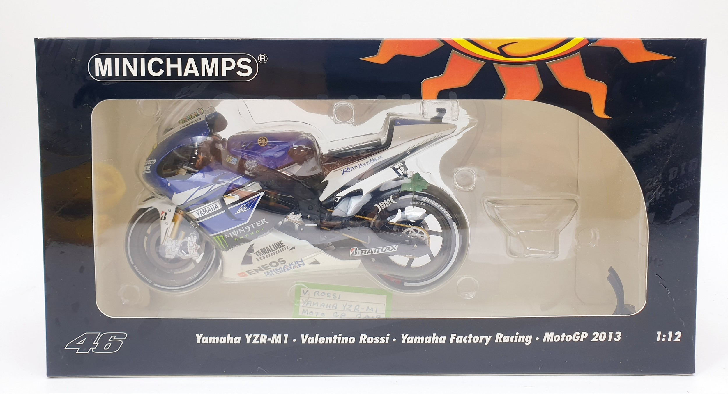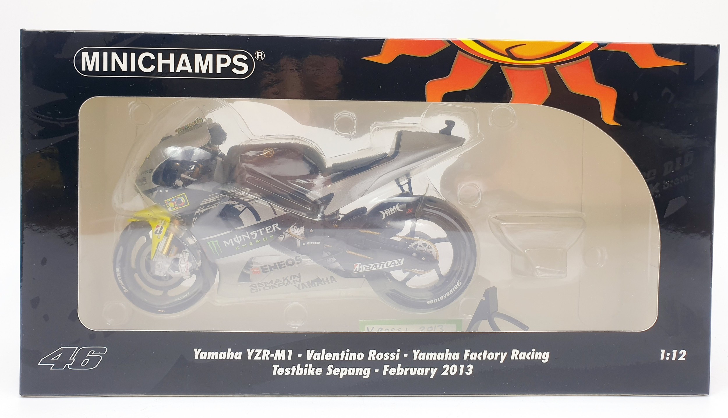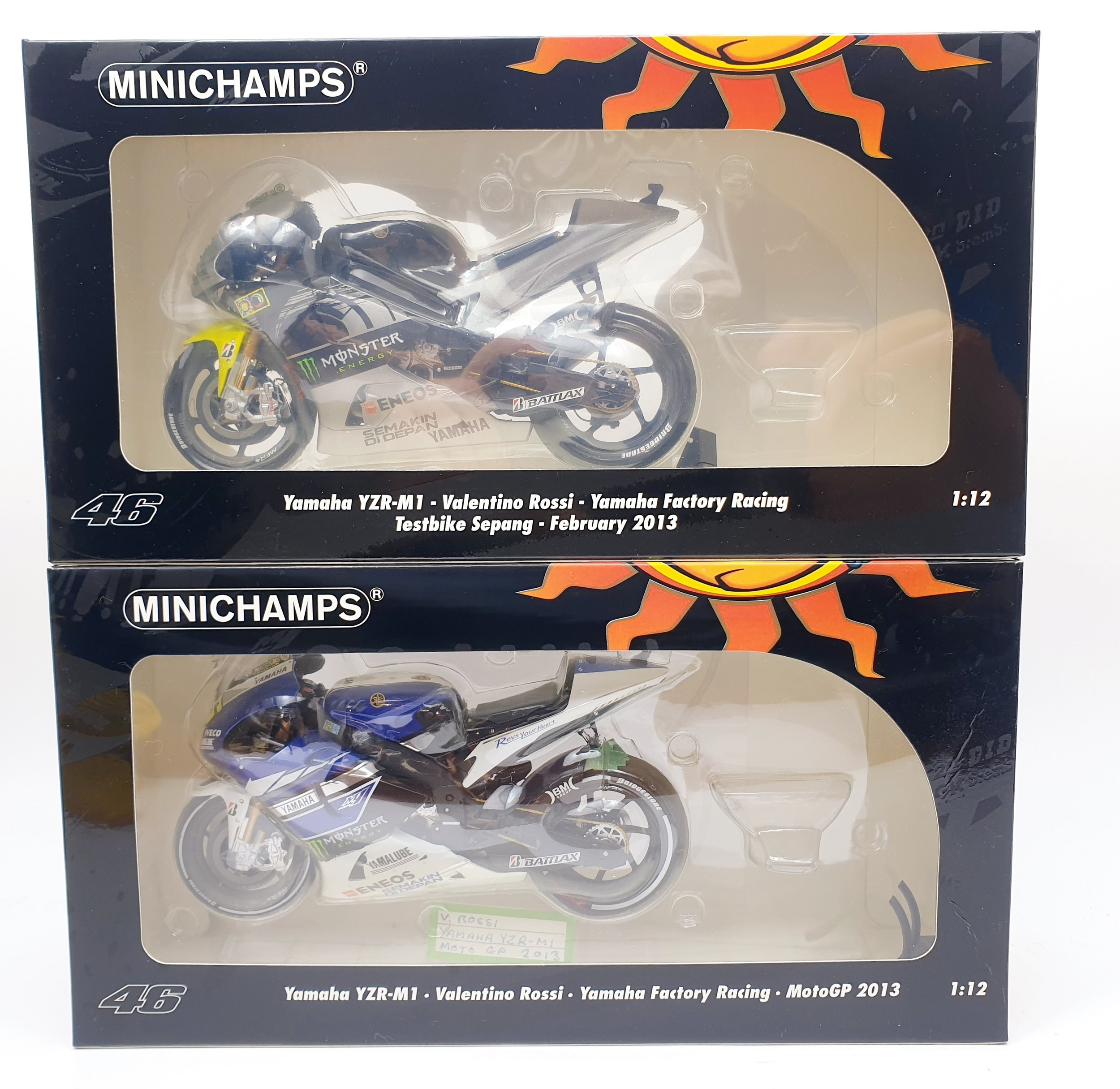 Minichamps Pauls Model 1:12 scale Valentino Rossi Yamaha YZR-M1 Yamaha Factory Racing Test Sepang 2013 bike & Yamaha YZR-M1 Yamaha Factory Racing Team bike 2013.