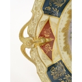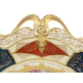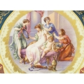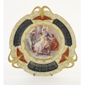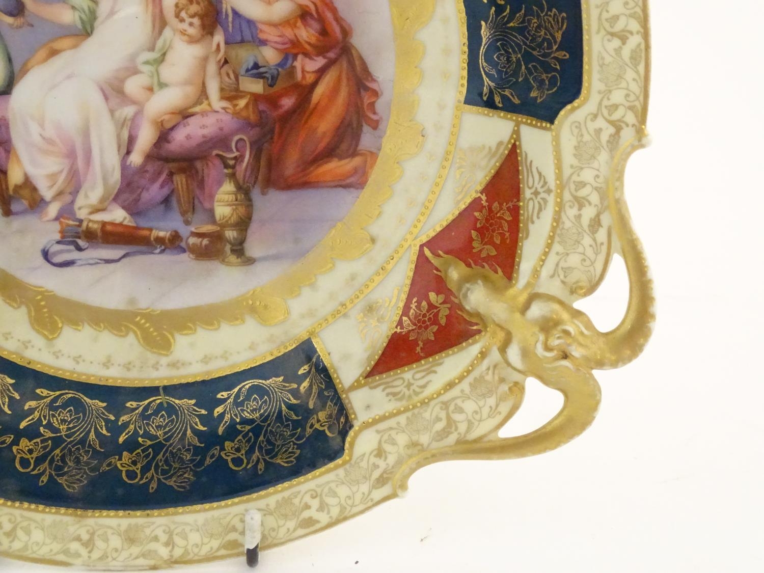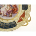 A Continental three handled cabinet plate, the central scene depicting Cupid and Psyche with attendants. The handles moulded as rams heads. Royal Vienna style beehive mark under. Approx. 10" diameter