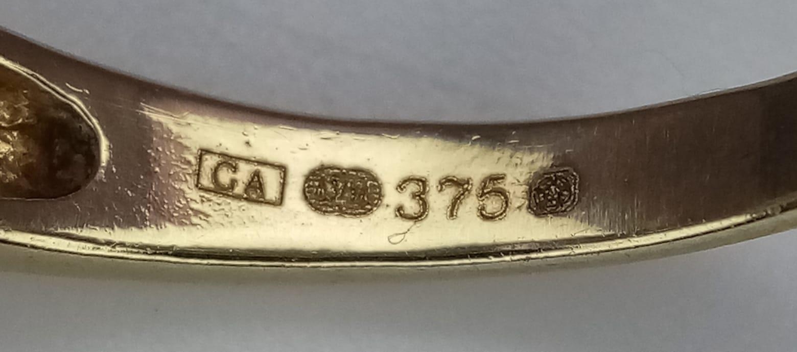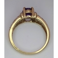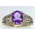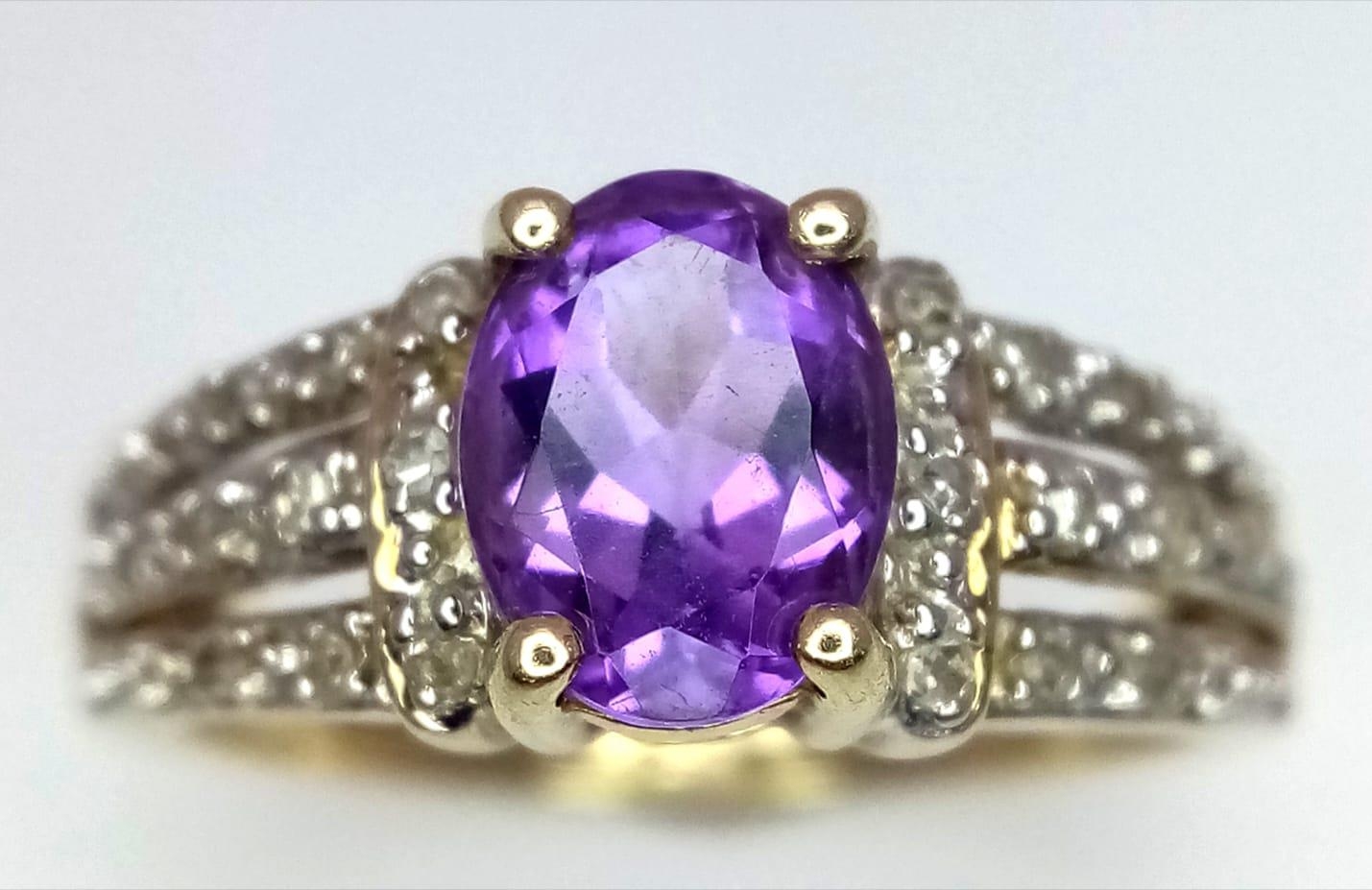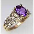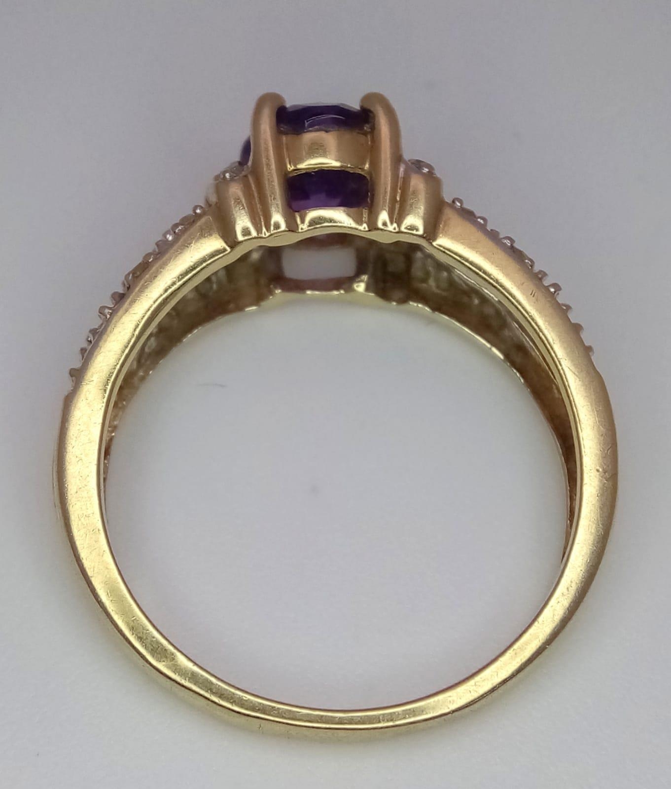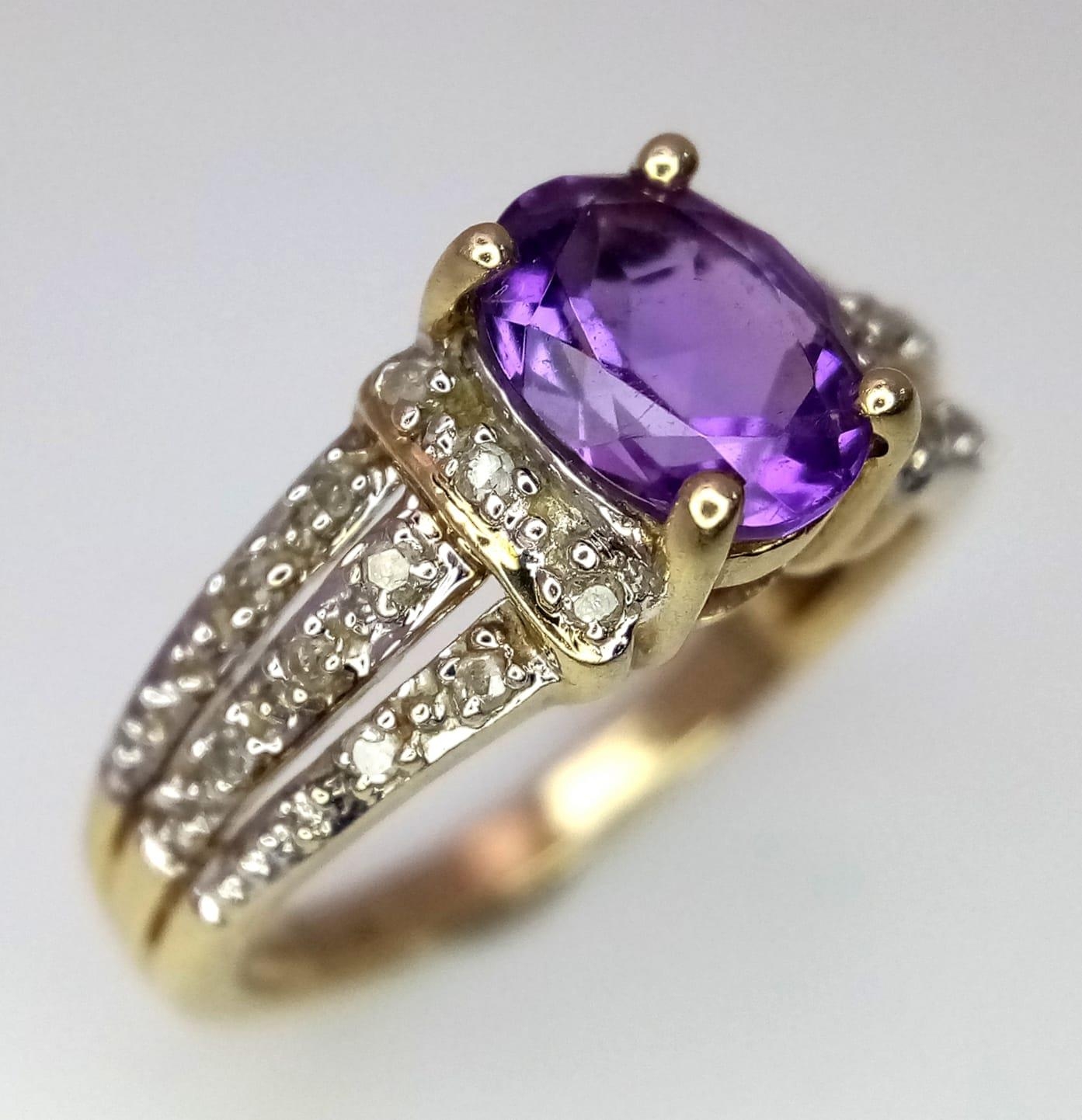A 9K YELLOW GOLD DIAMOND & AMETHYST SET RING. Size N, 3g total weight.