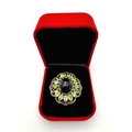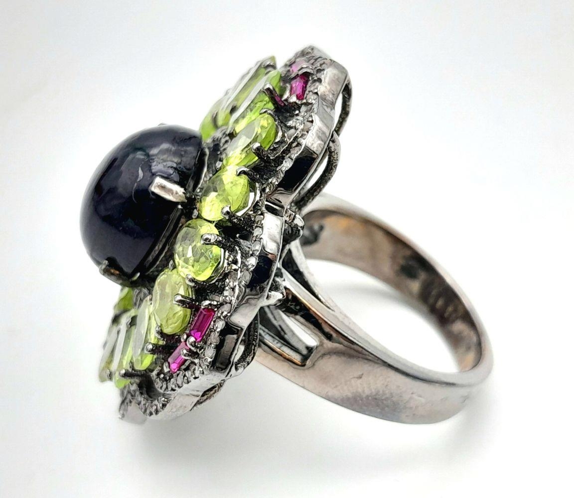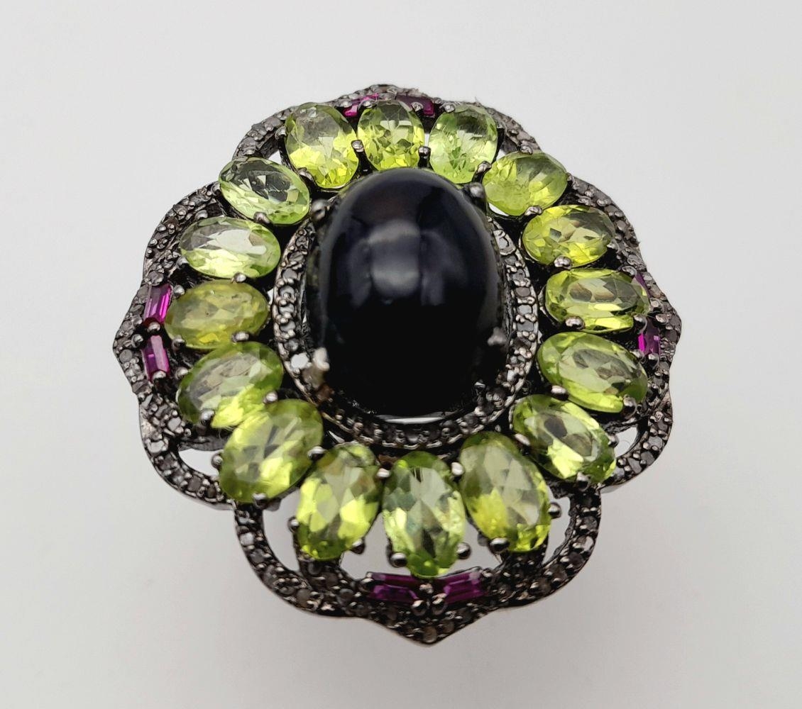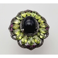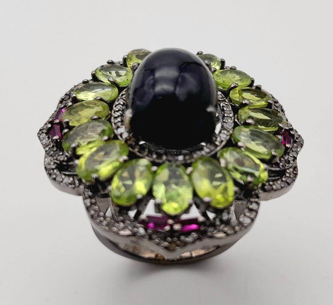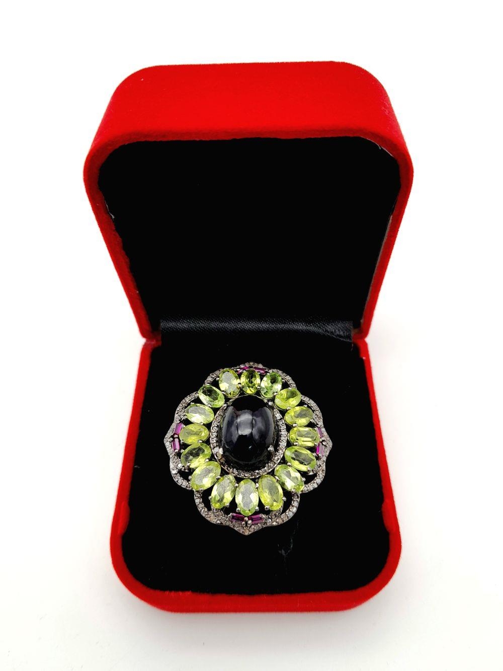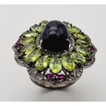 A Peridot, Opal, Ruby and Diamond Ring. Set in 925 silver. Central black opal cabochon with peridot and diamond surrounds. Ruby accents. Size N 1/2. Comes with a presentation case. CD-1615