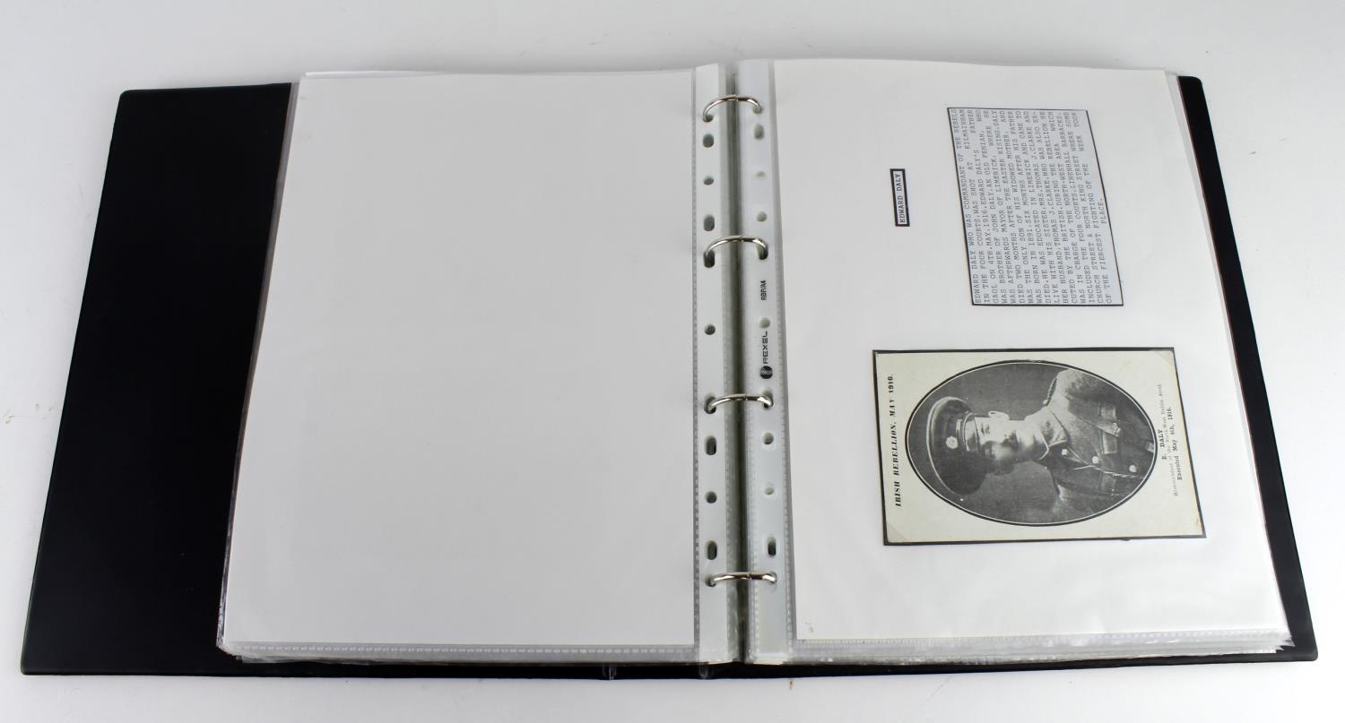 Ireland political history, loose-leaf album containing an extraordinary collection of 1916 Easter Rising & Sinn Fein postcards depicting leaders of the Irish Rebellion (14), the arrest of rebels (2) and other scenes inc devastation and ruins etc during or after the uprising, and earlier Home Rule demonstrations 1912 etc (47) also a May 1st 1916 letter from Belfast referencing the "Dublin affair" and opinion that "the worst of the outbreak is over now". (approx 75 cards)