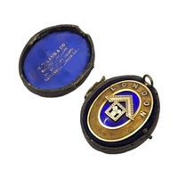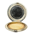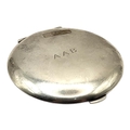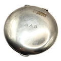 Circular form with polished finish exterior, engraved initials: ‘A.A.B.’, interior having bevelled circular mirror with parcel gilt finish.