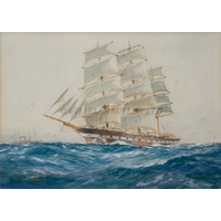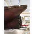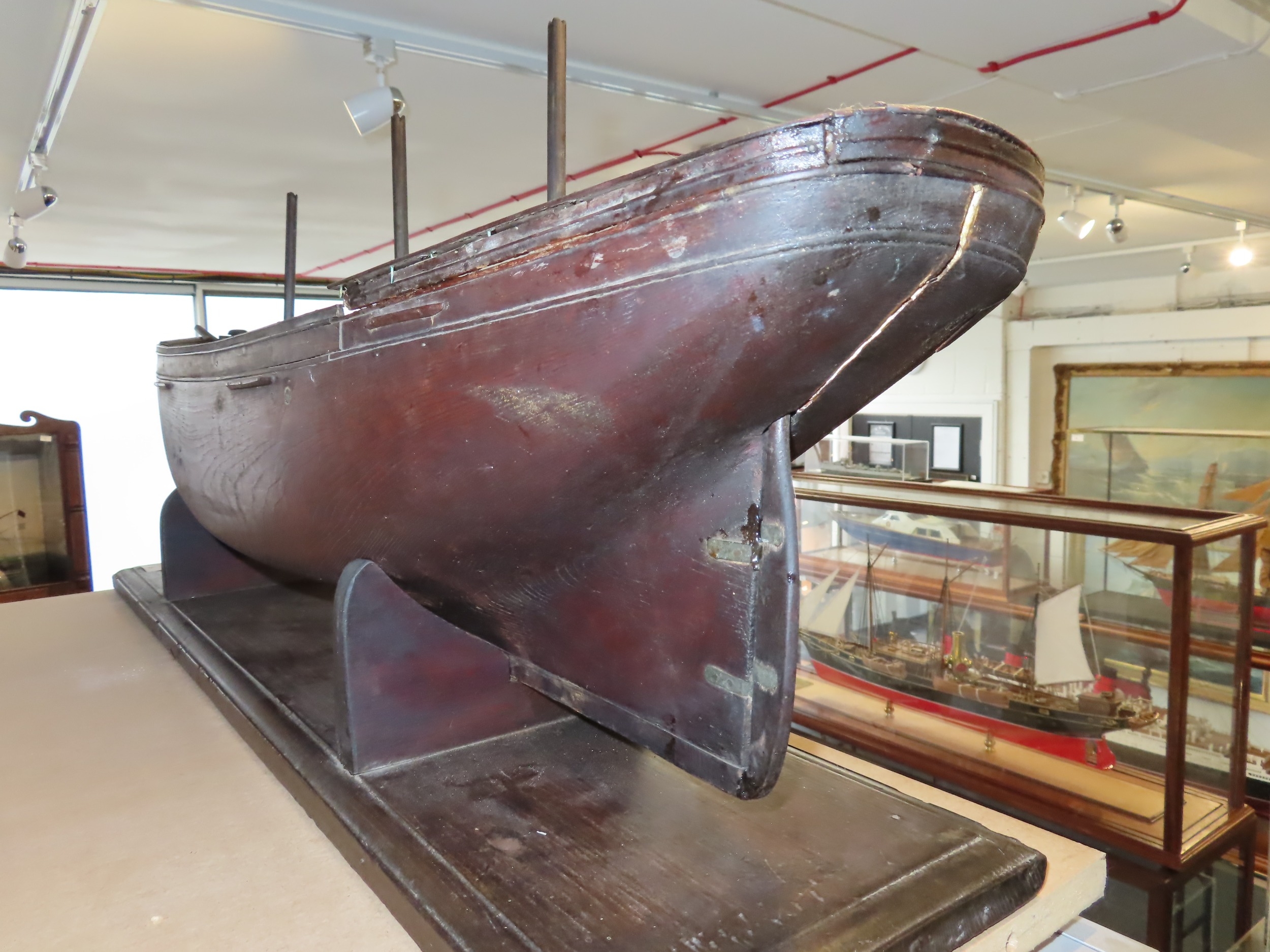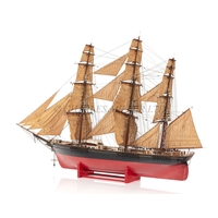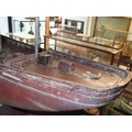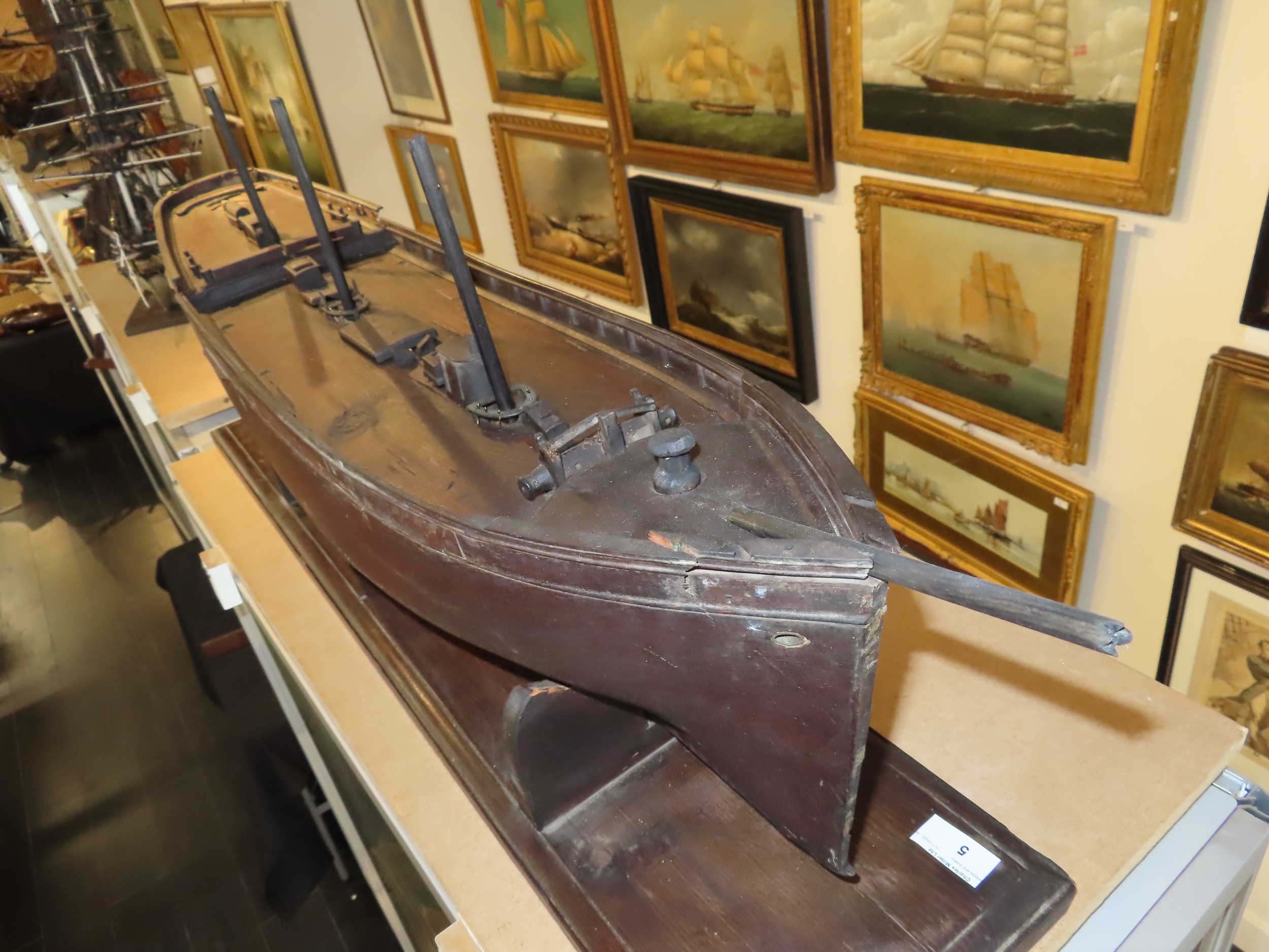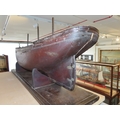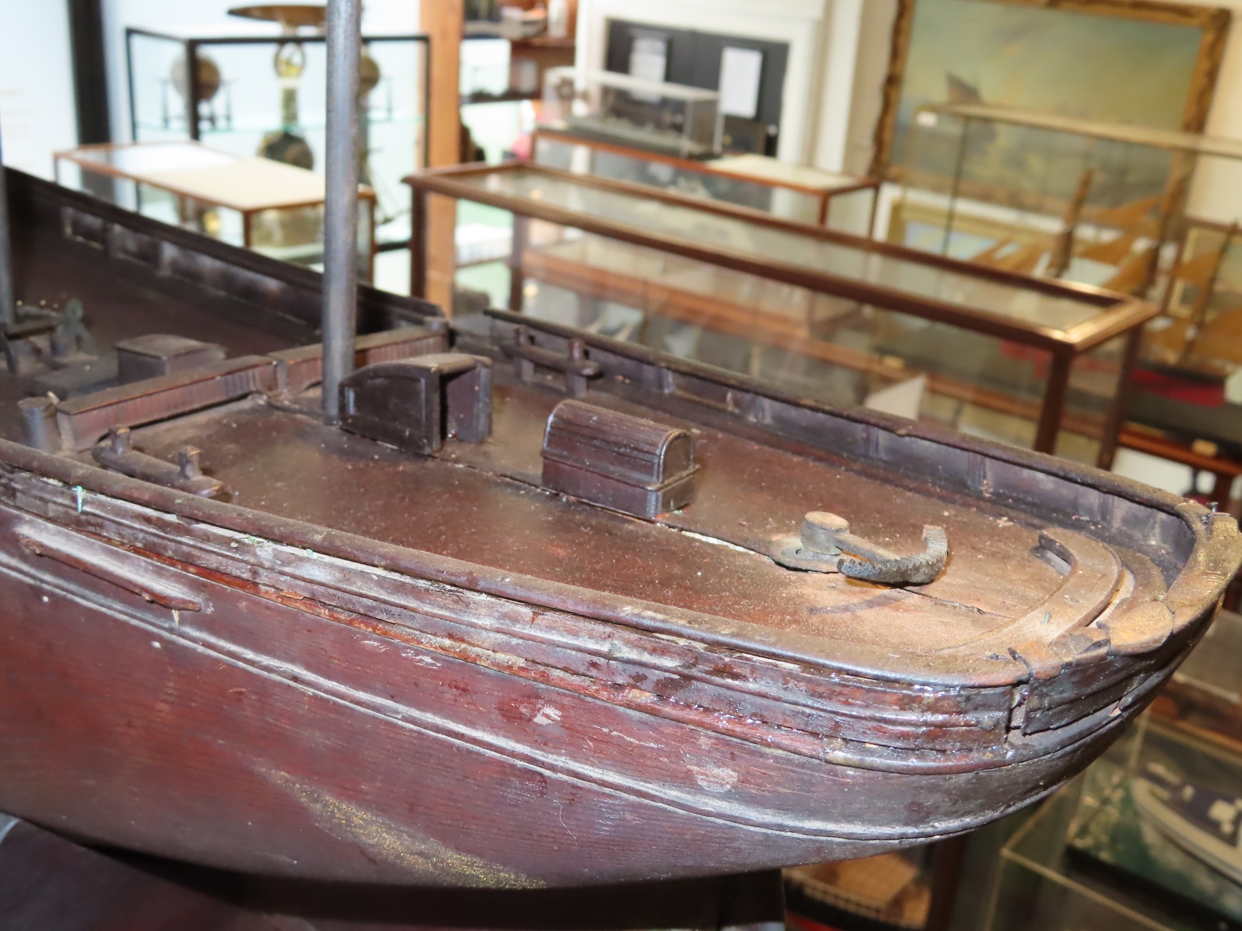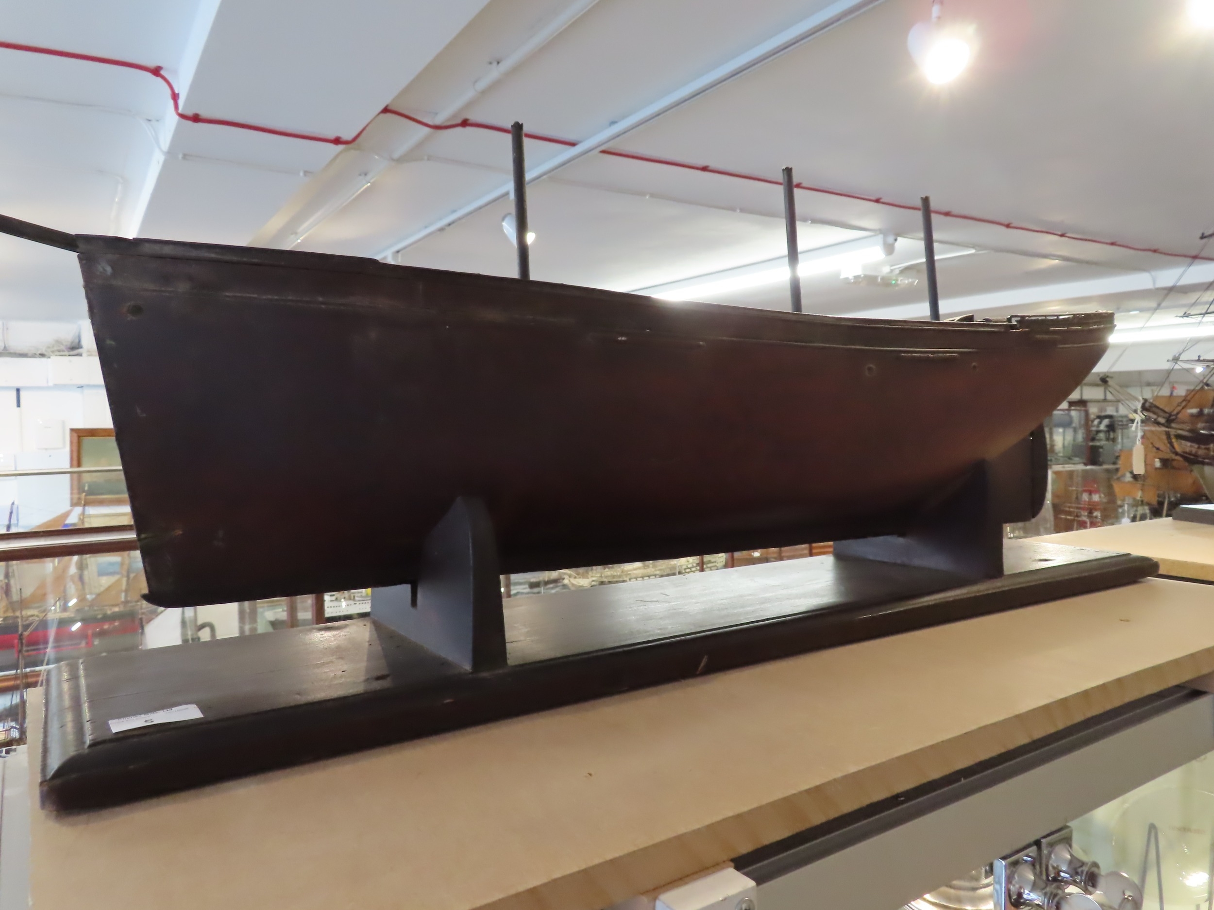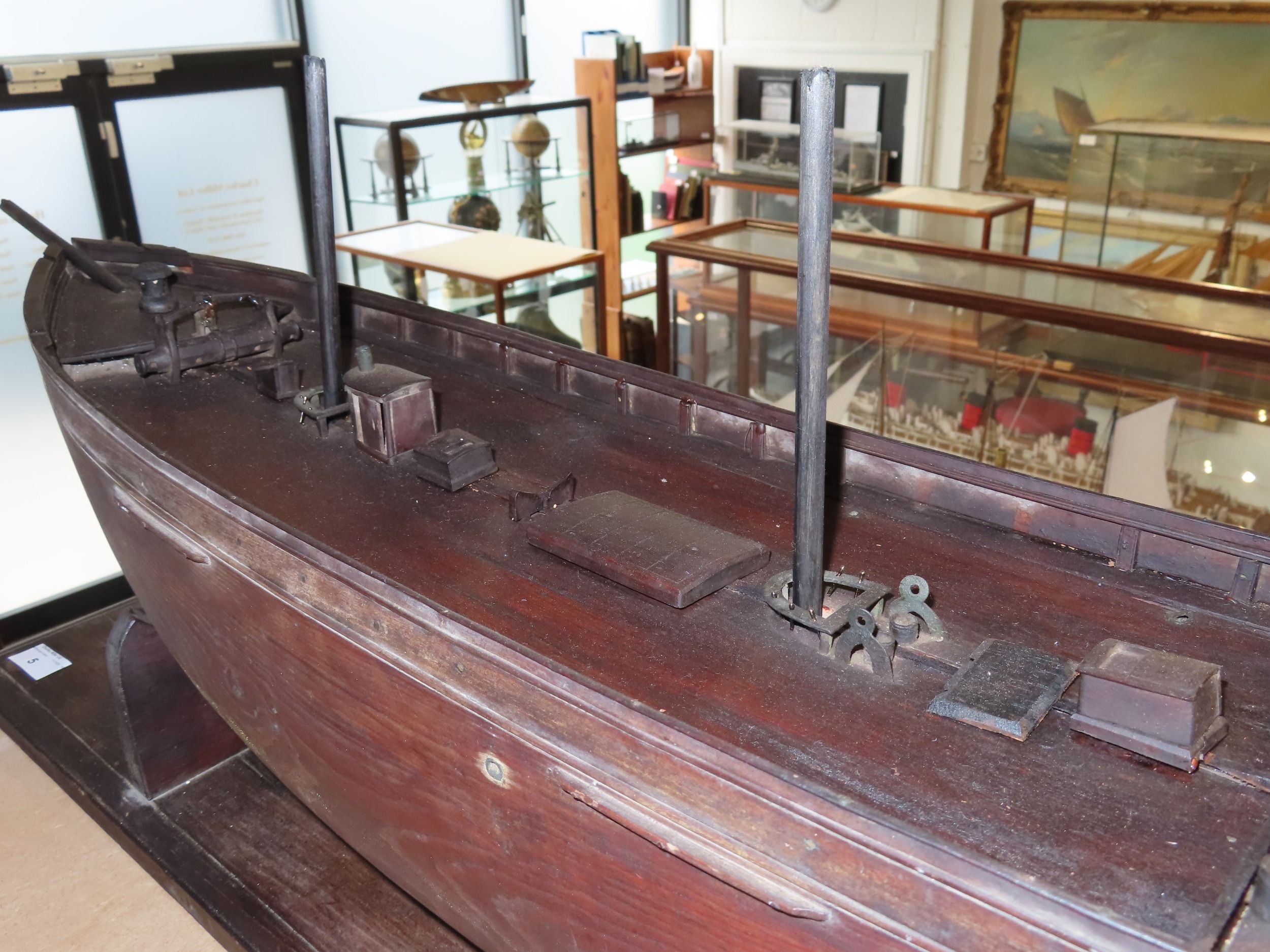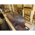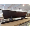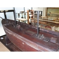 the 36in. hull carved from the solid in stained lime or pine wood, carved wooden deck fittings including winch, belaying rails, covered hatches, deck house, covered companionways, saloon light etc, three cut-away masts and bowsprit, loosely mounted on cradle stand -- 15 x 40in. (38 x 101.5cm.)