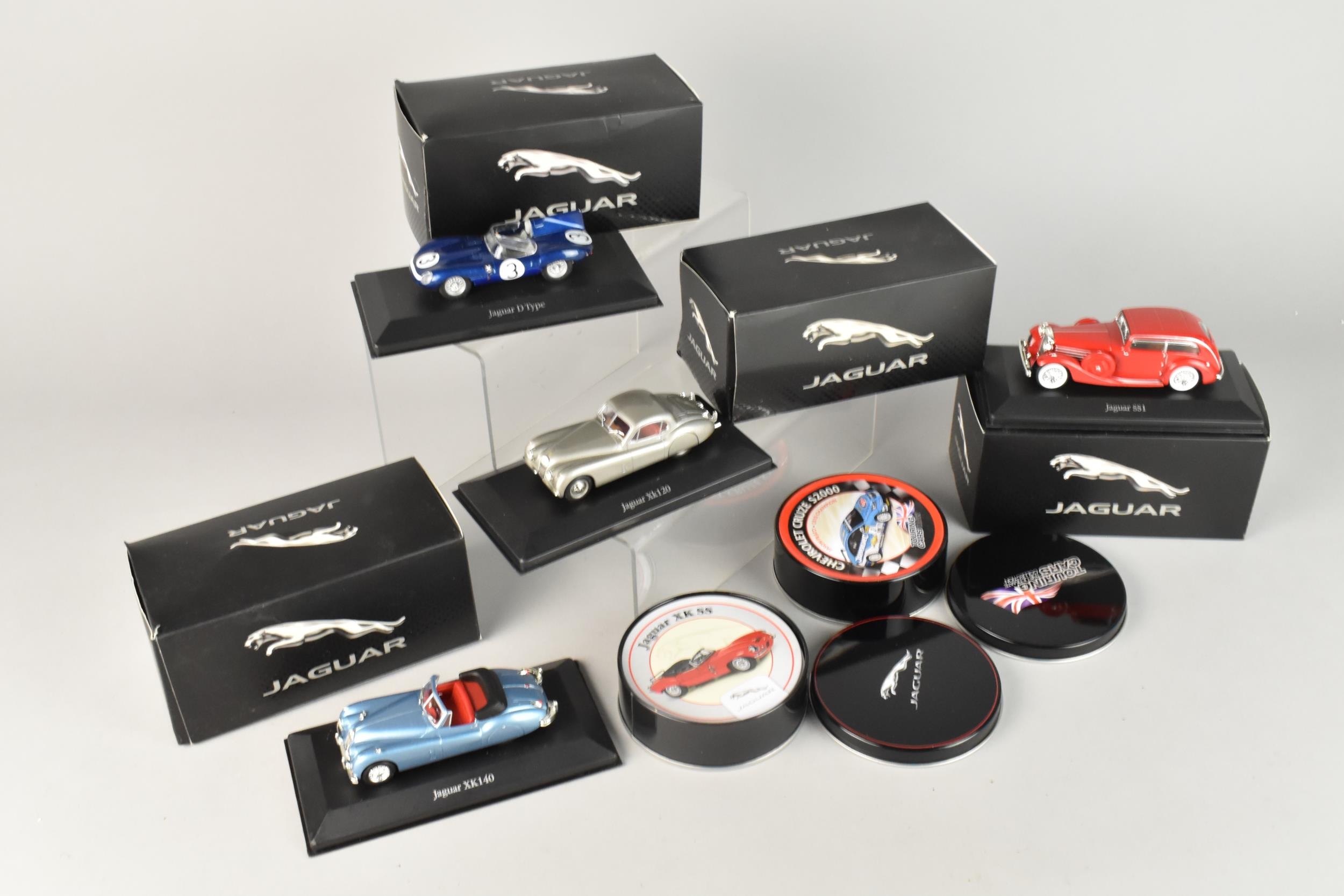 Four Boxed Atlas Editions Jaguar Models together with Two Tins of Jaguar Coasters
