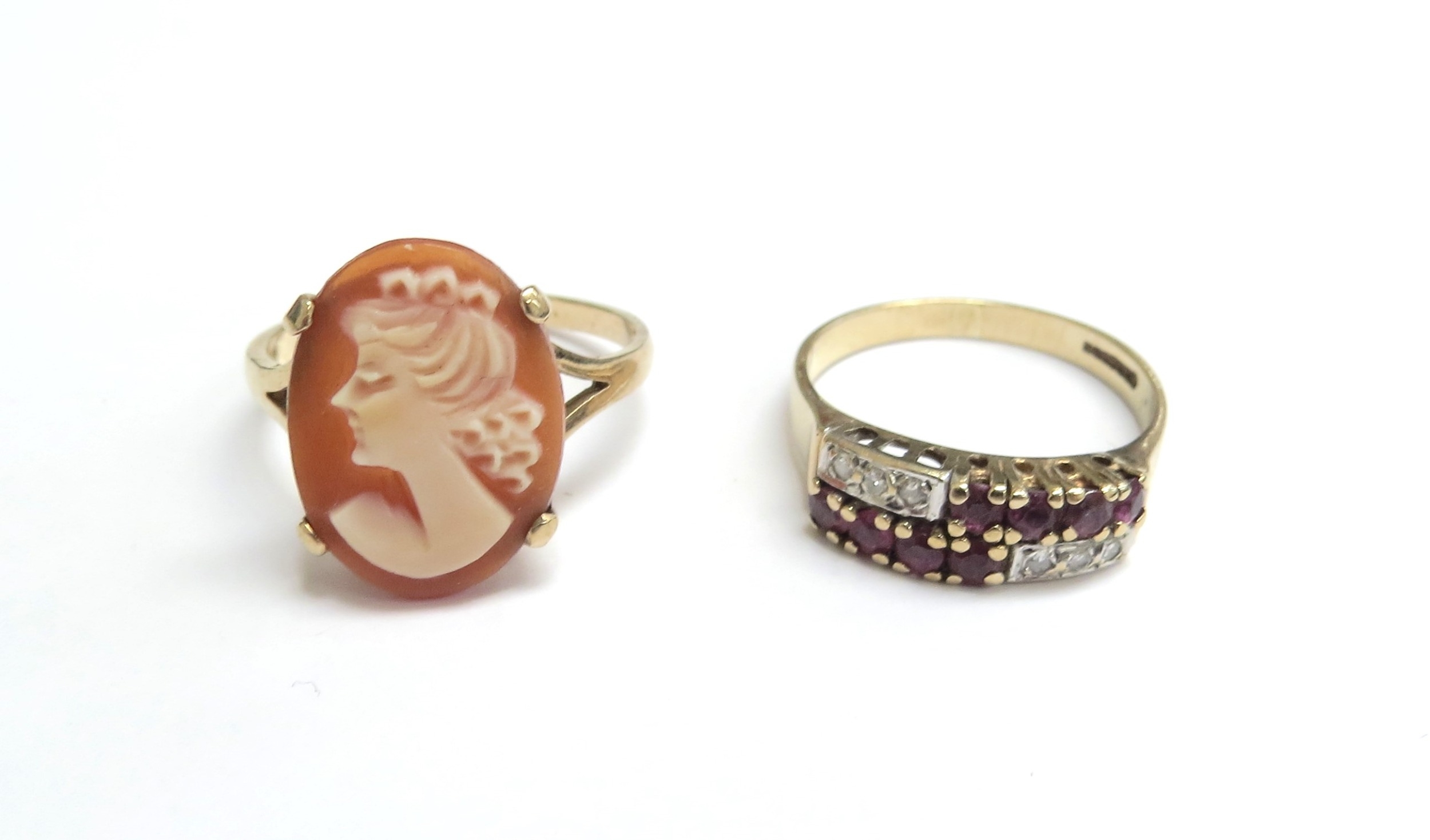 A 9ct gold cameo ring, size P/Q and a 9ct gold ruby and diamond ring, size O, 5.1g total (2)