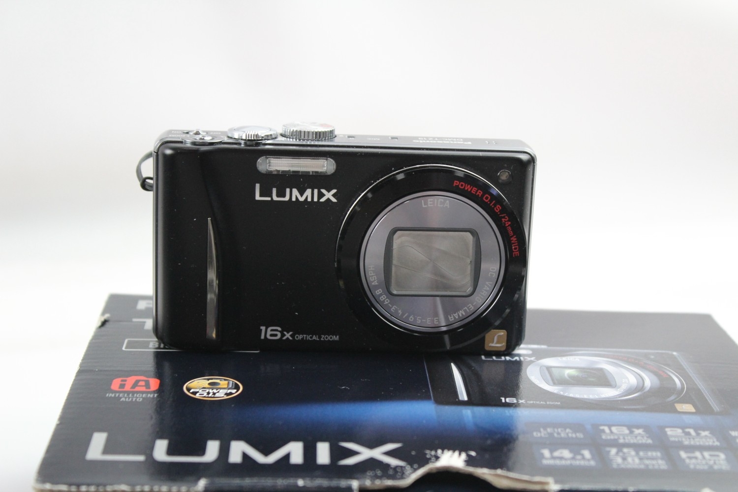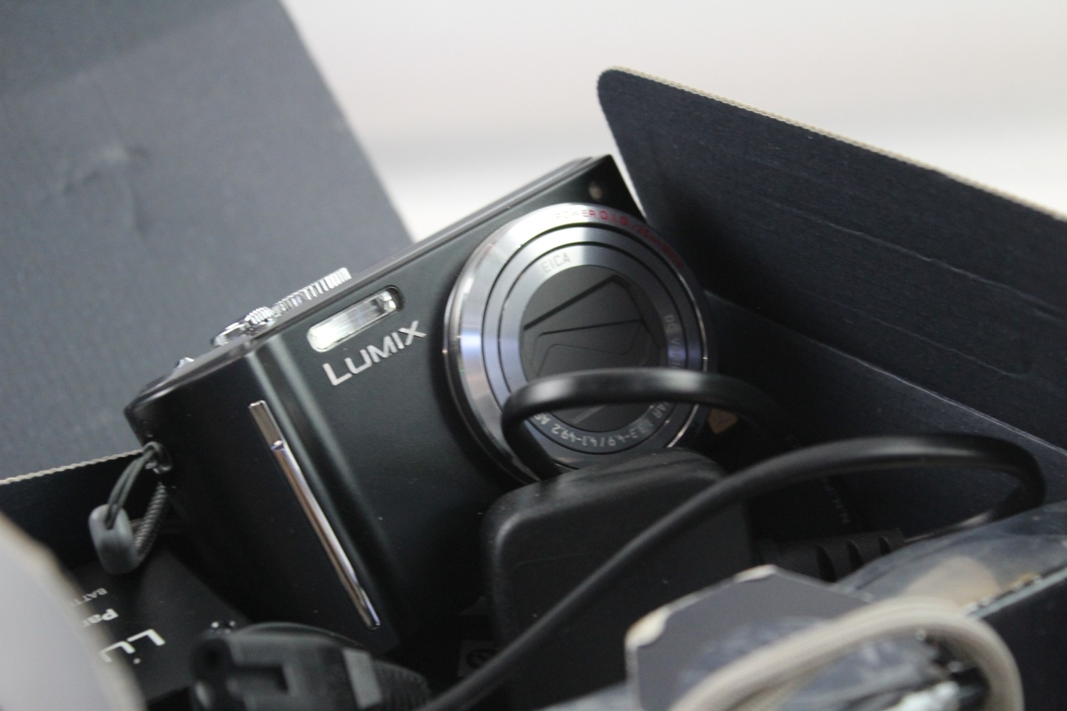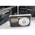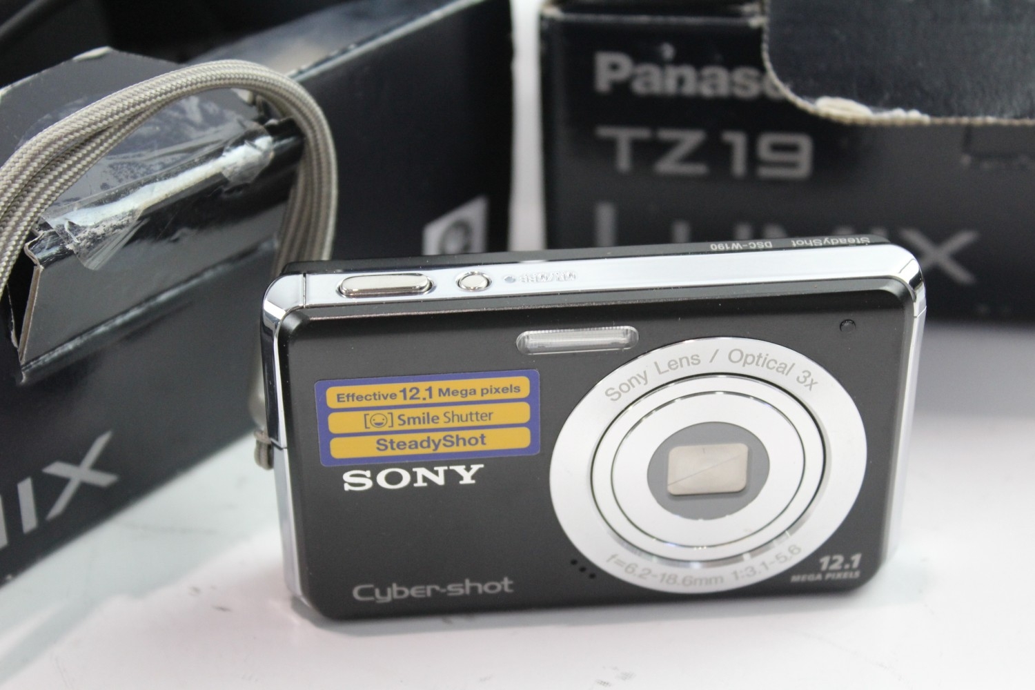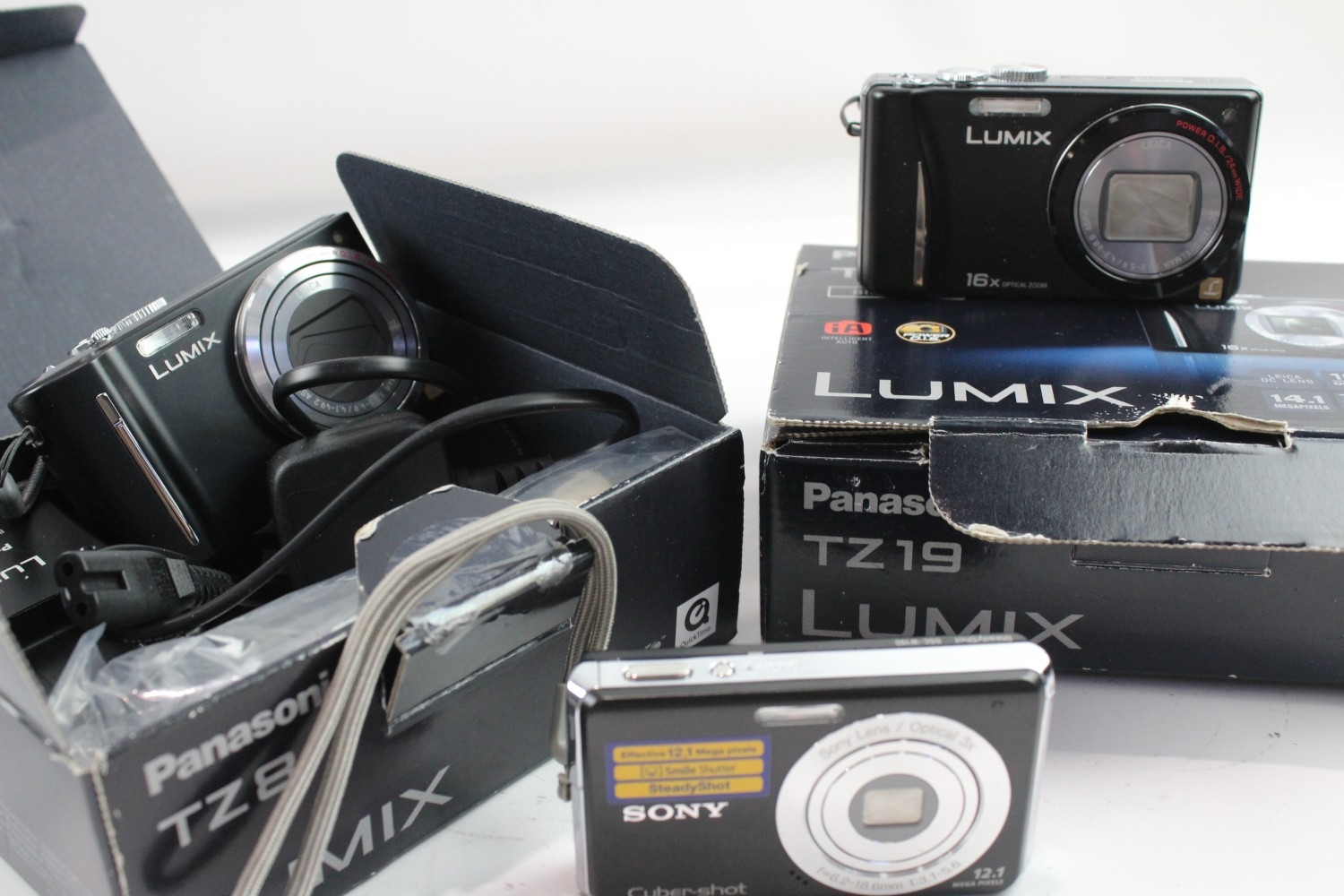 Three compact digital cameras, one boxed Panasonic Lumix DMC-TZ19 14.1mp with charger, cables, software disc and instruction manual, one boxed Panasonic Lumix DMC-TZ8 12.1mp with charger, cables and software discs and one Sony Cyber-shot DSC-W190 12.1mp