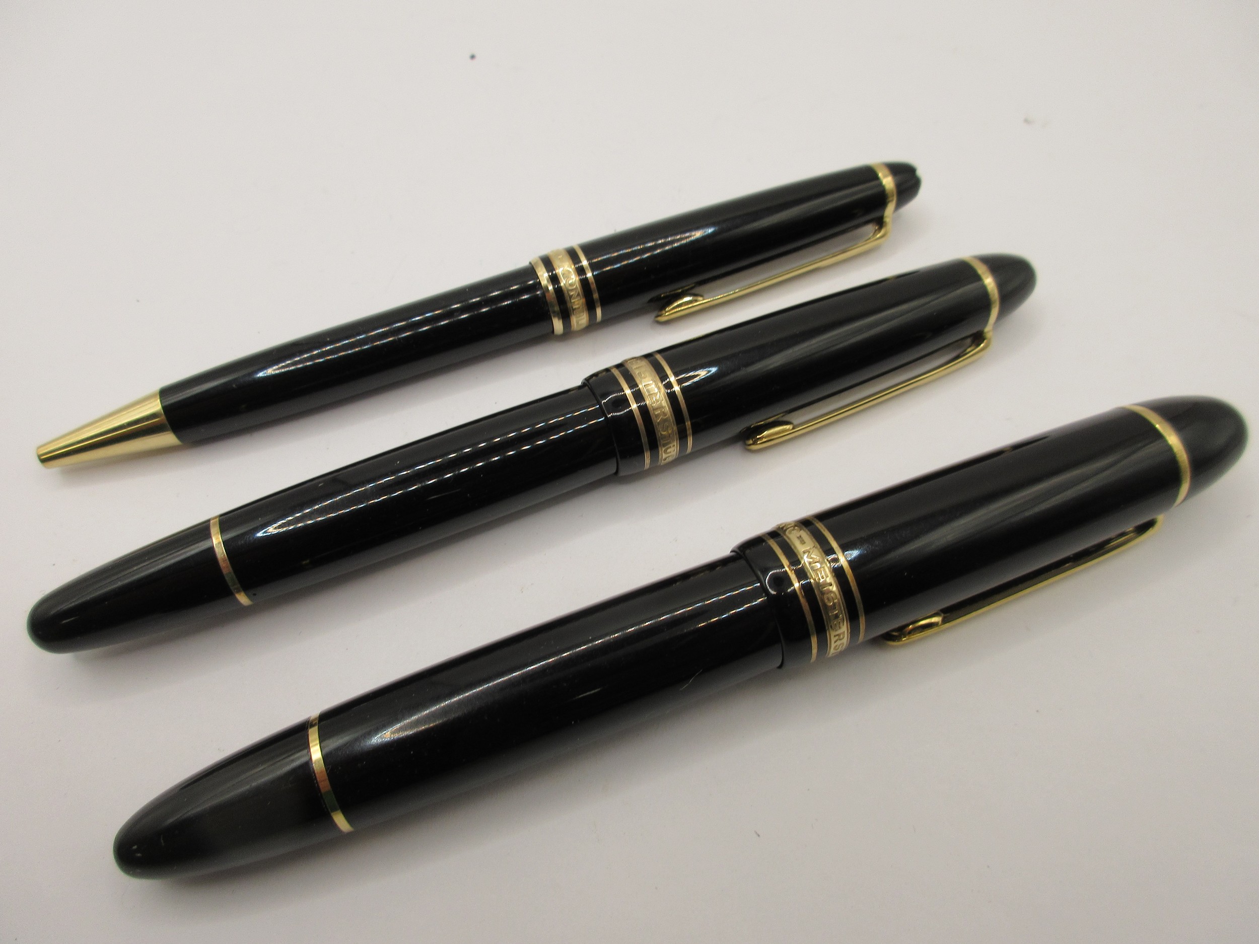 Three Montblanc Meisterstcuk pens - a No 149 fountain pen, black cap and barrel, nib marked 4810 18K 750. A Meisterstuck rollerball pen and a ballpoint pen . A/f none tested, apparent signs of light to moderate use, visually good condition. No case