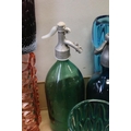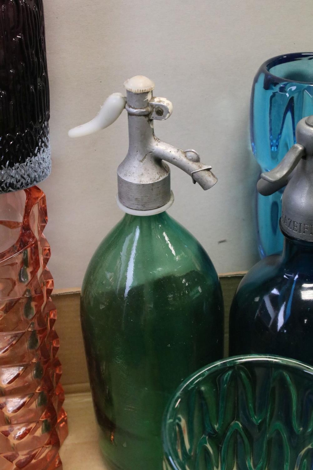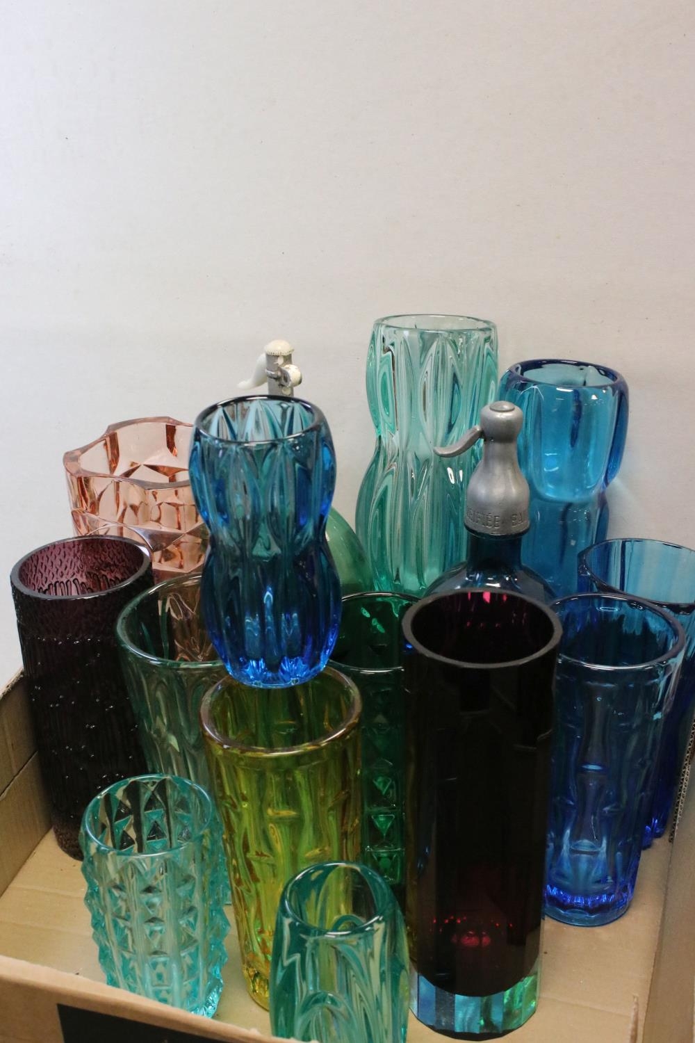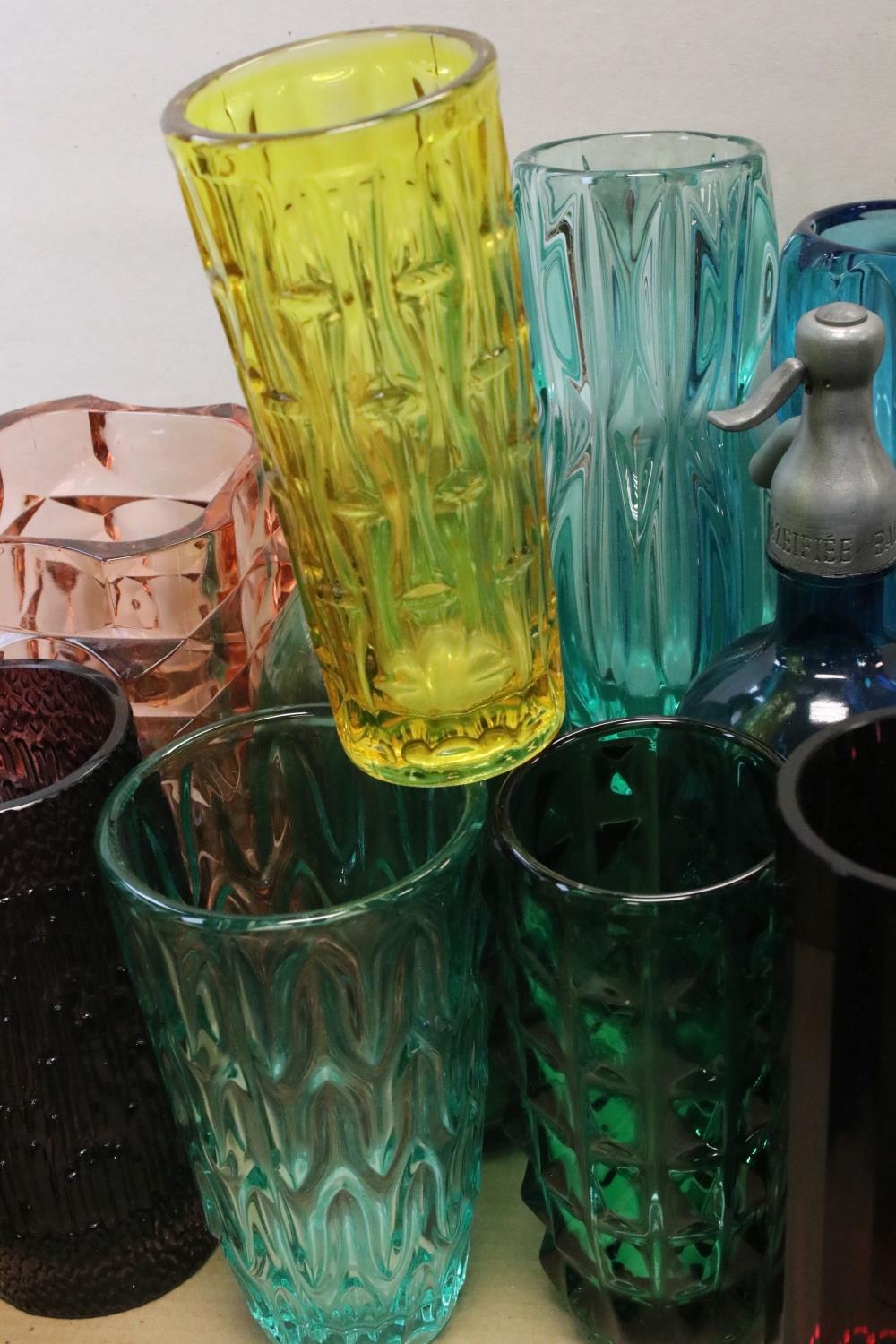 Collection of Mid 20th century Coloured Glass comprising Thirteen Vases including Wedgwood and a Faceted Red Glass Vase together with Advertising French Martin & Freres Blue Glass Soda Syphon and a Green Glass Soda Syphon