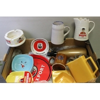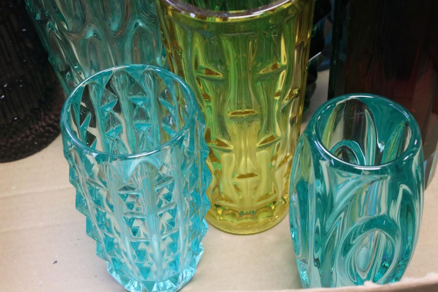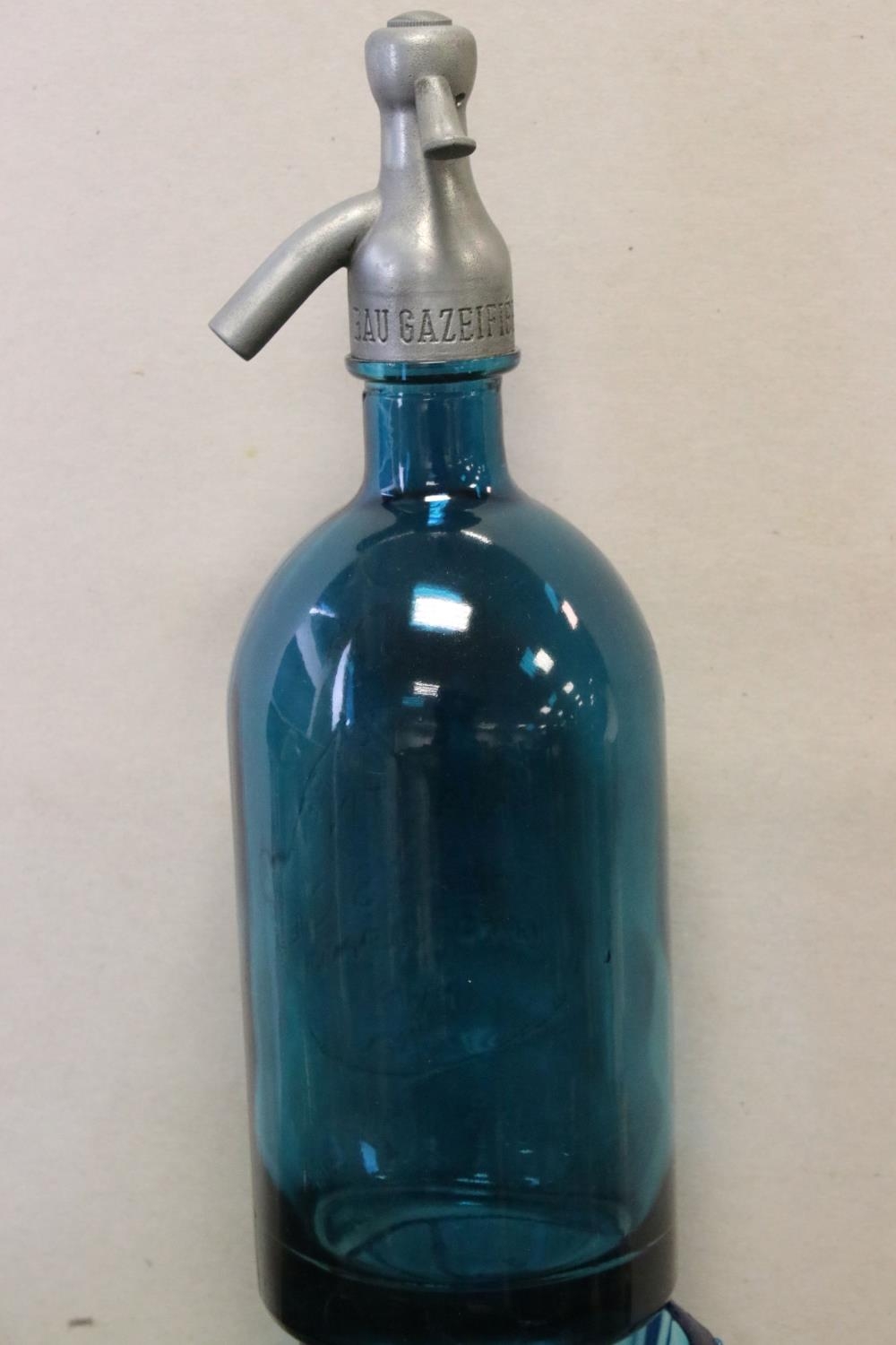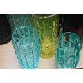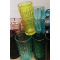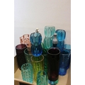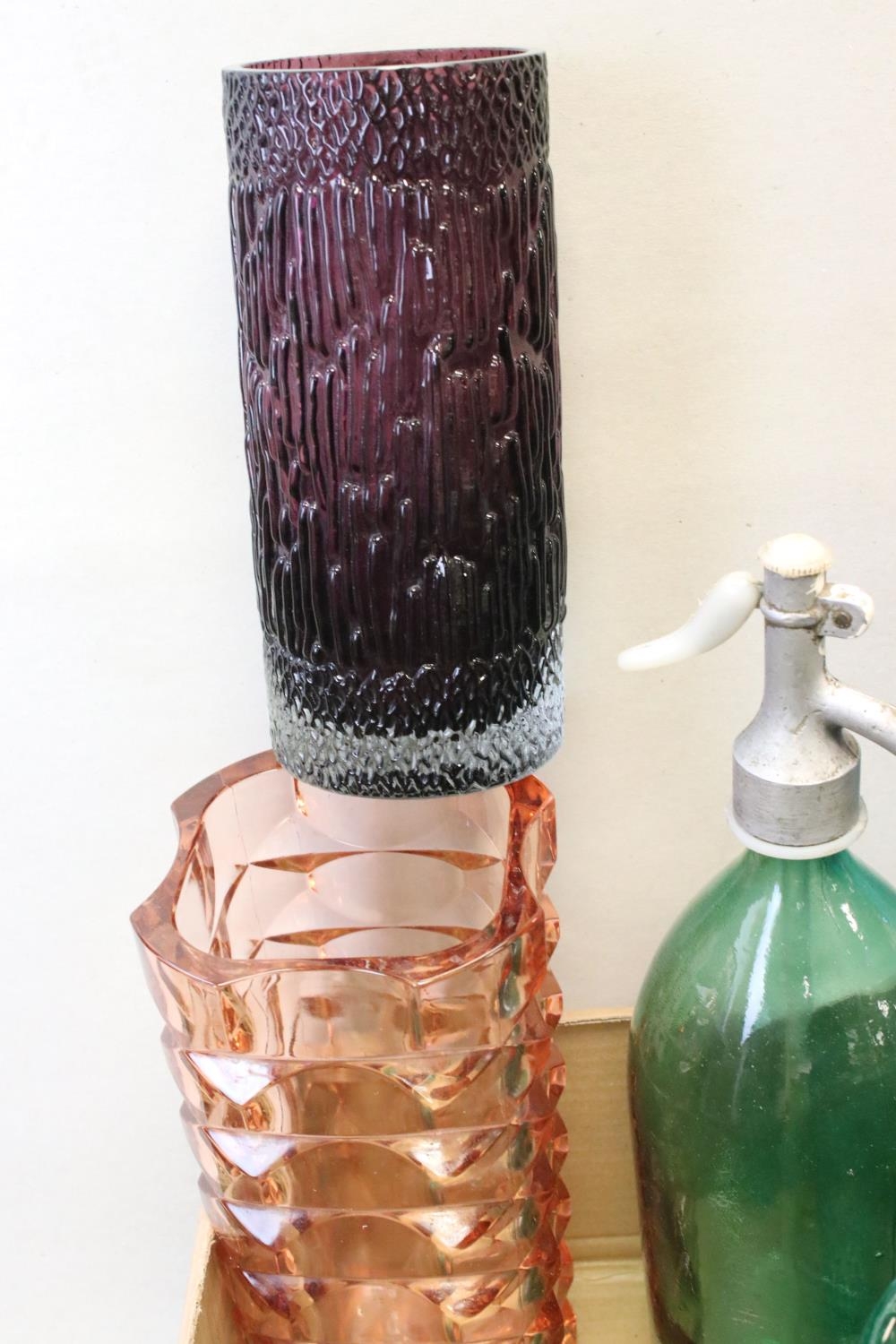 Collection of Mid 20th century Coloured Glass comprising Thirteen Vases including Wedgwood and a Faceted Red Glass Vase together with Advertising French Martin & Freres Blue Glass Soda Syphon and a Green Glass Soda Syphon