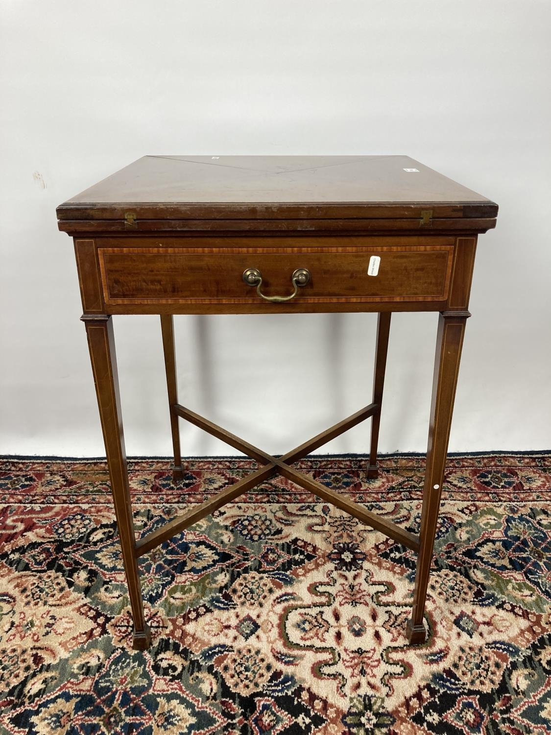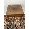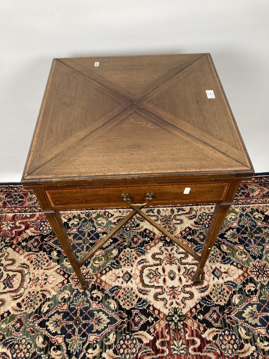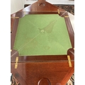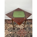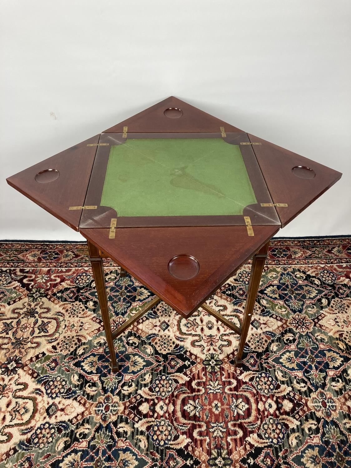 An Edwardian inlaid mahogany envelope card table with four section top, green baize top, X-frame stretcher and square tapering supports