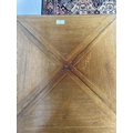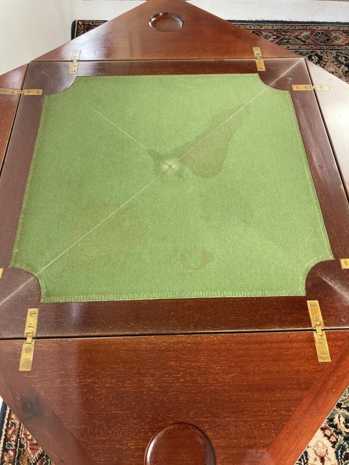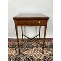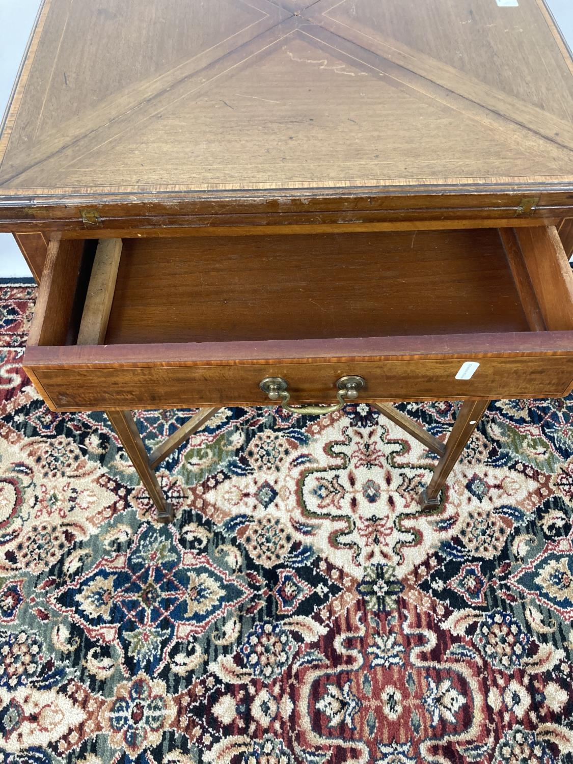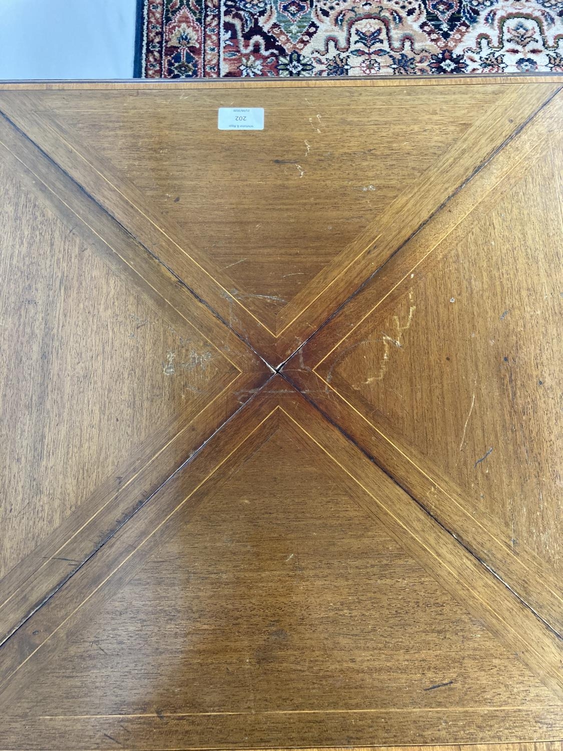 An Edwardian inlaid mahogany envelope card table with four section top, green baize top, X-frame stretcher and square tapering supports