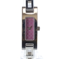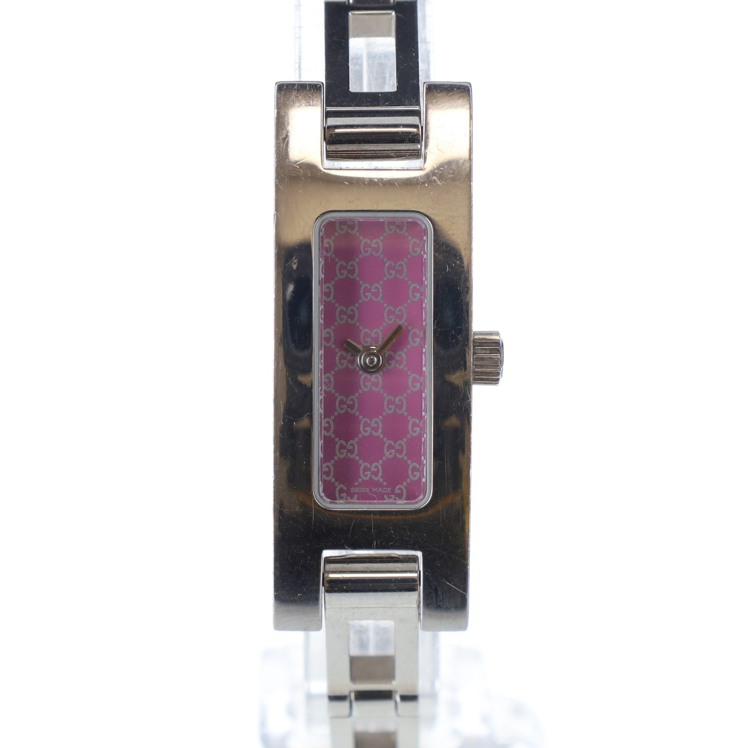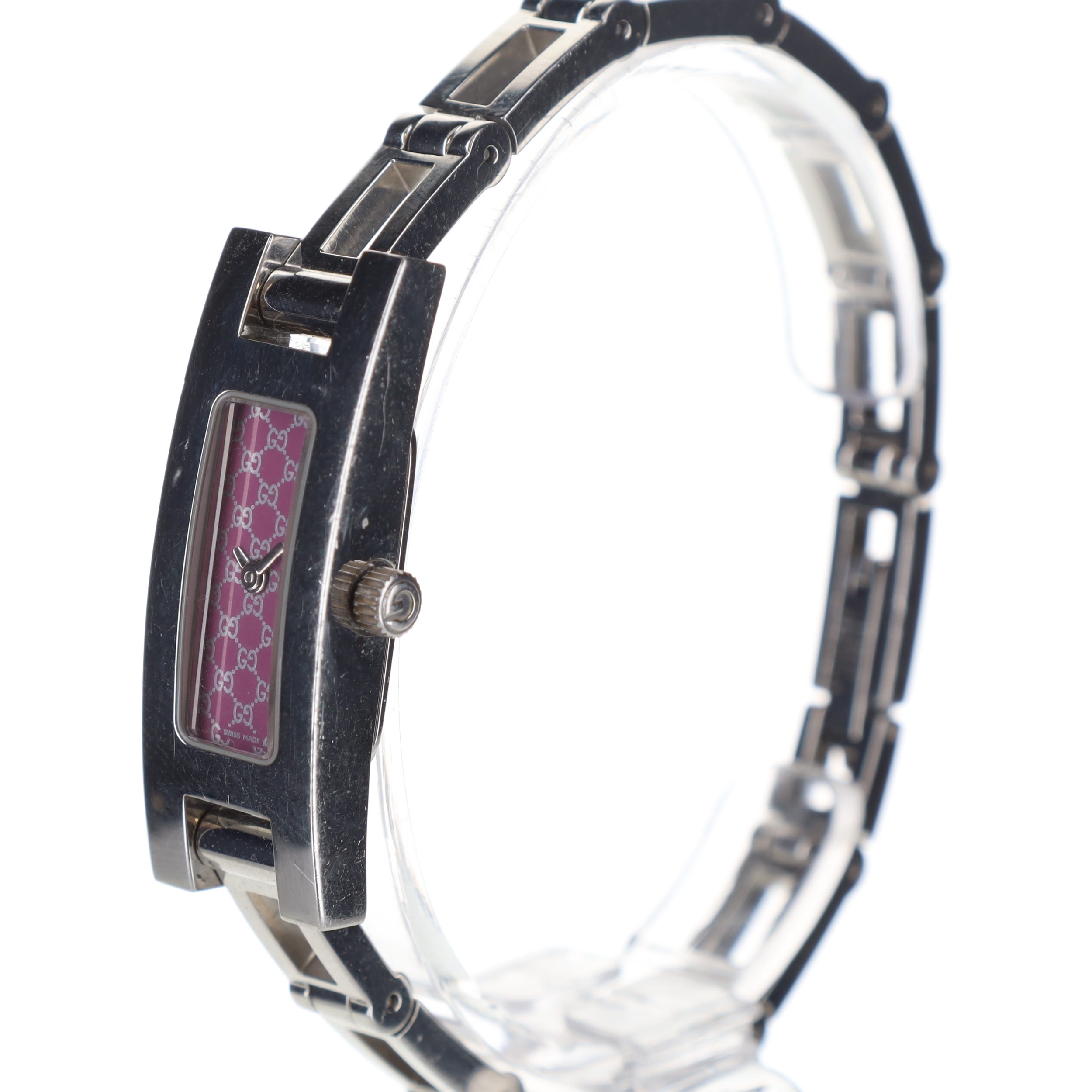 Gucci - Stainless Steel Quartz Watch. ETA Cal. 280.002 5 jewel quartz movement. Case and bracelet made from stainless steel, some scratches. Glass crystal. Purple Gucci repeating logo dial with silver hands.