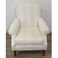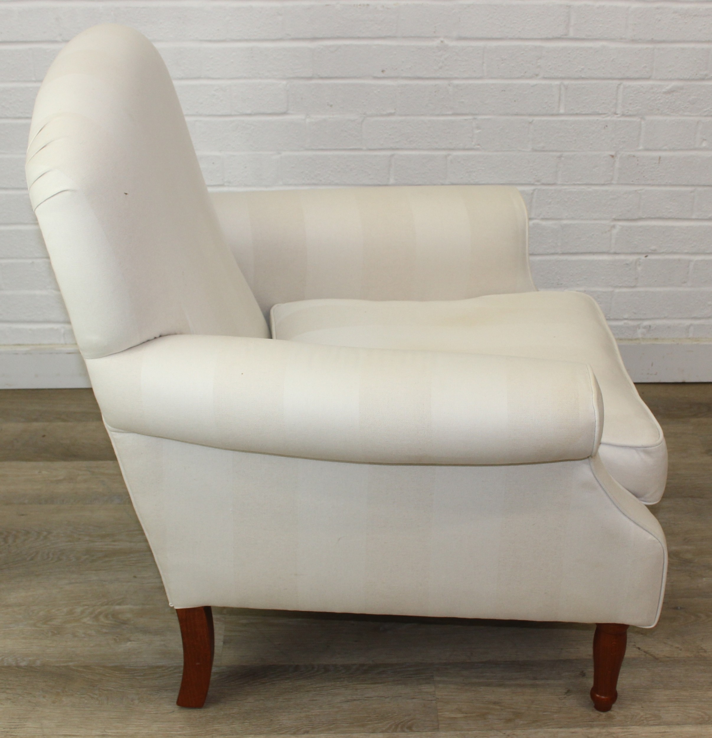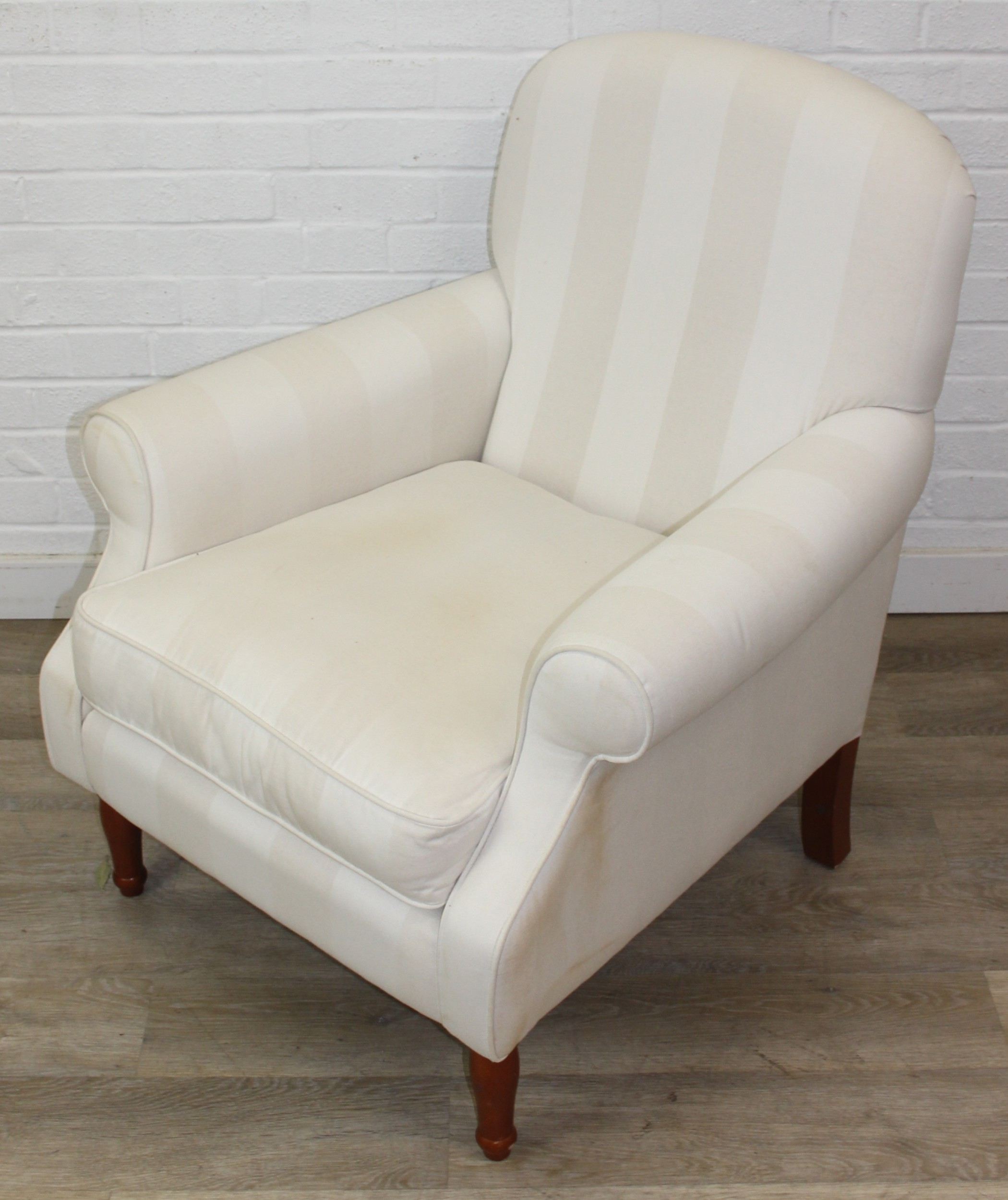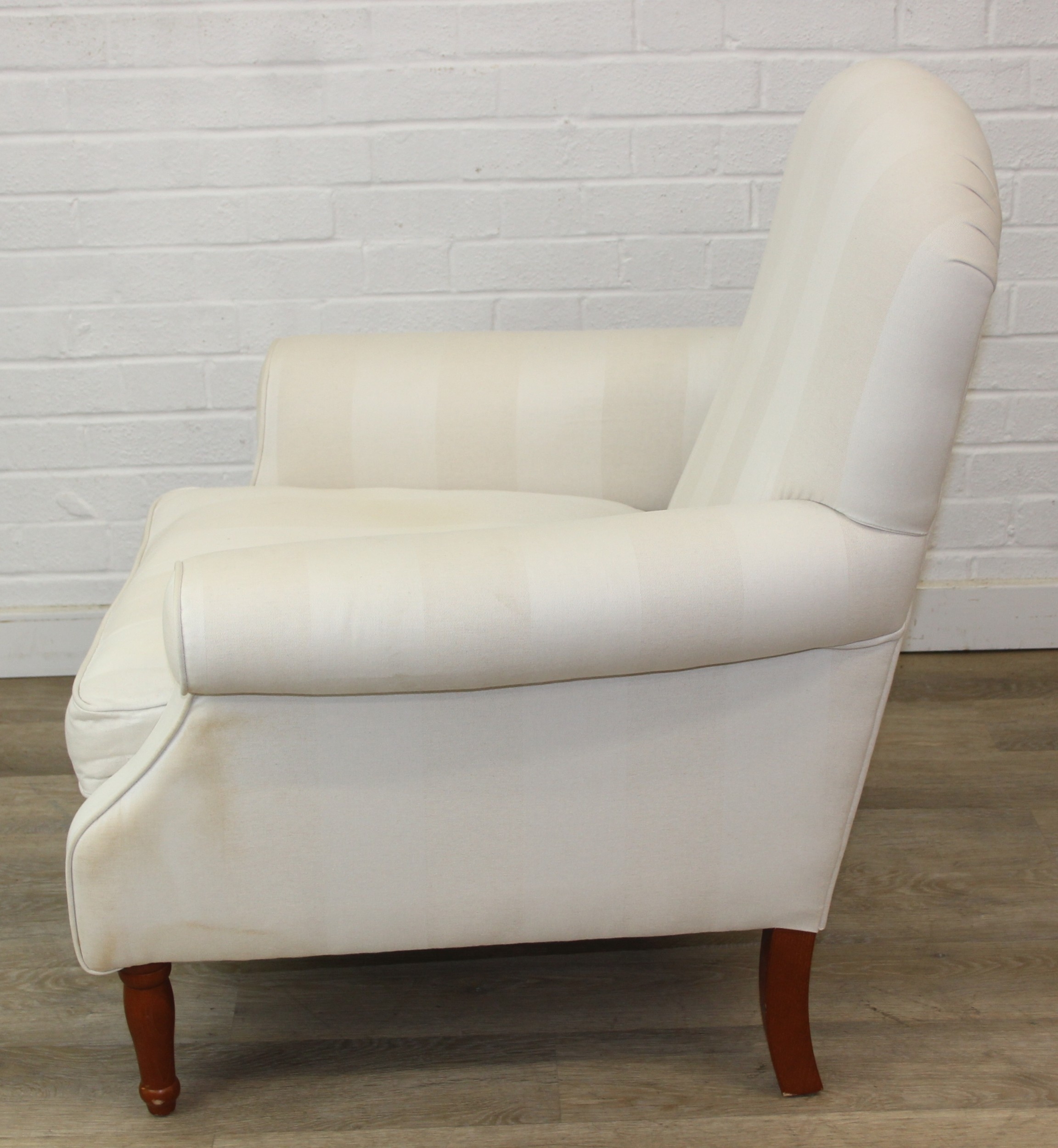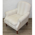 An antique style white and cream striped Victorian style armchair with turned wooden legs, 83cm wide x 88cm tall