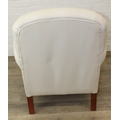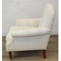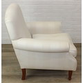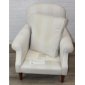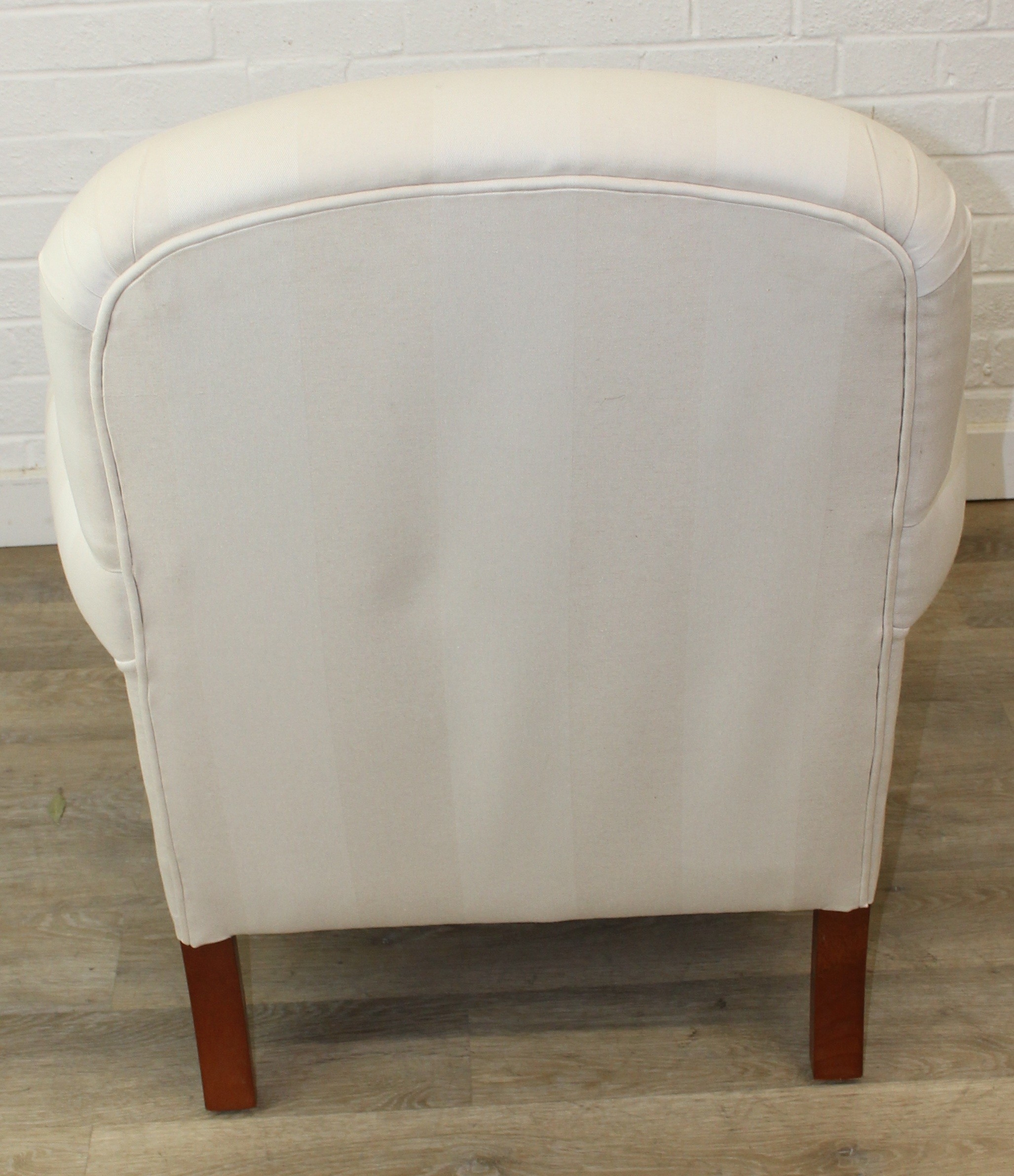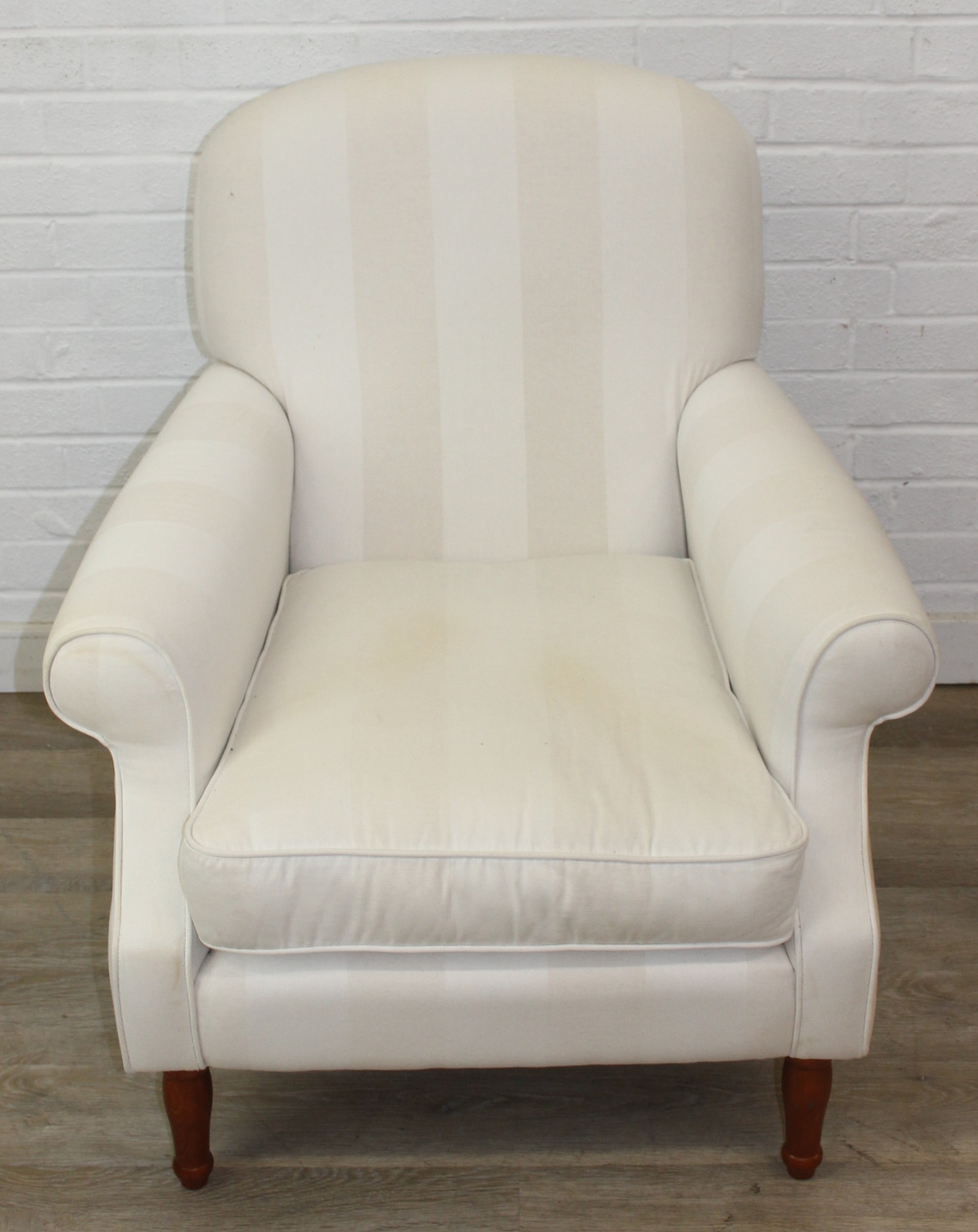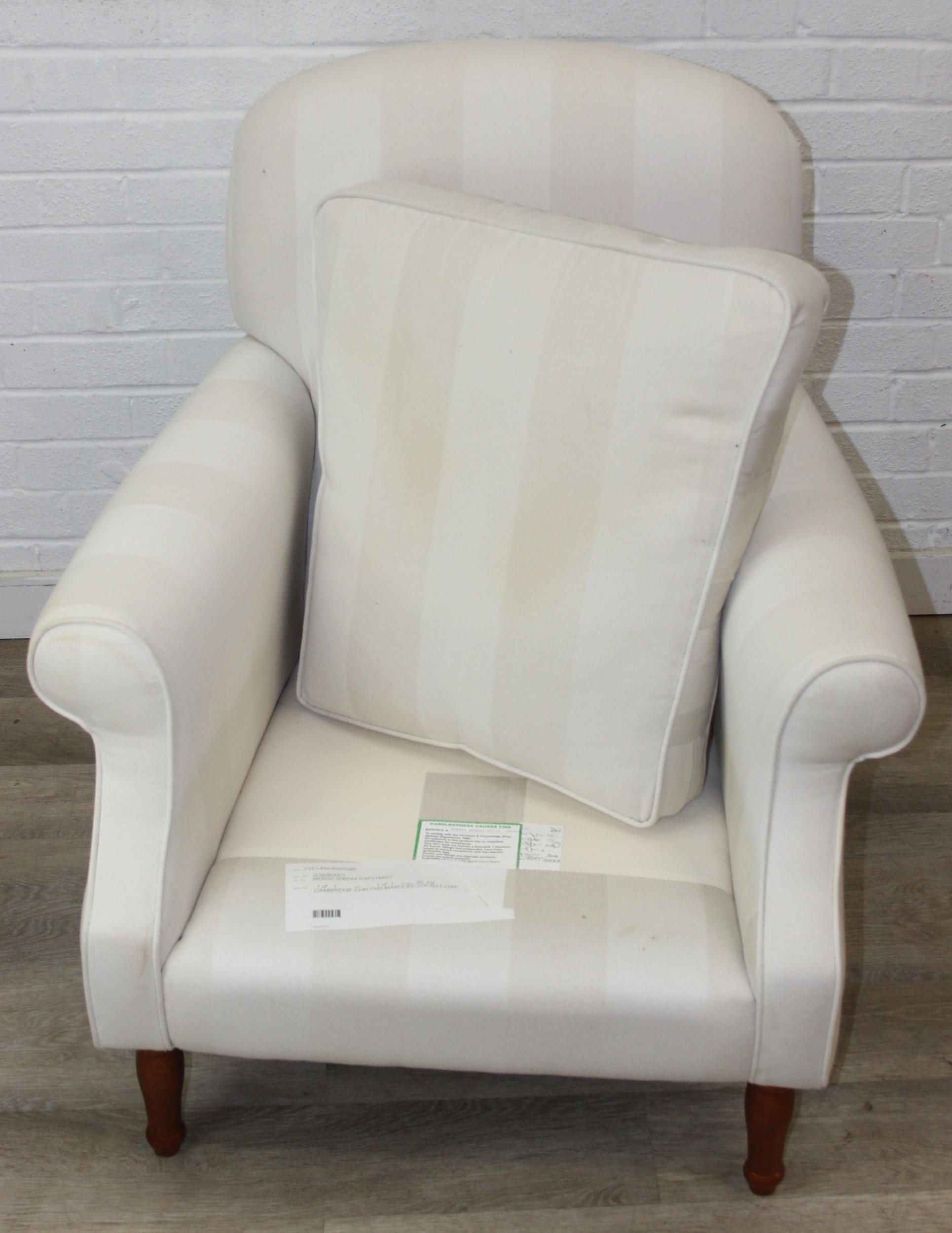 An antique style white and cream striped Victorian style armchair with turned wooden legs, 83cm wide x 88cm tall
