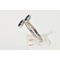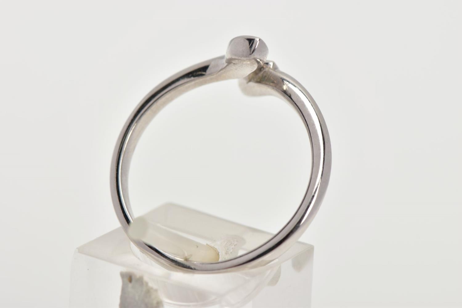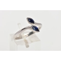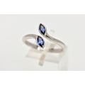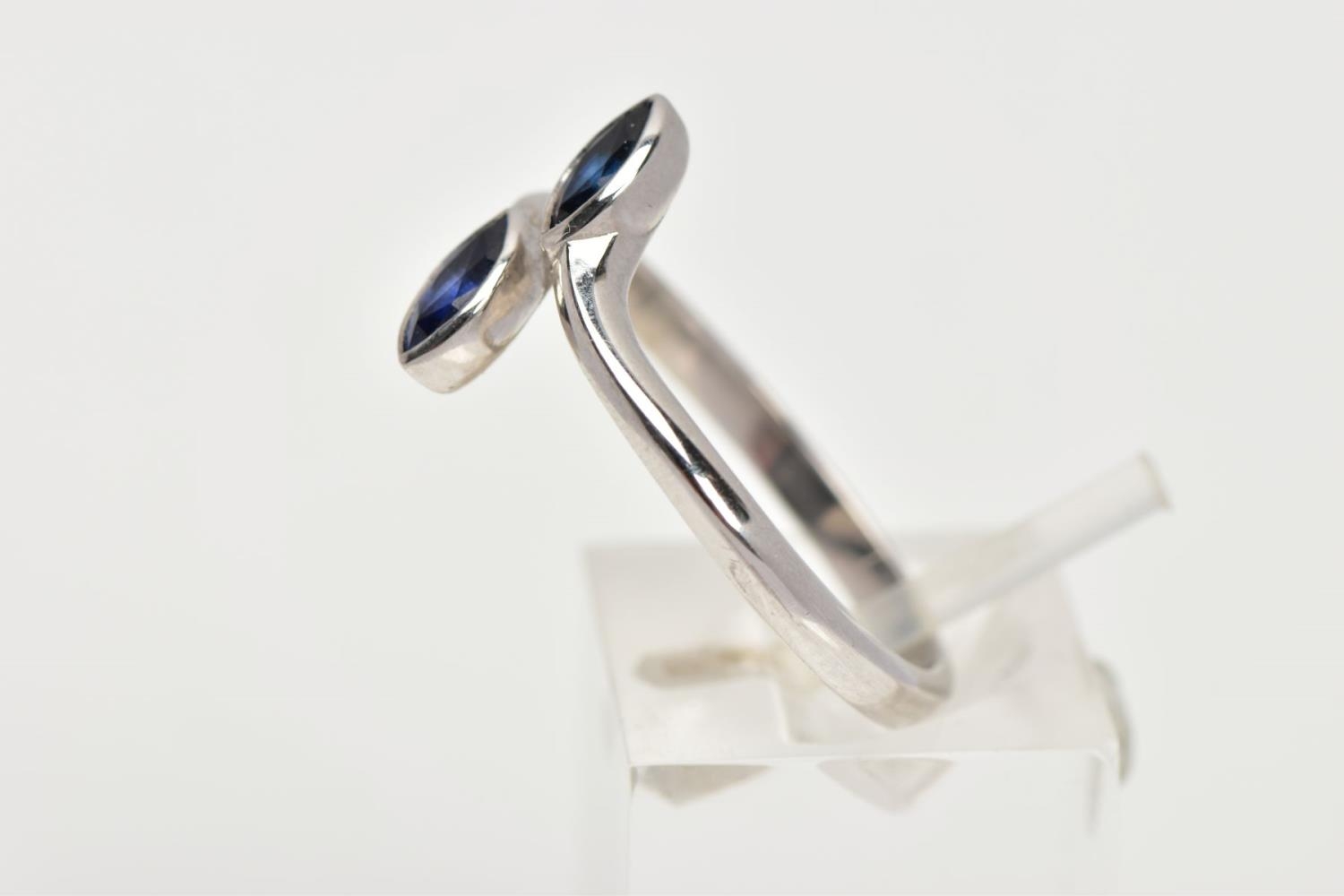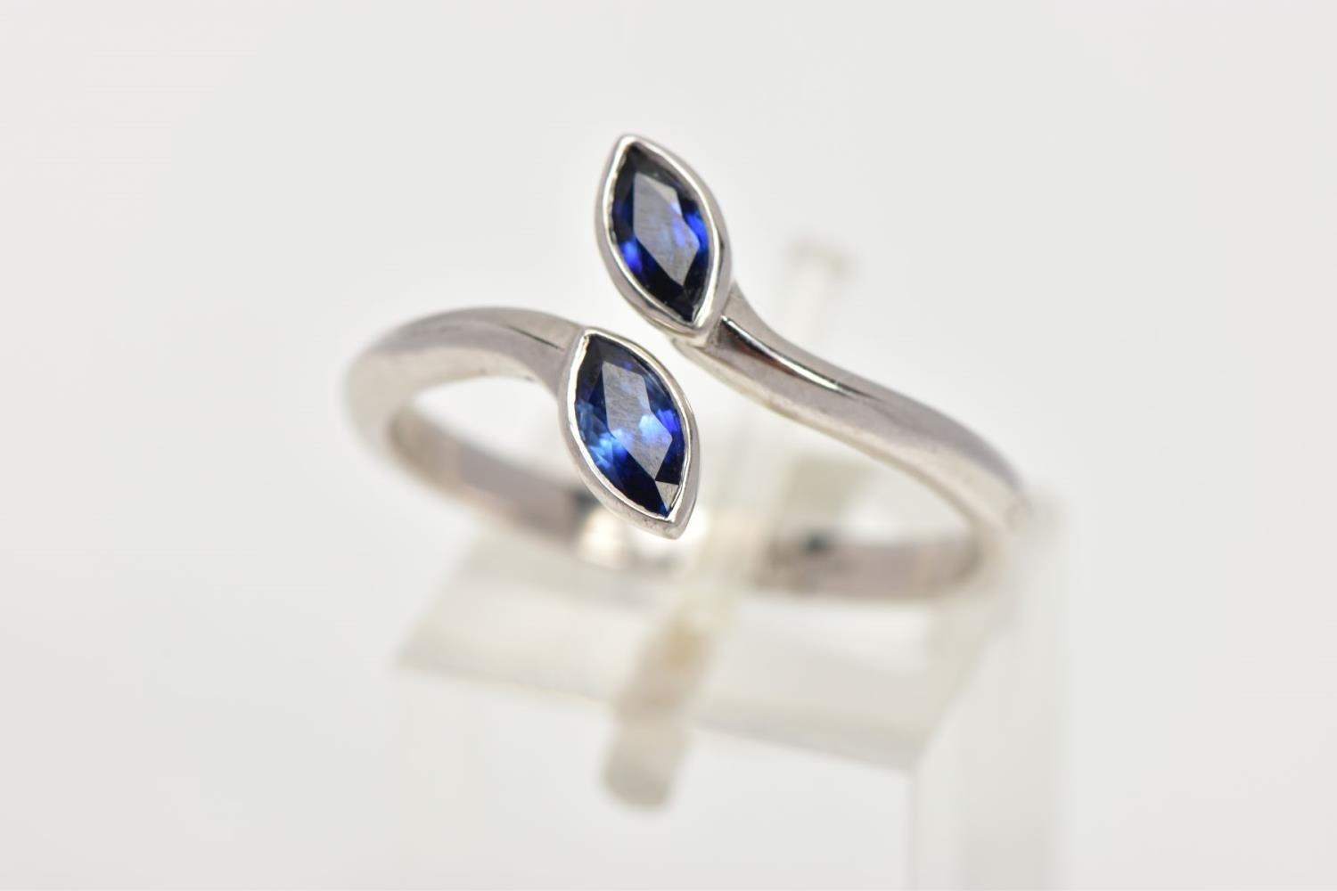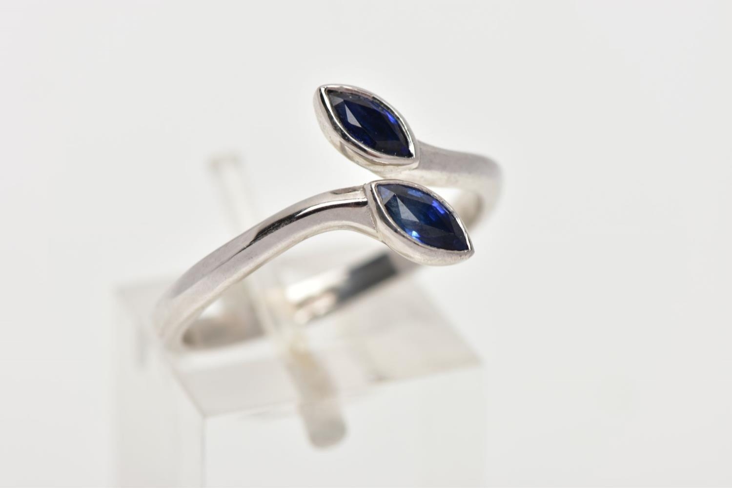 AN 18CT WHITE GOLD SAPPHIRE RING, of a cross over design, set with two marquise cut blue sapphires at each terminal, to a plain polished band, hallmarked 18ct gold Birmingham, ring size R 1/2, approximate gross weight 4.3 grams (condition report: general light wear, stones in good condition, overall condition good)
