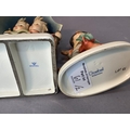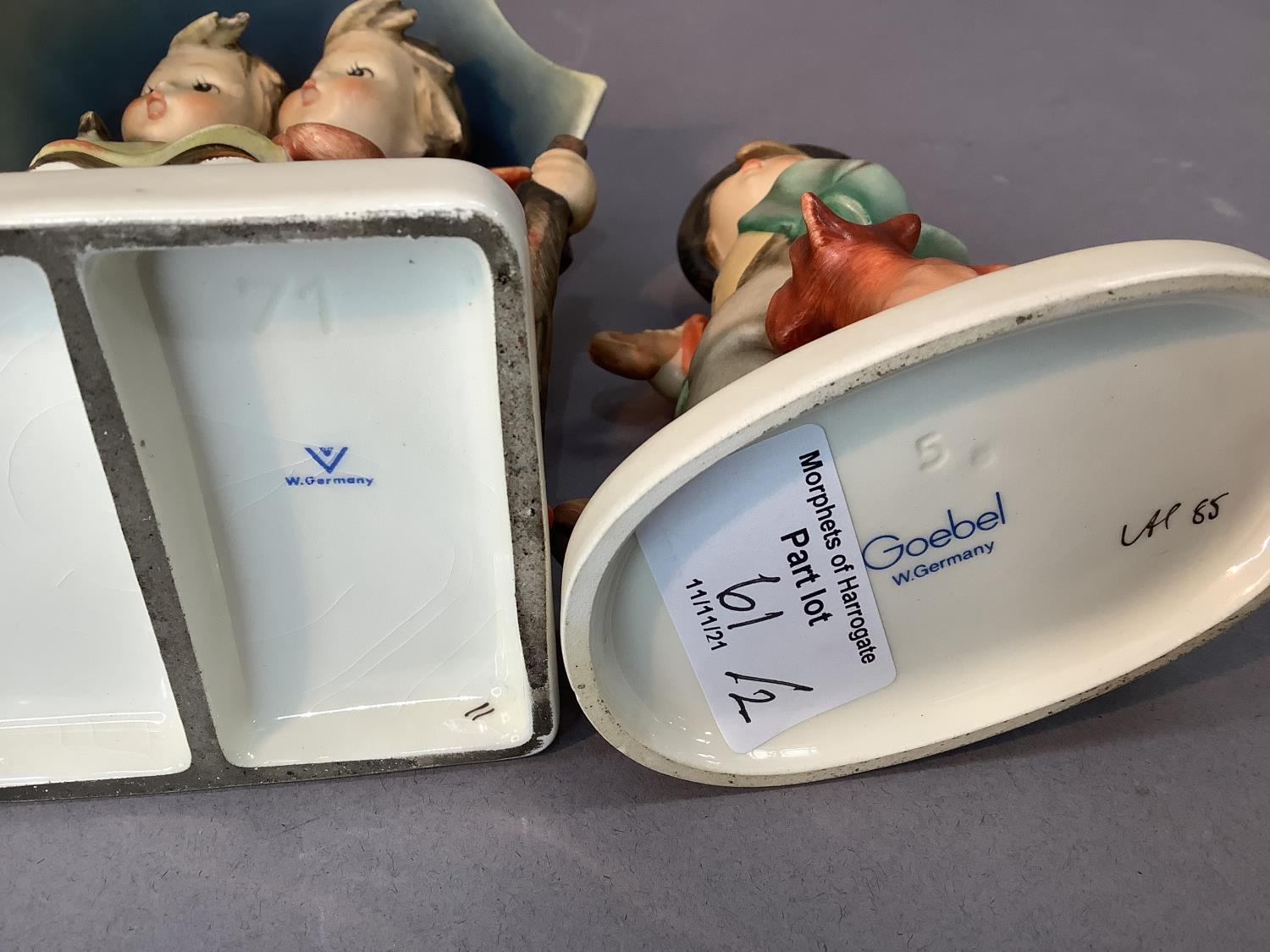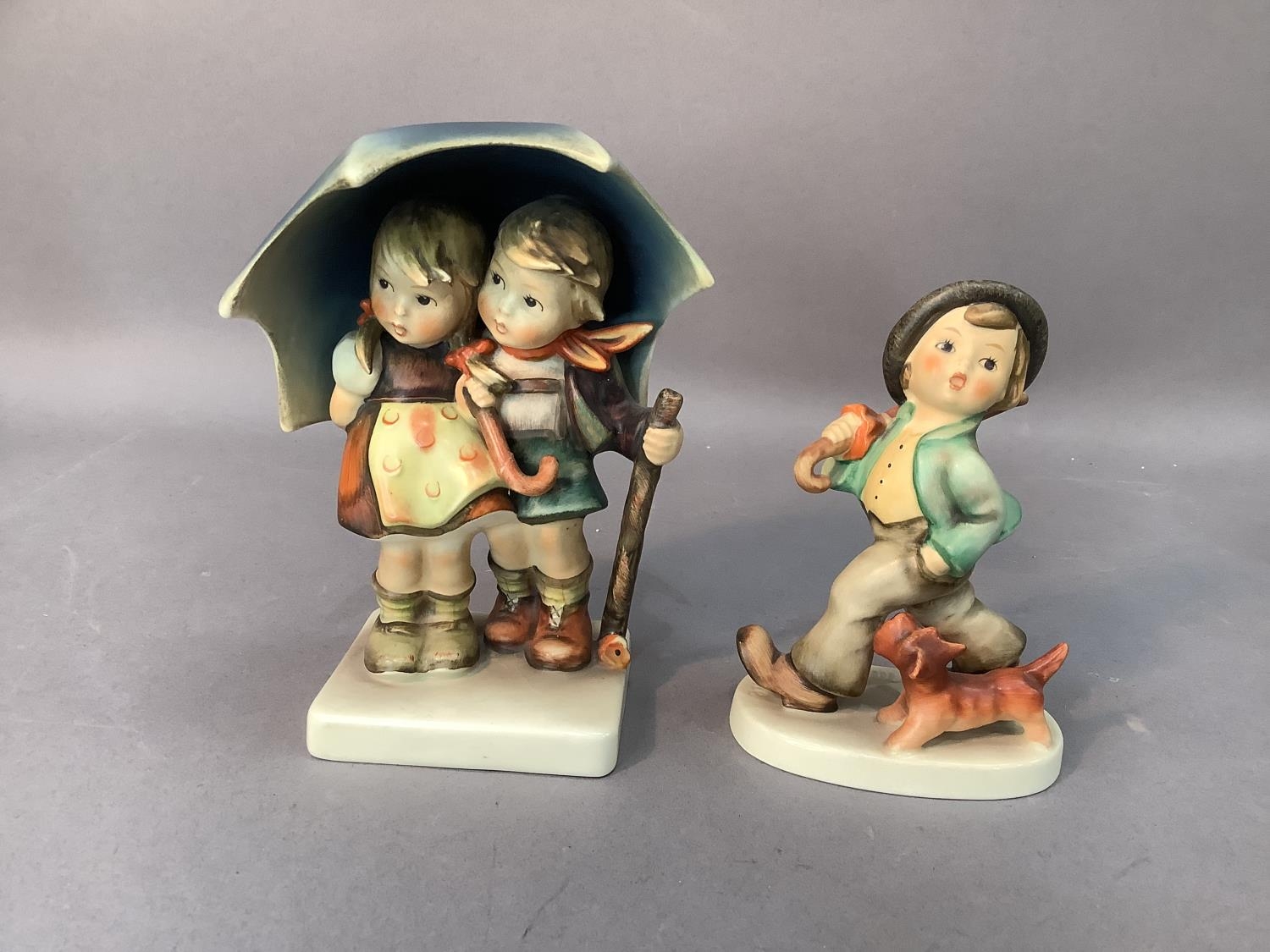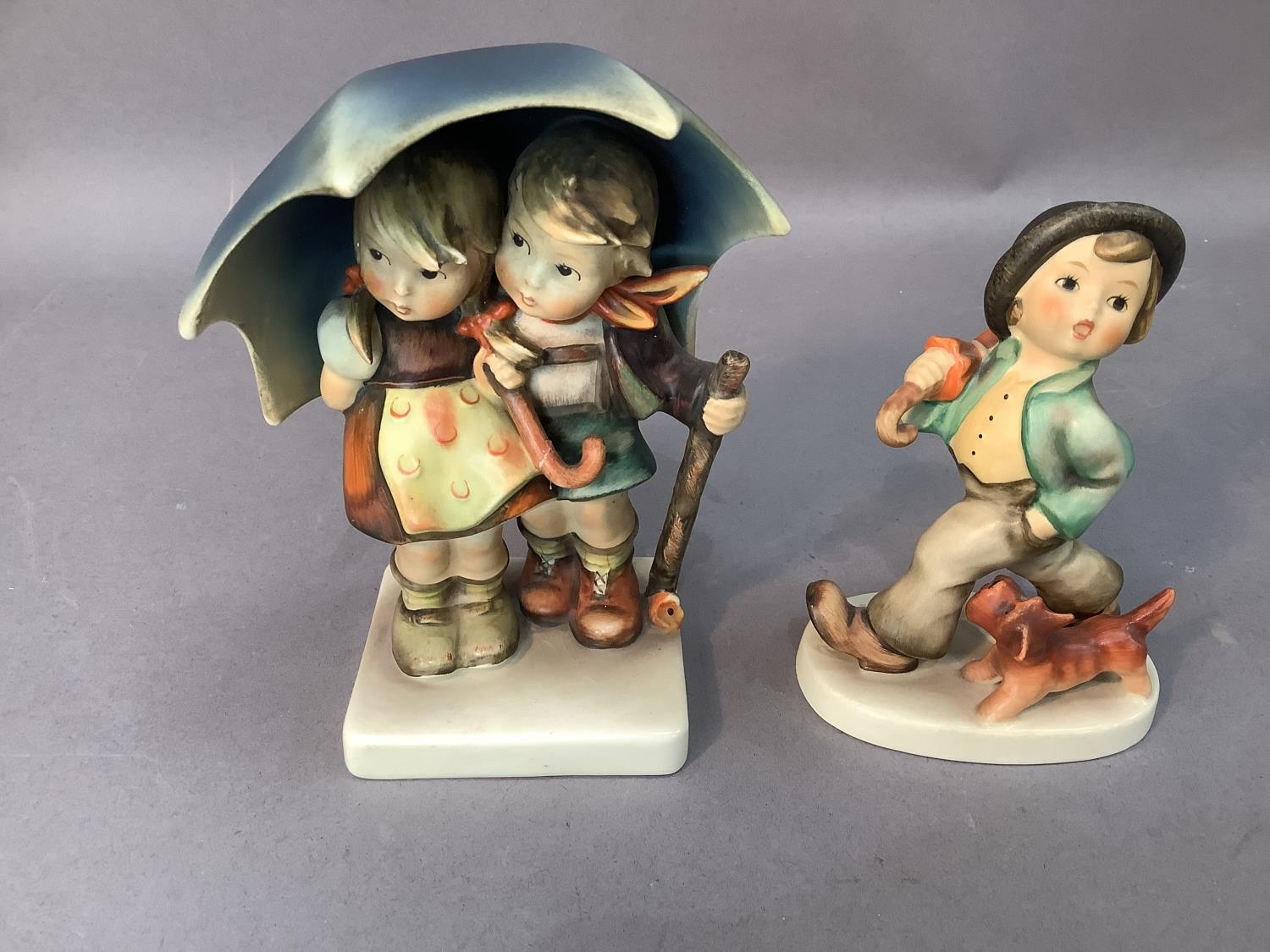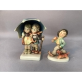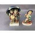A Hummel figure of boy and girl sheltering under a large umbrella, 15cm high together with a smaller figure of boy and dog, 12.5cm