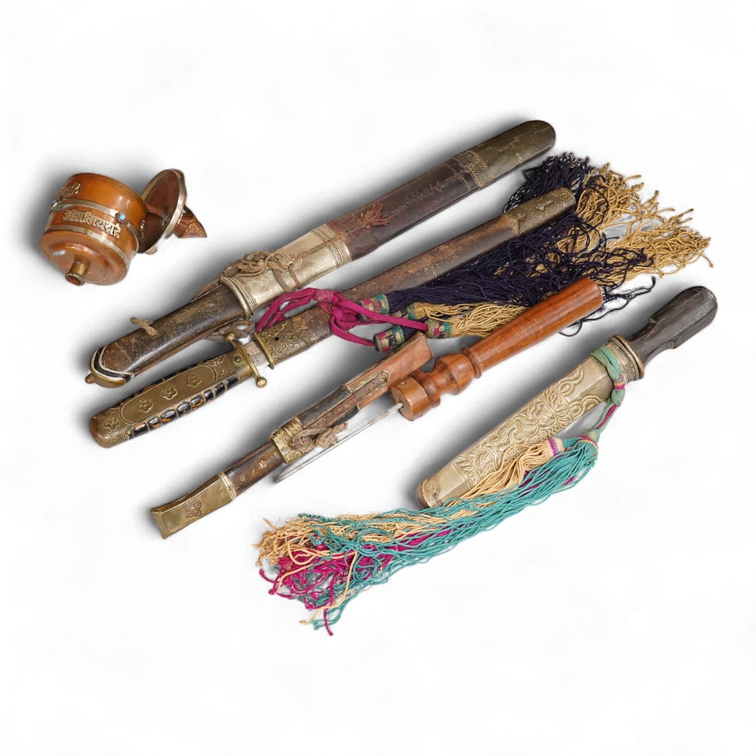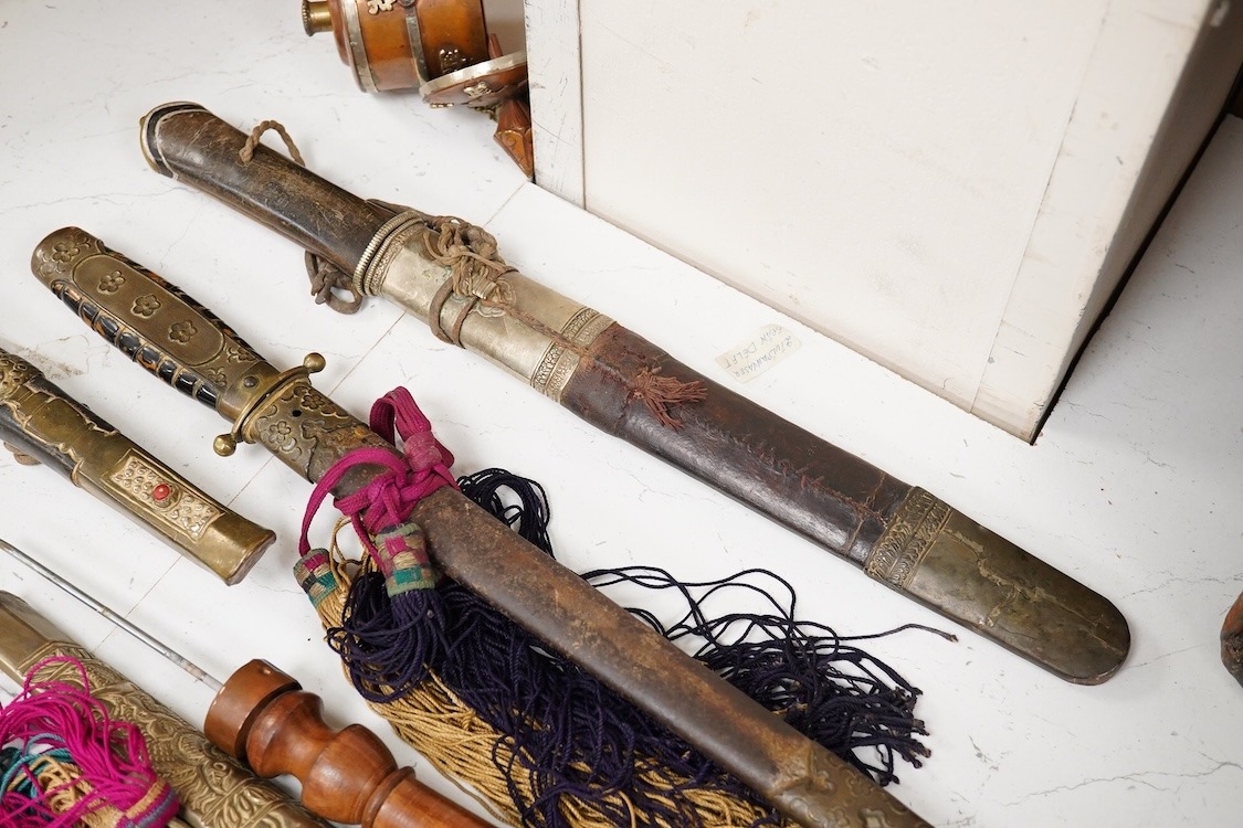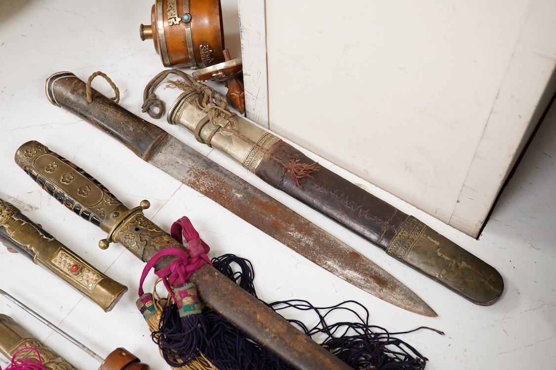 Four Tibetan daggers, early 20th century and a prayer wheel