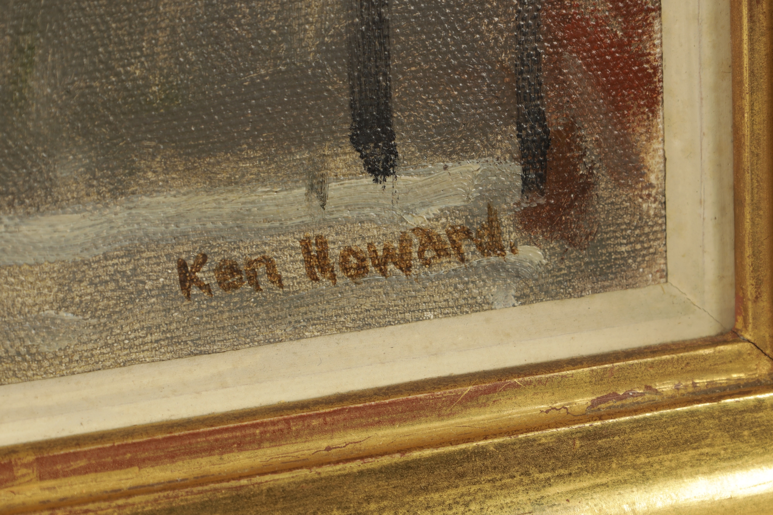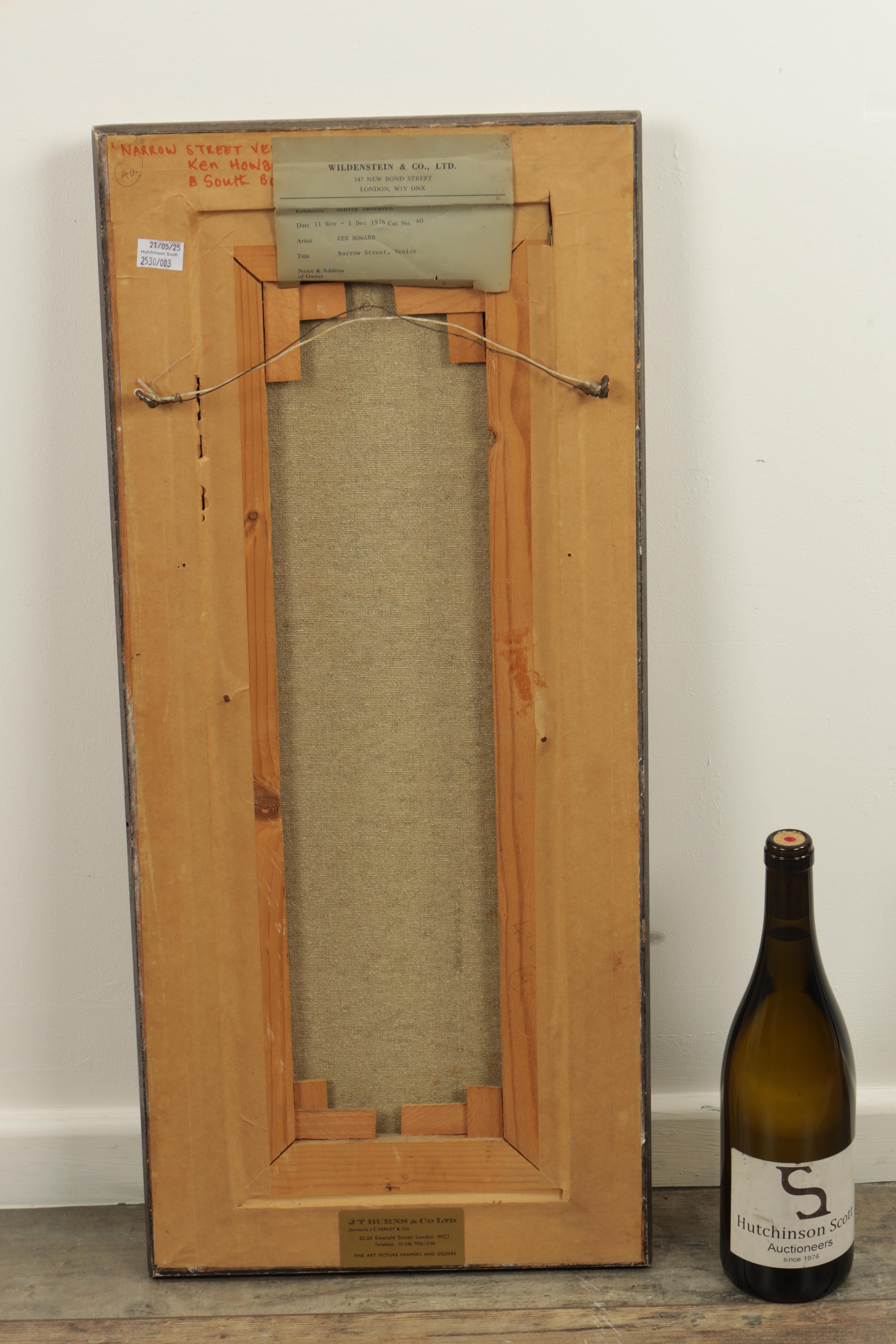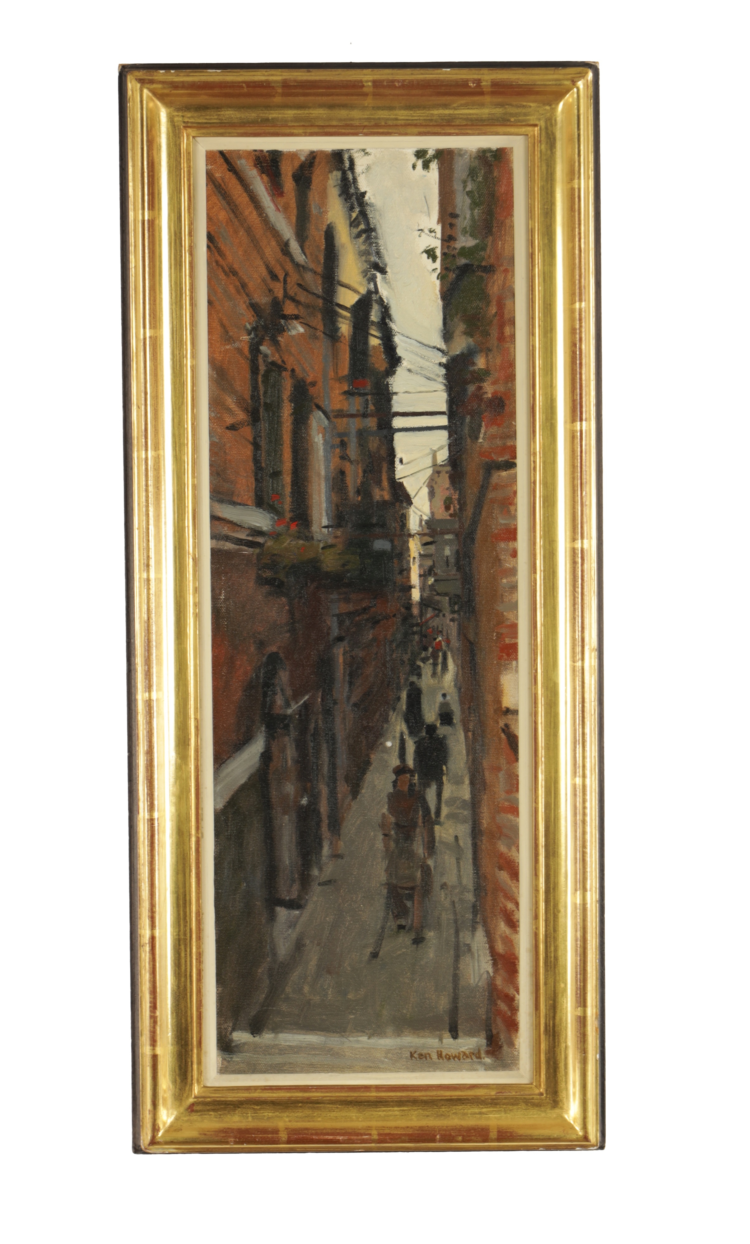 KEN HOWARD OBE (1932-2022). A 20TH CENTURY OIL ON CANVAS " NARROW STREET, VENICE" bearing exhibition label on reverse for Wildenstein & Co. Ltd. label dated 1976, Cat no. 40 - signed, mounted in gilt moulded frame (60cm high 20cm wide )
