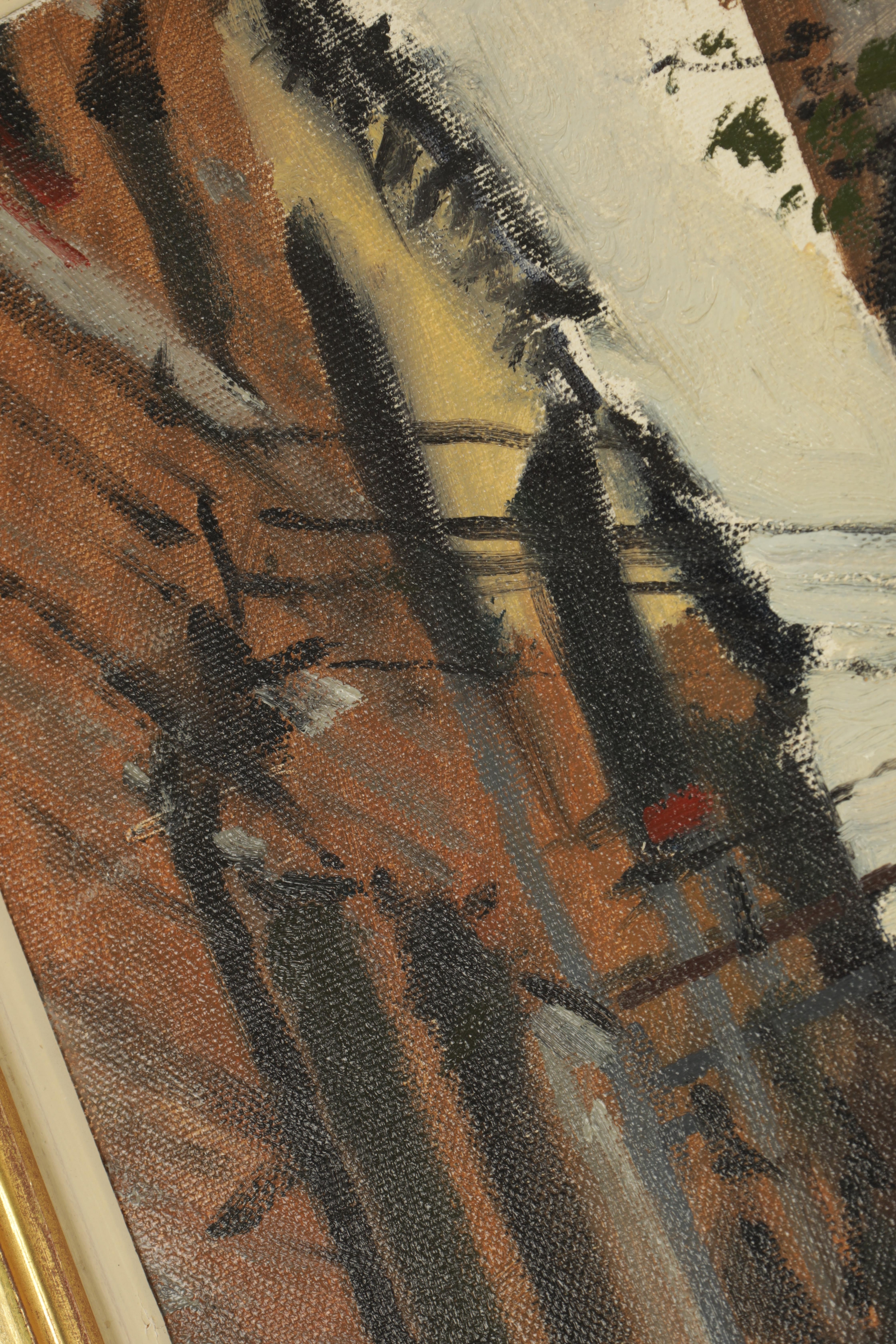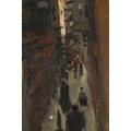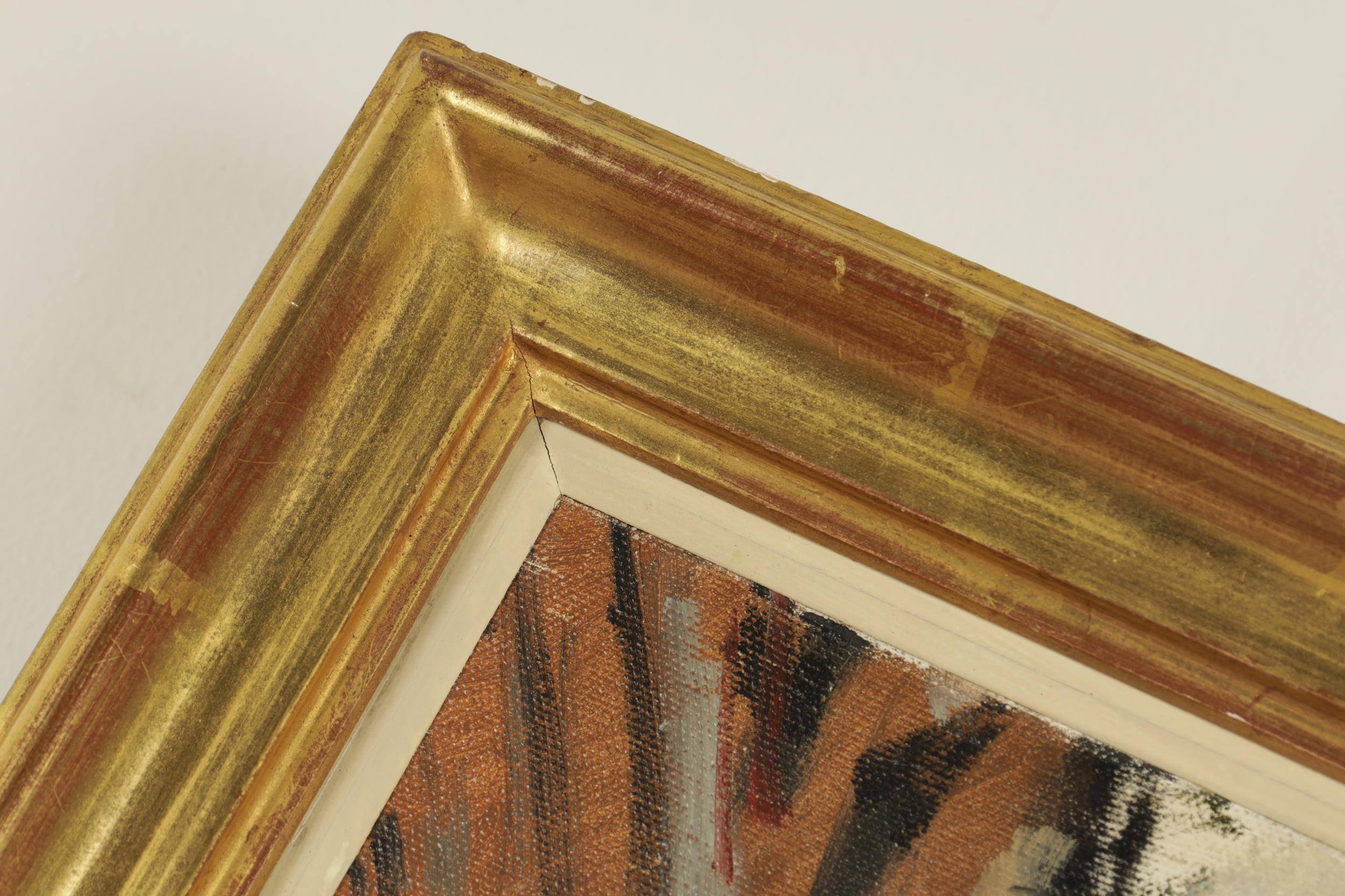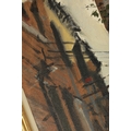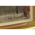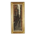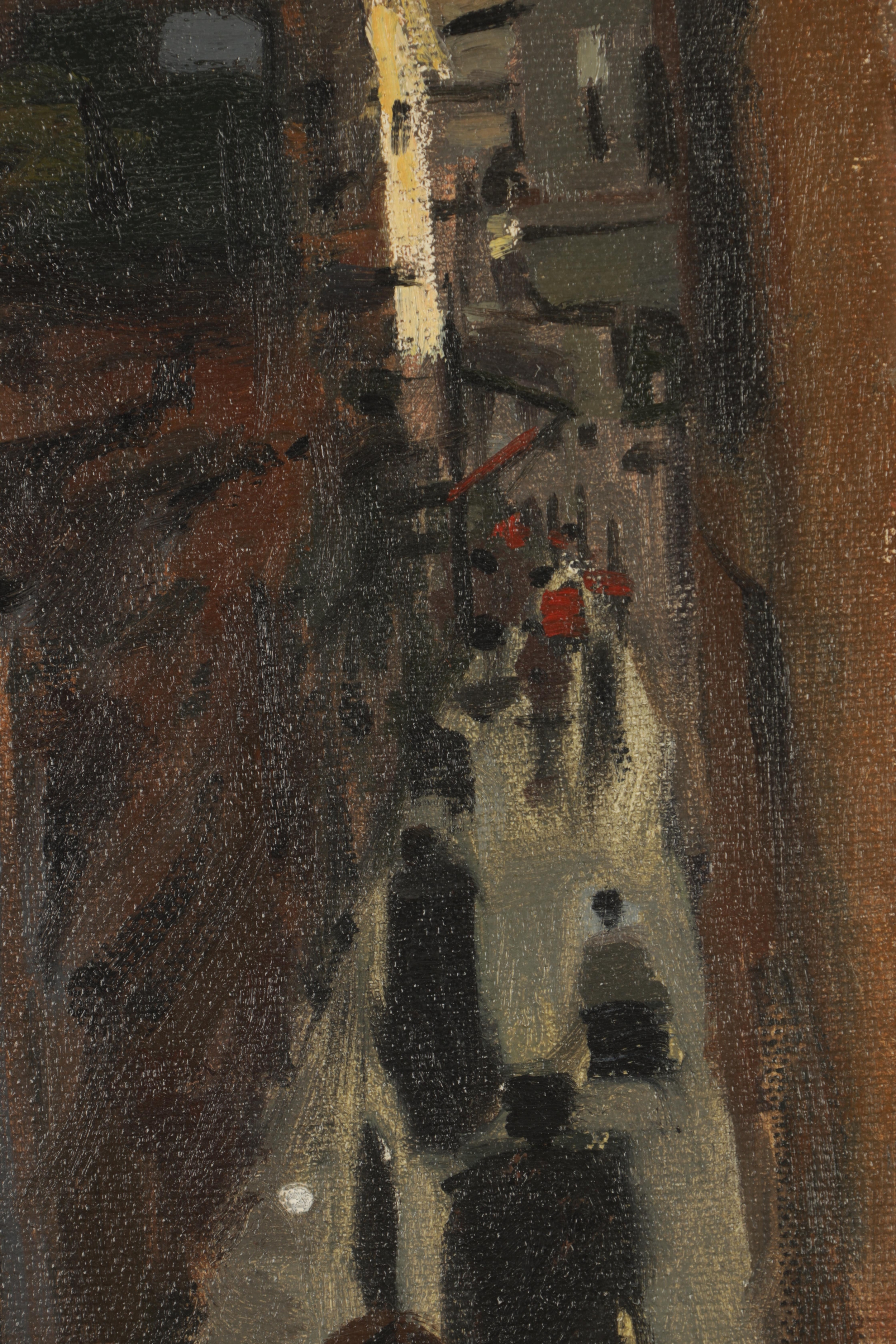 KEN HOWARD OBE (1932-2022). A 20TH CENTURY OIL ON CANVAS " NARROW STREET, VENICE" bearing exhibition label on reverse for Wildenstein & Co. Ltd. label dated 1976, Cat no. 40 - signed, mounted in gilt moulded frame (60cm high 20cm wide )