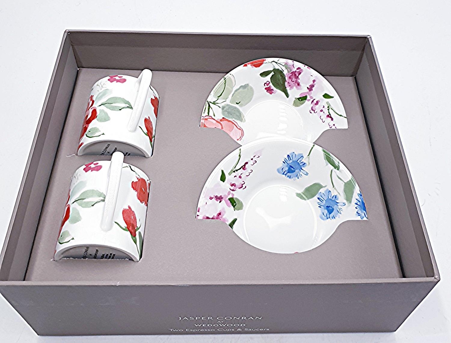 WEDGWOOD CHINA (Boxed Set Of Two) ESPRESSO CUPS & SAUCERS IN A FLORAL DESIGN By Designer Mr Jasper Conran