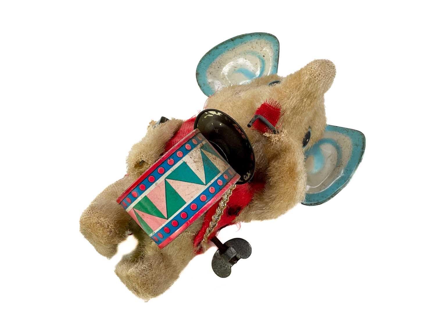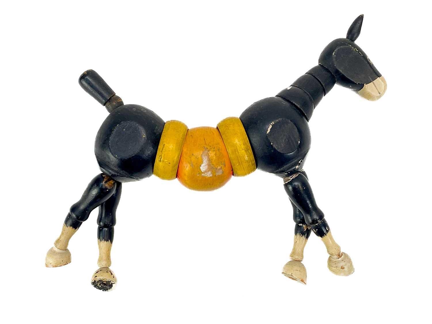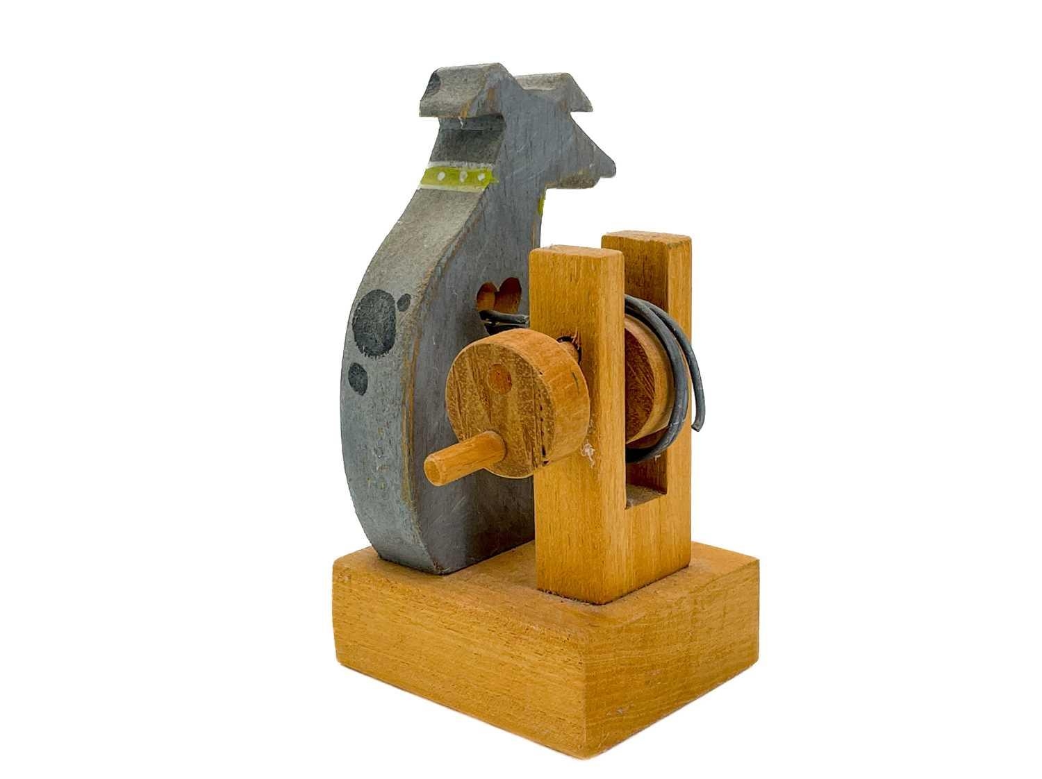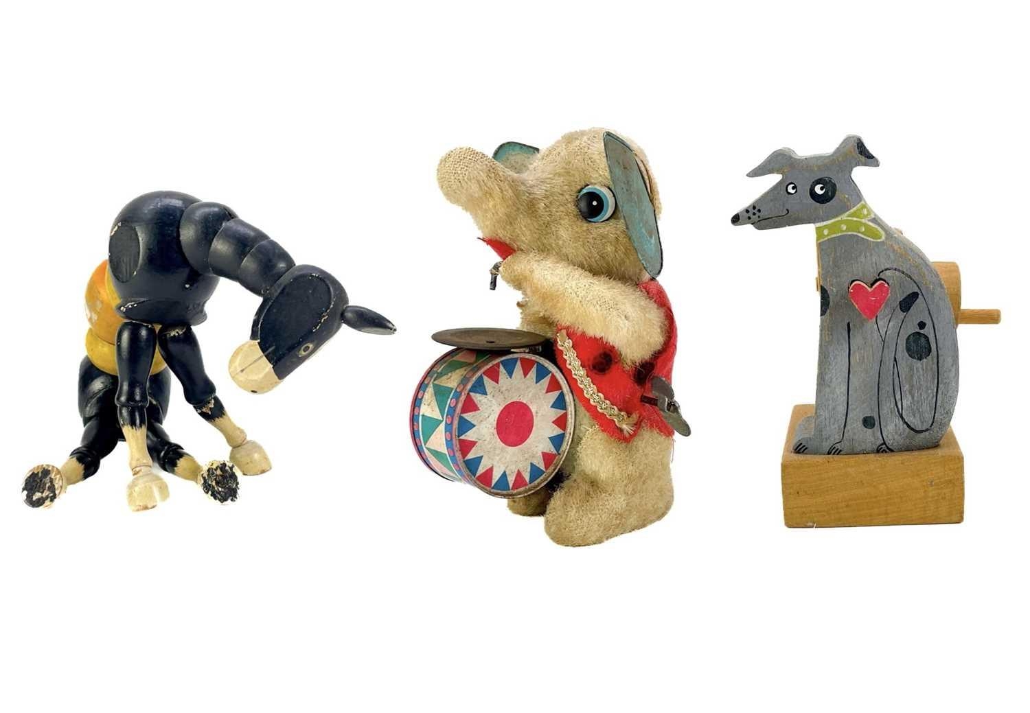 A carved wood automaton in the form of a seated whipped with 'beating' heart. Height 13cm, together with a reticulated model of a horse, and a 1960s Japanese clockwork toy modelled as an elephant playing a drum, height 14cm (3).