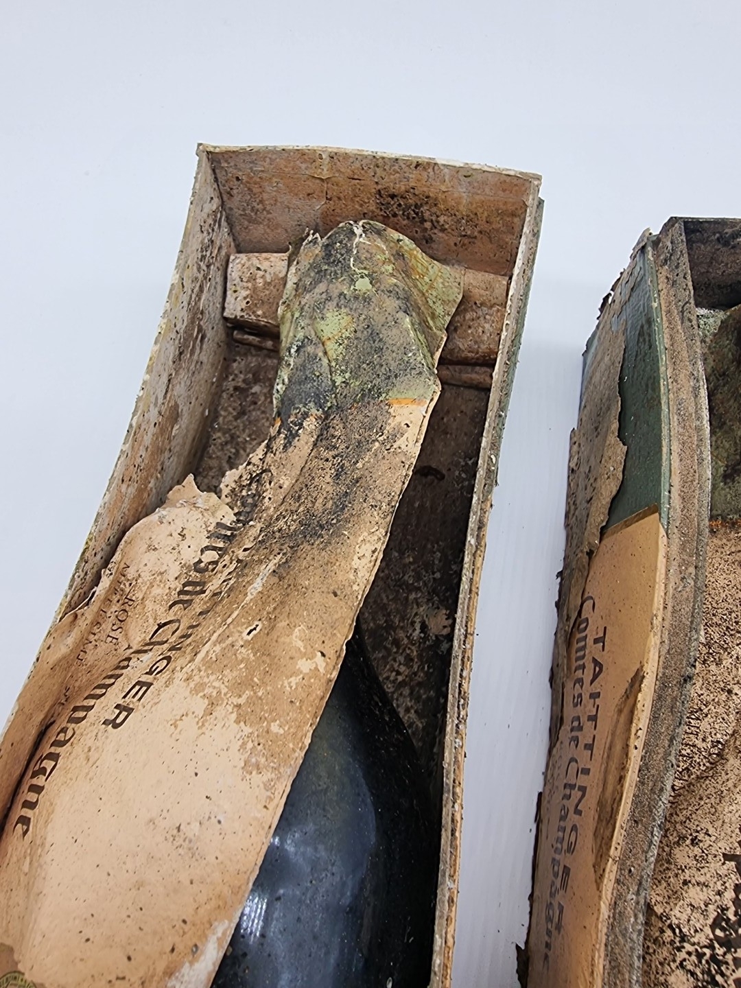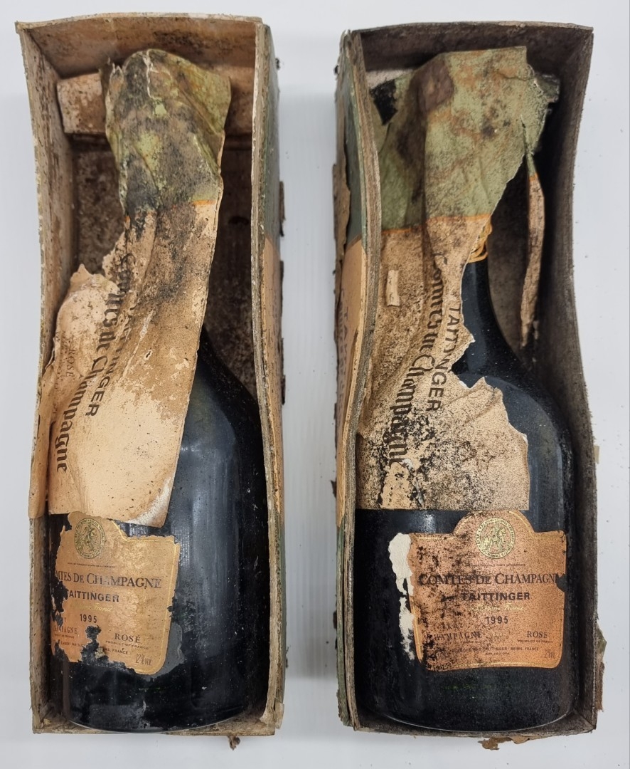Two 75cl bottles of Taittinger Comtes de Champagne 1995 Vintage Rose Champagne, (boxes distressed).