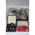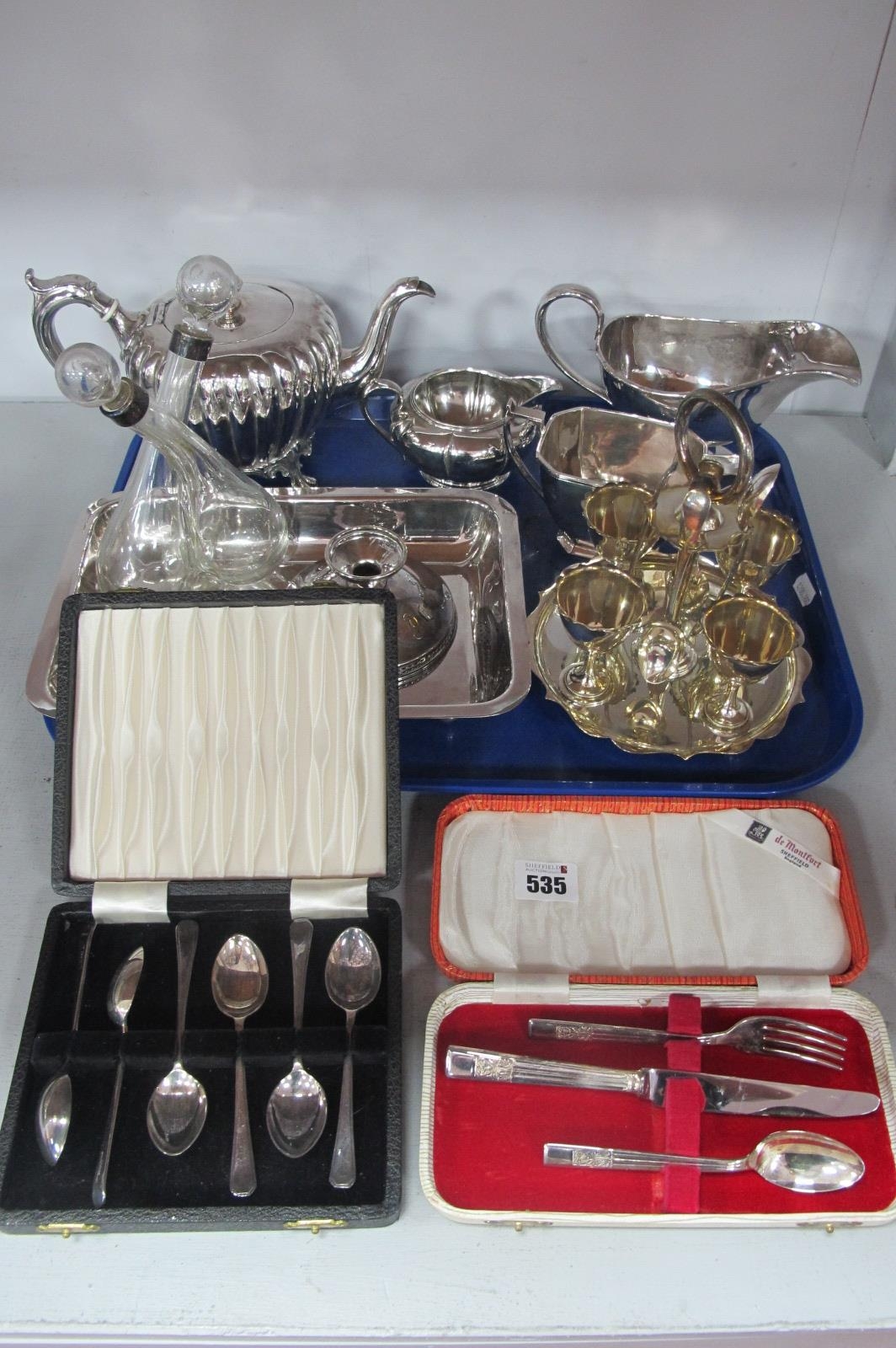Assorted Plated Ware, including egg cruet stand, sauce boat and cream jugs, cased spoons, etc :- One Tray