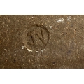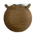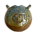 John Vasey (20th century British), an unusual studio pottery moon flask, decorated with a lion mask and incised greek key detail, 14.5cmD