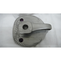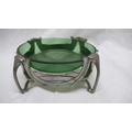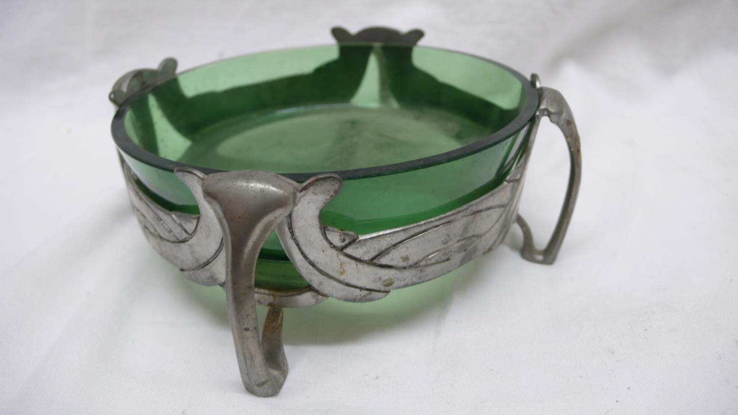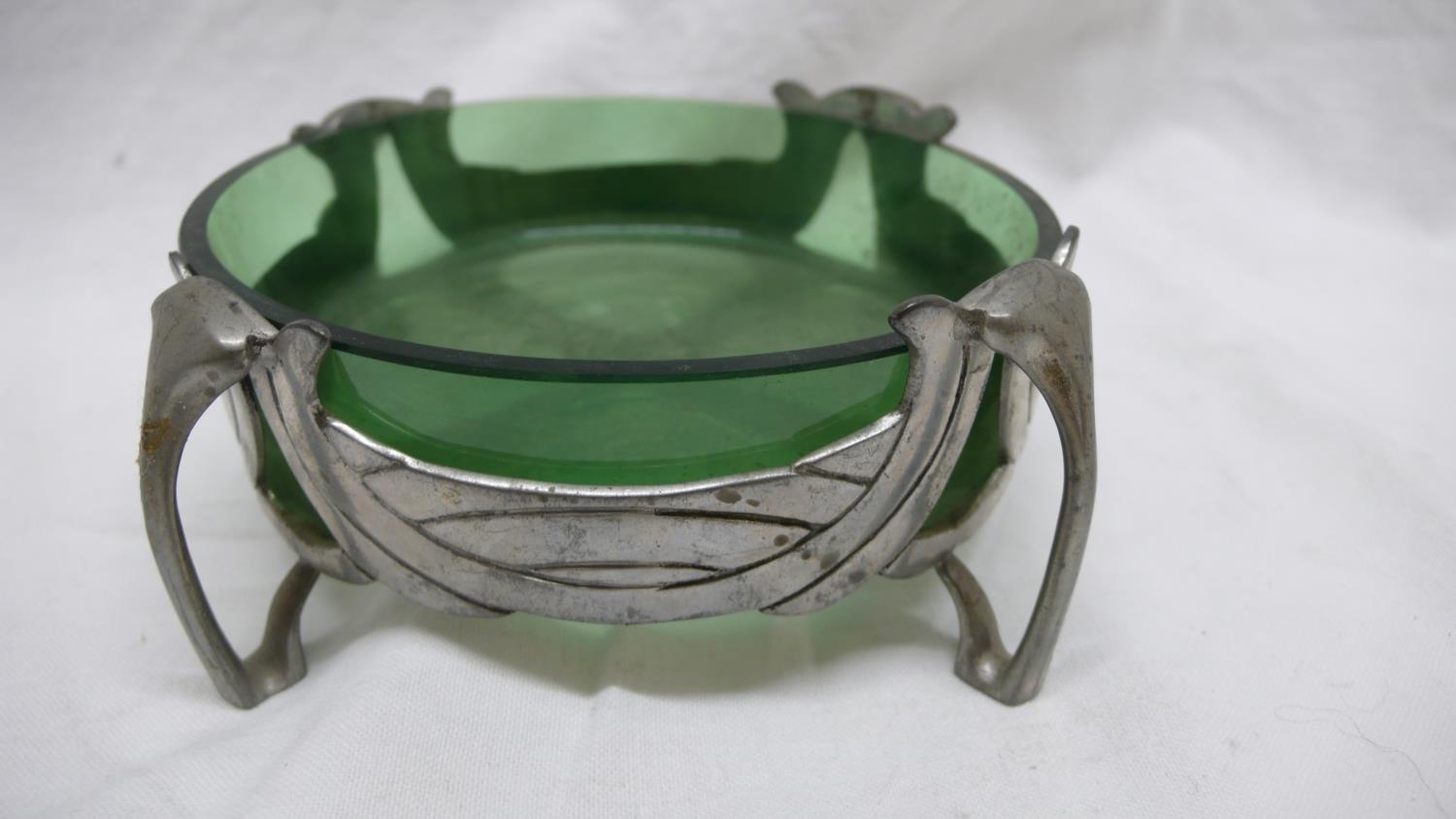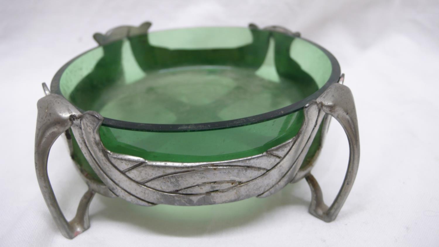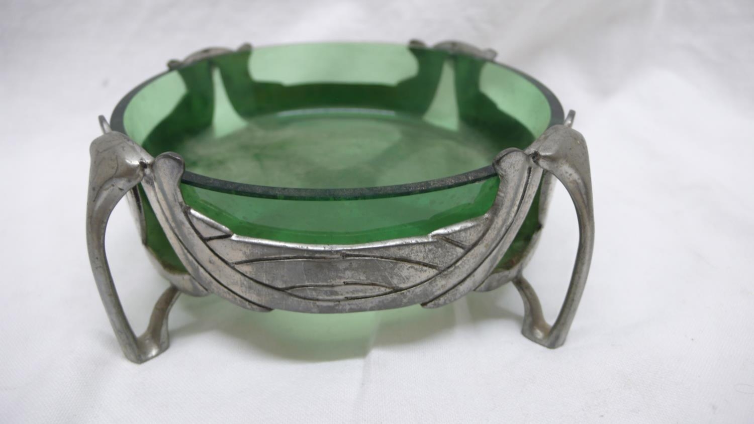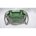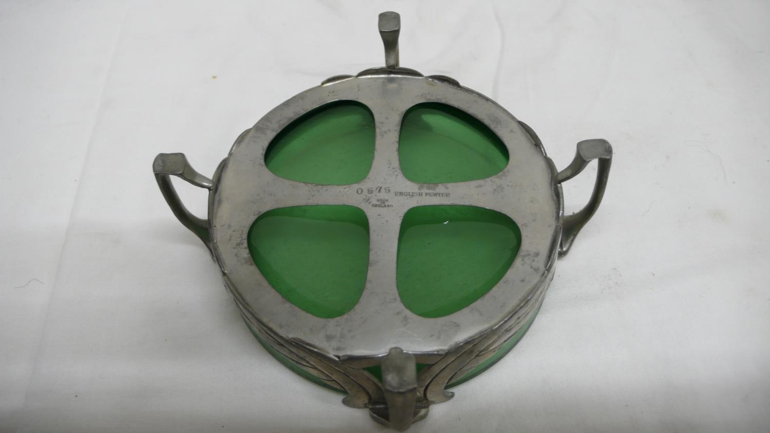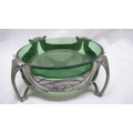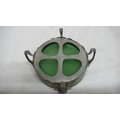Liberty & Co. English Pewter butter dish with open work C scroll decoration on four legs and green glass liner, No. 0575, Diam. 13.5 cms