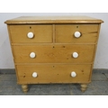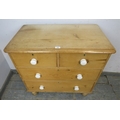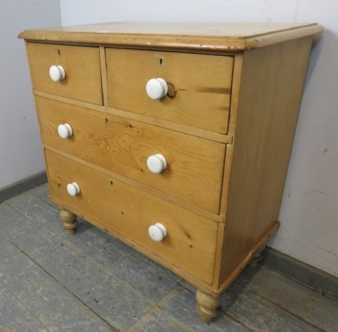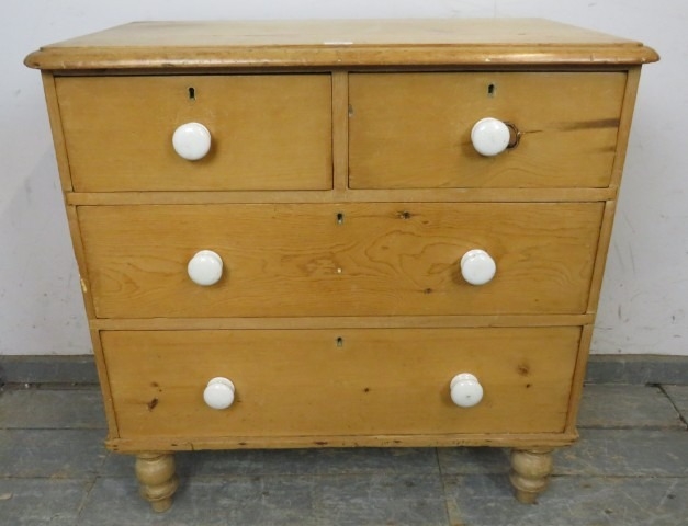 A Victorian pine chest of two short over two long drawers with ceramic handles and turned legs. H86cm x W86cm x D48cm approx.