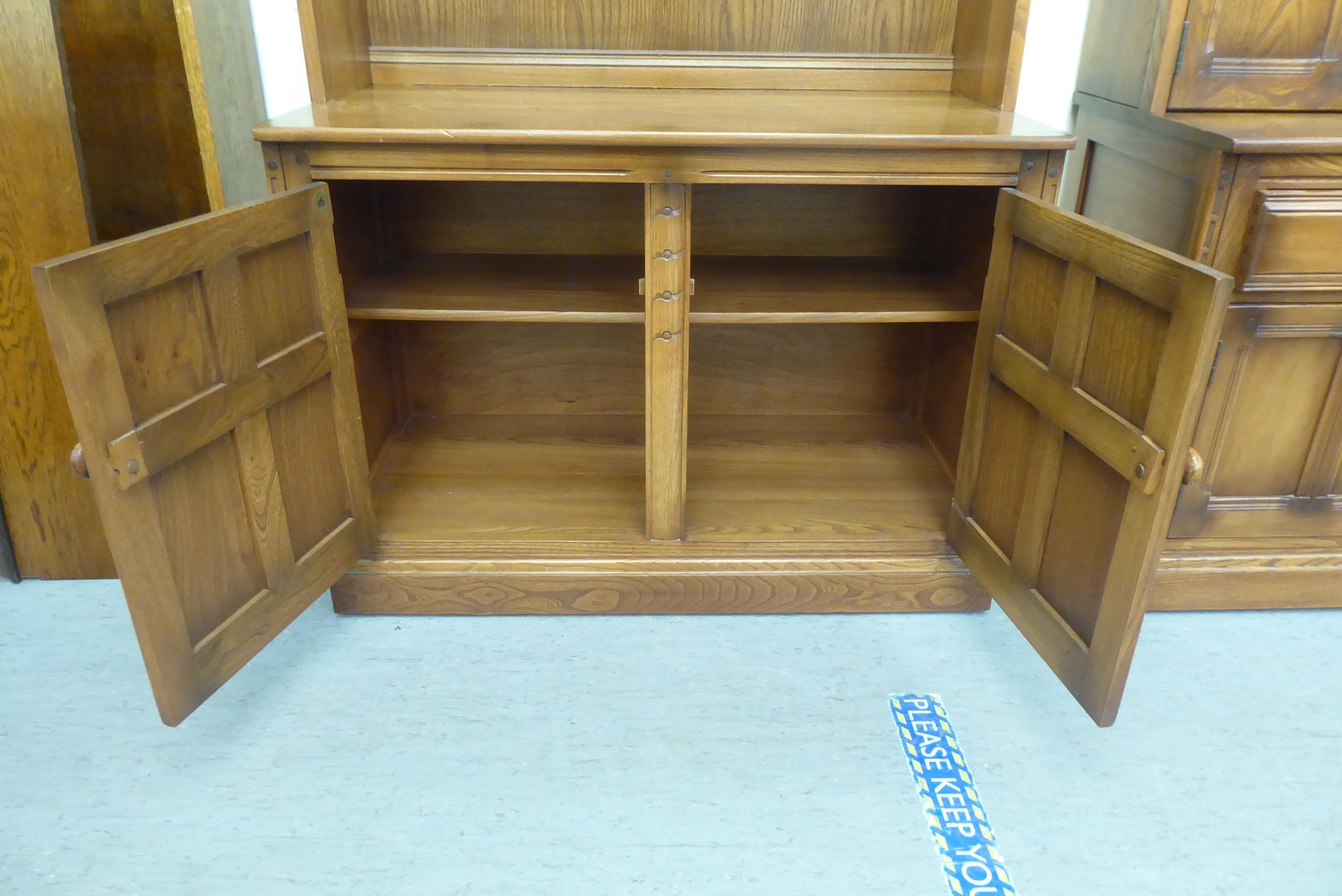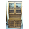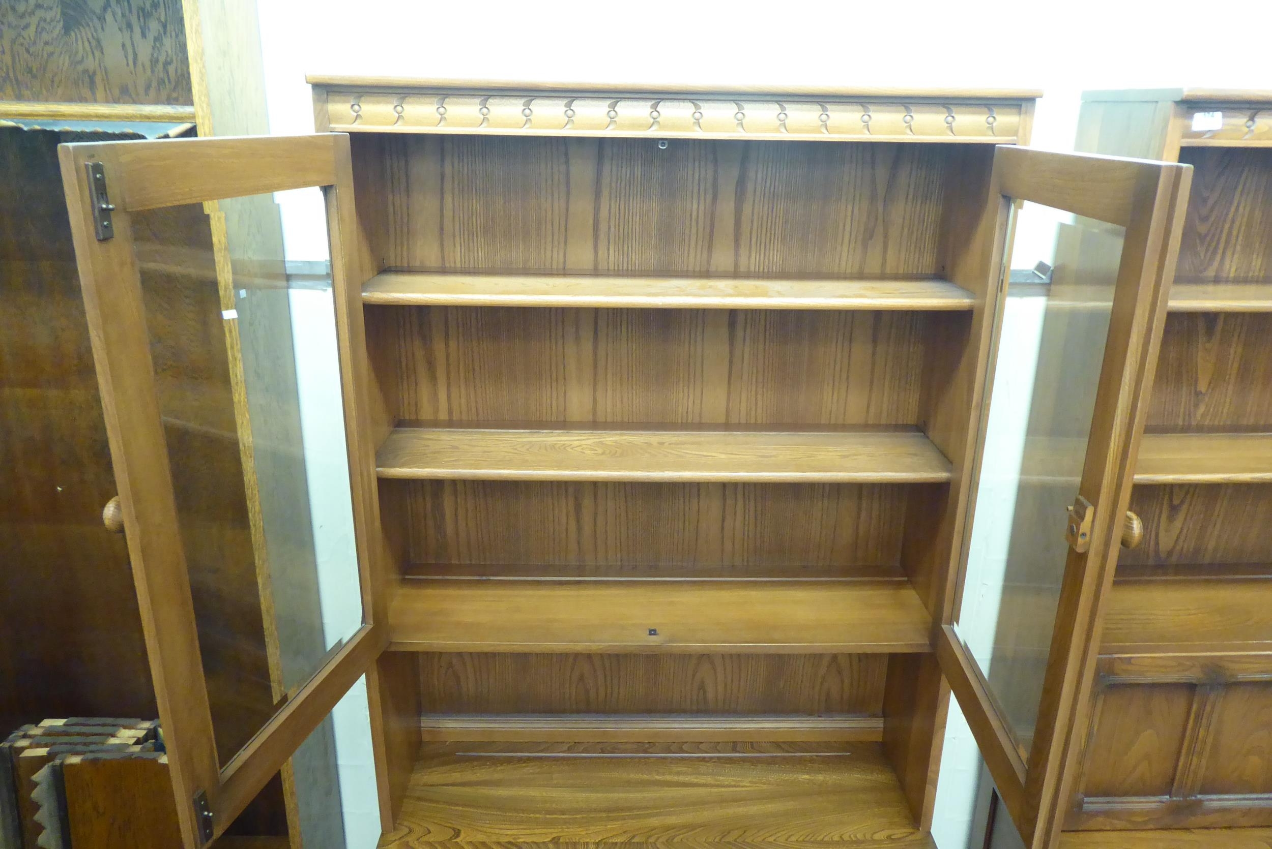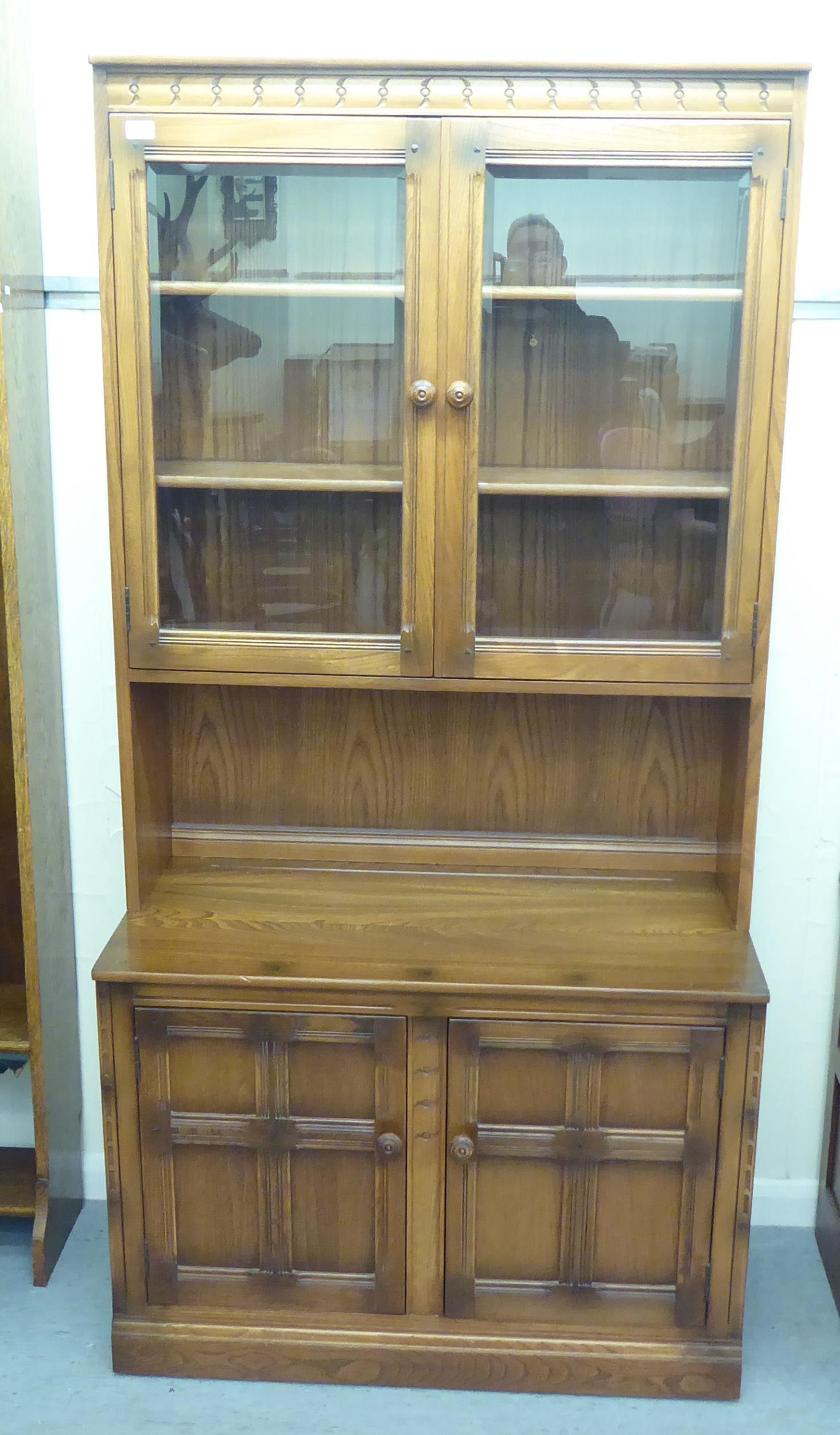 An Ercol Golden Dawn beech and elm livingroom unit, the upper part enclosed by a pair of bevelled glazed panelled doors, over an open undershelf and a pair of panelled doors, on a plinth 75"h 38"w