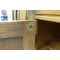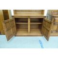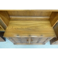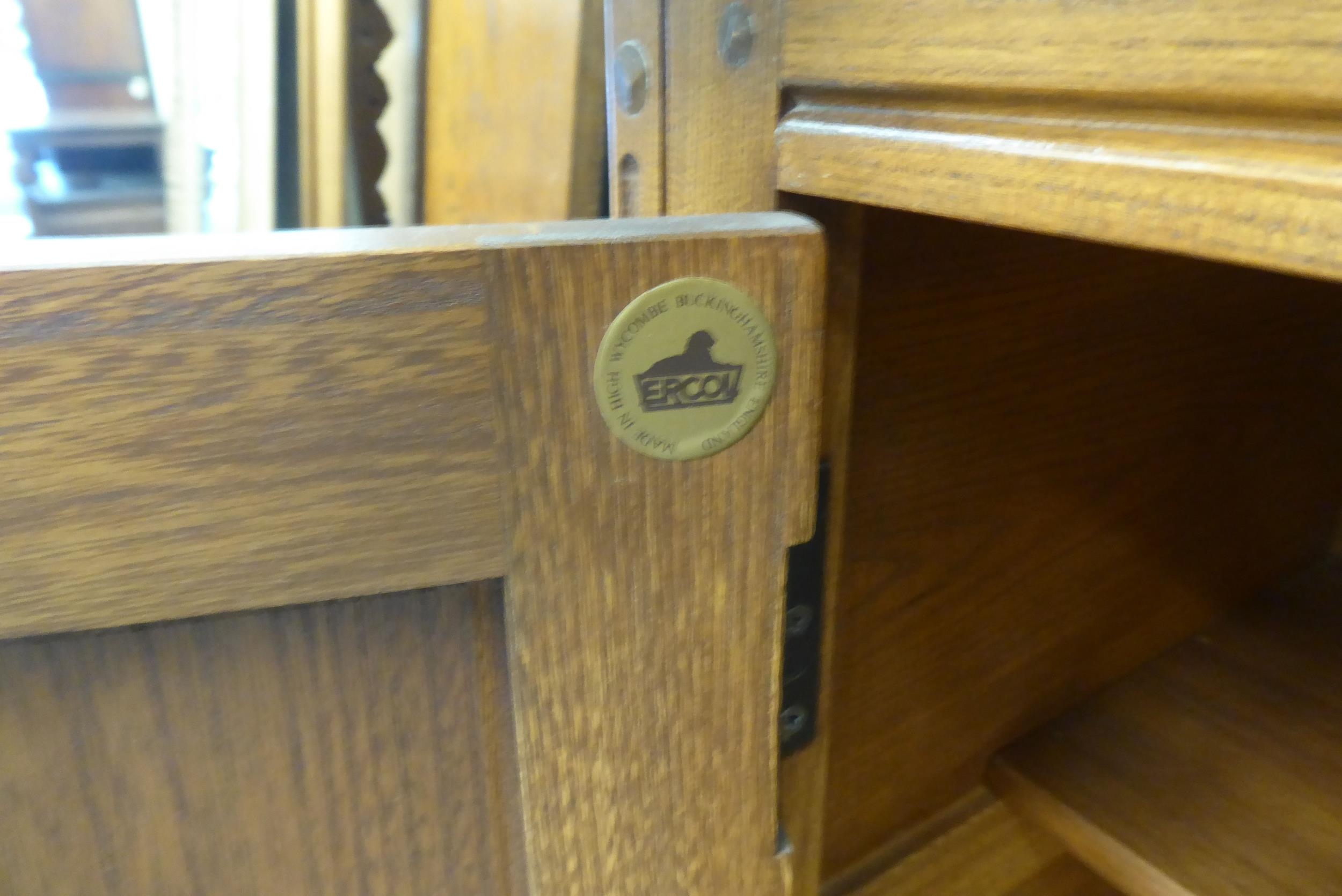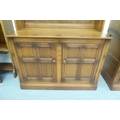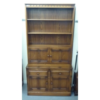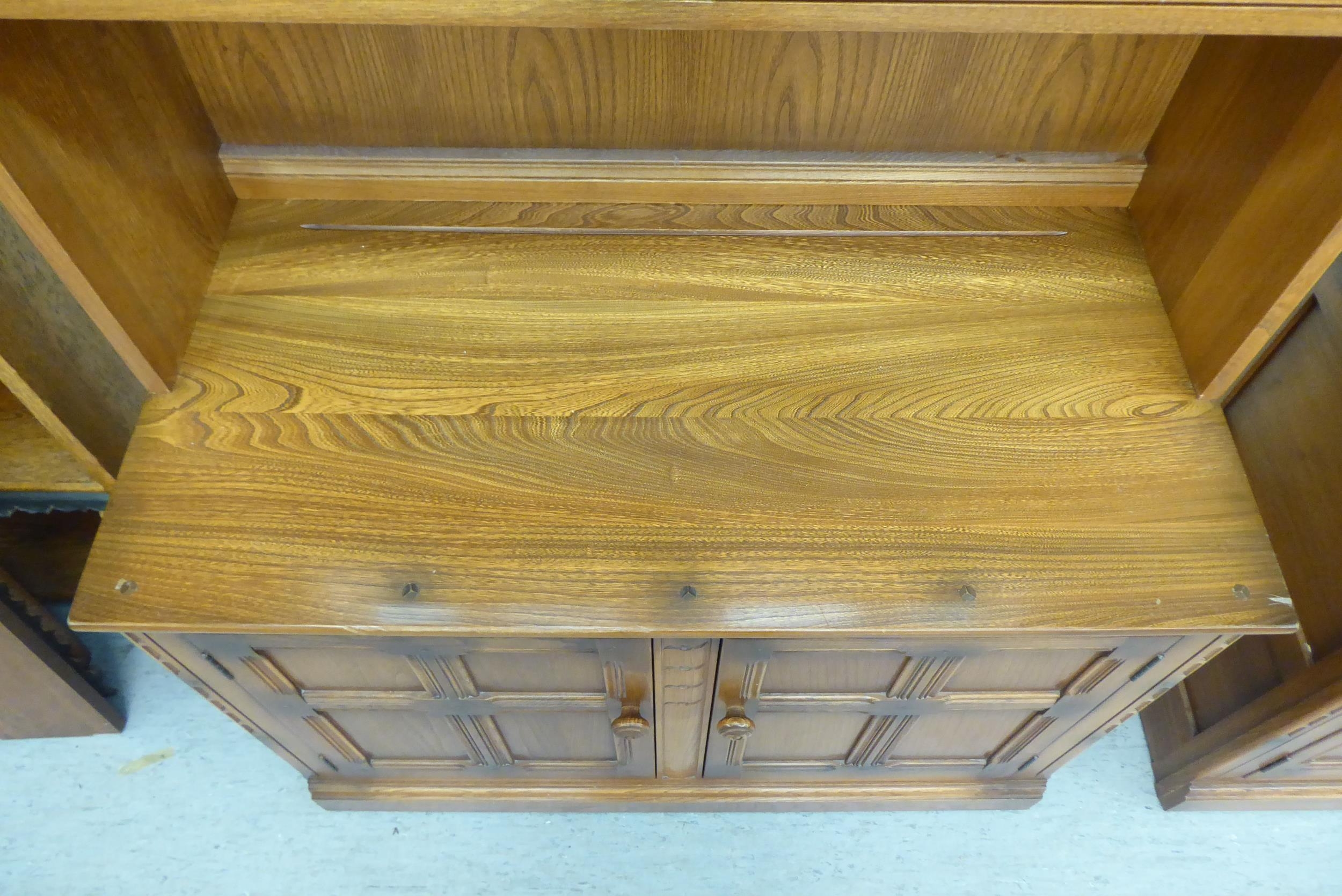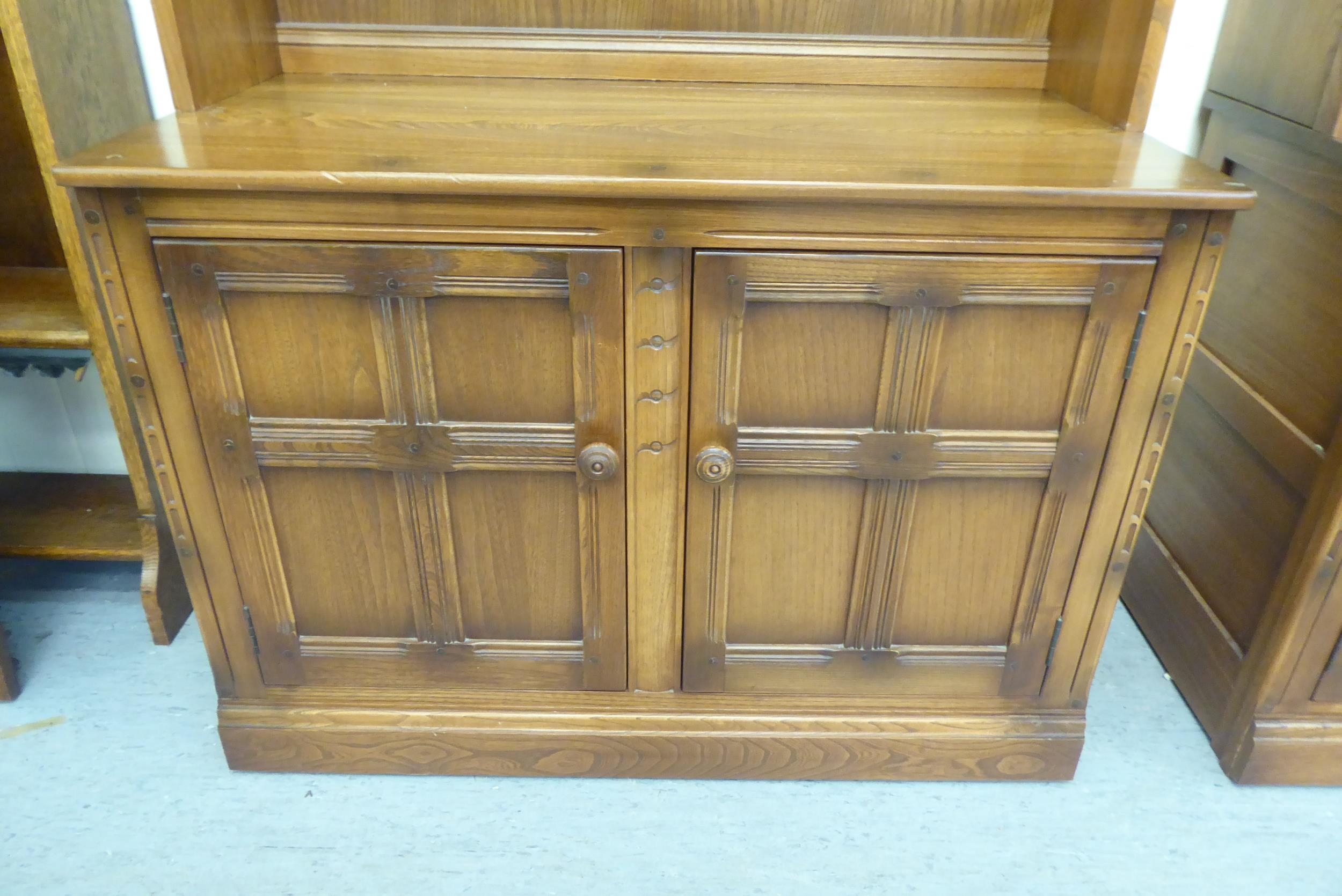 An Ercol Golden Dawn beech and elm livingroom unit, the upper part enclosed by a pair of bevelled glazed panelled doors, over an open undershelf and a pair of panelled doors, on a plinth 75"h 38"w