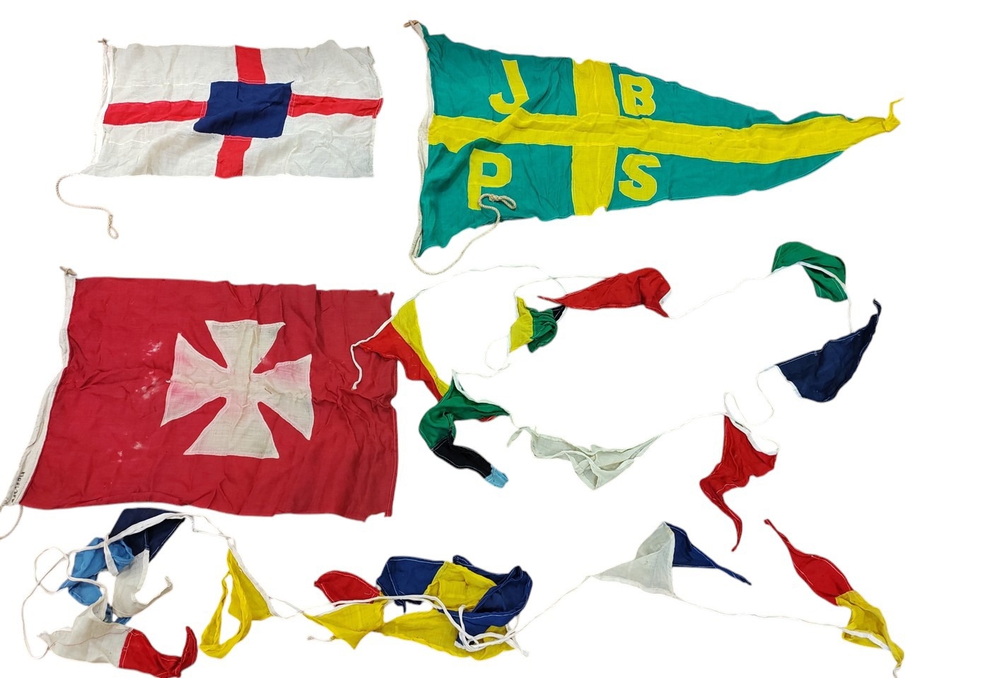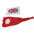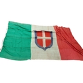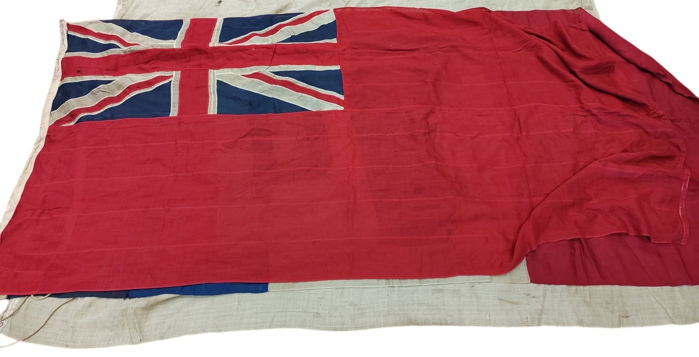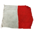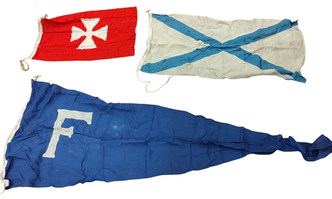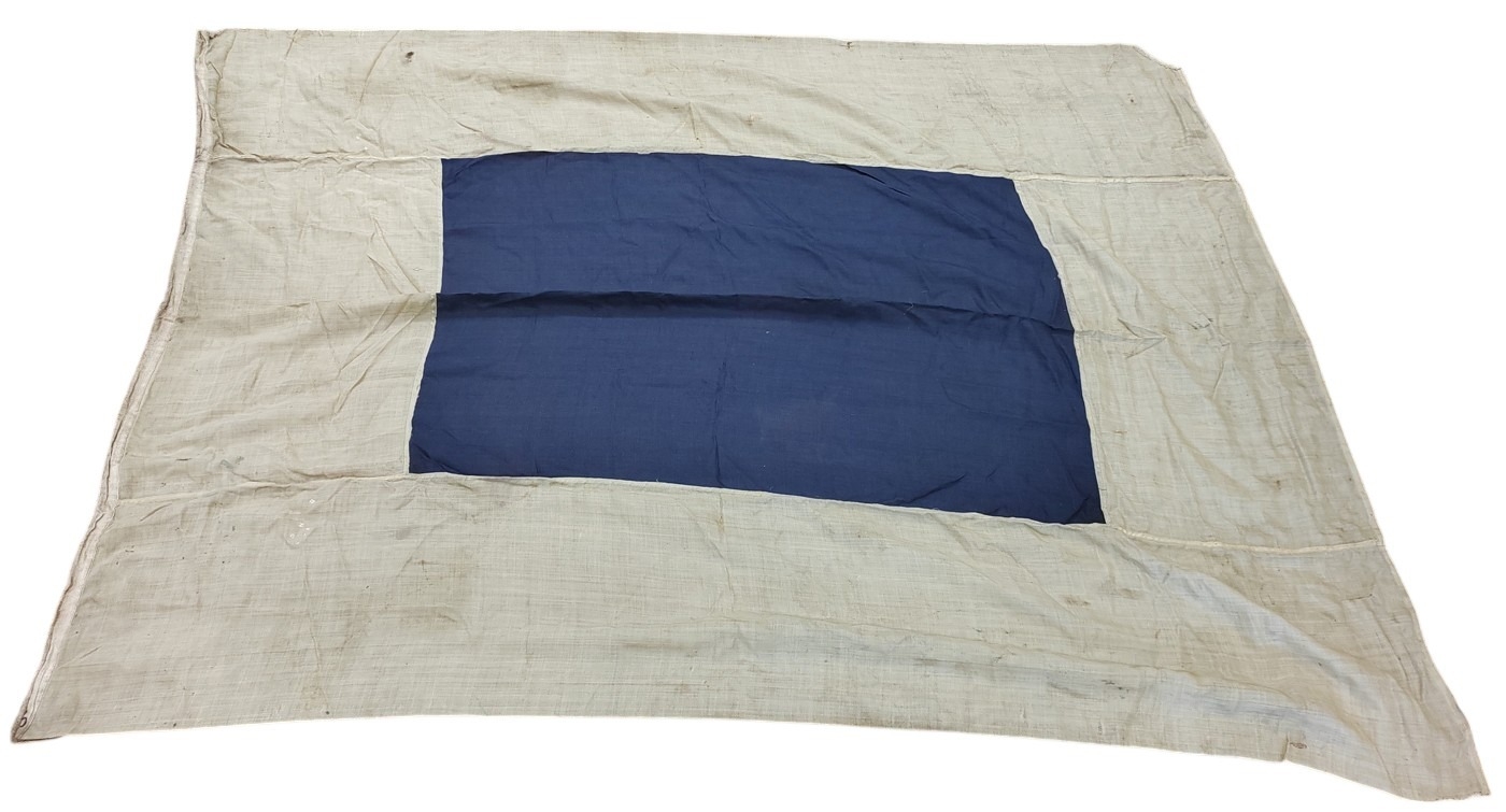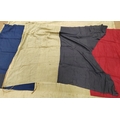 Collection of Naval flags 3 yards to smaller, includes French flag, Brazil flag, Italy Flag, Red Ensign, House flag Donaldson Line, Royal Mail Lines signal flags with Alpha, Sierra etc., acquired by vendors father who worked at London docks during WWII trading various items with crew members, mixed condition some with tears, holes and general wear. Qty 20 (B)