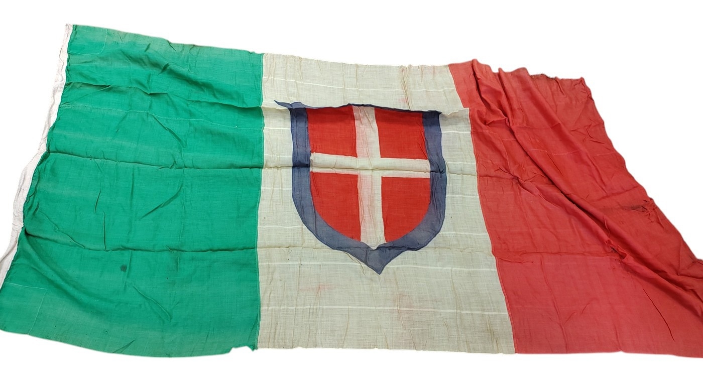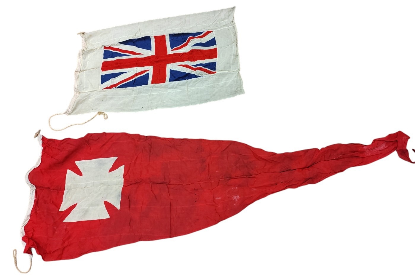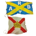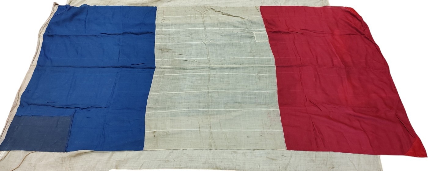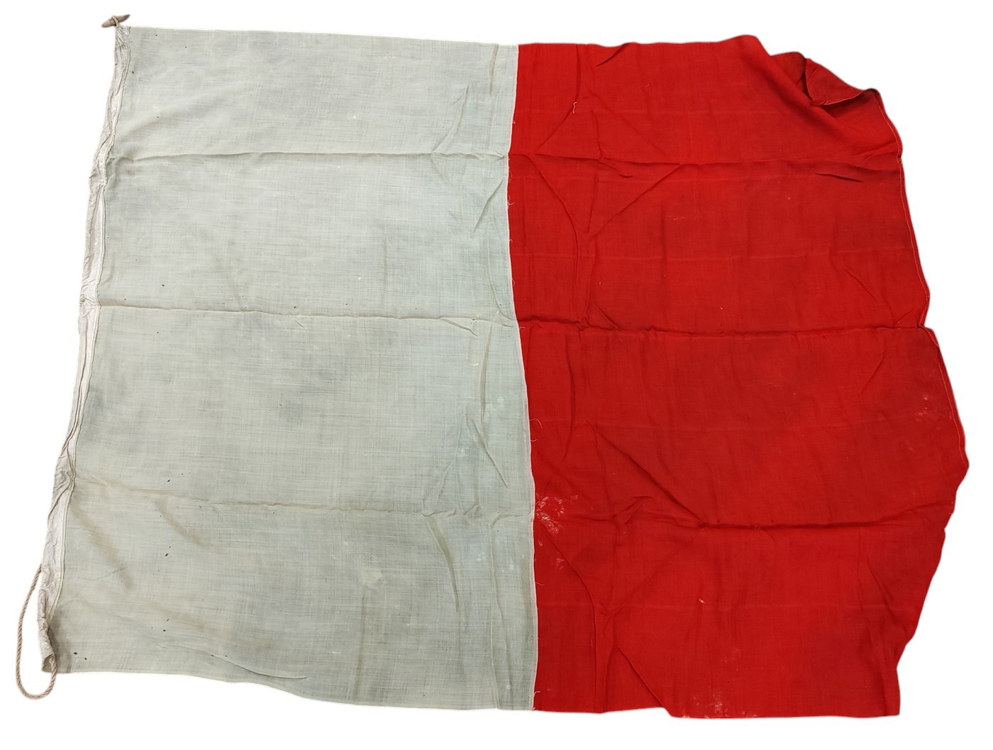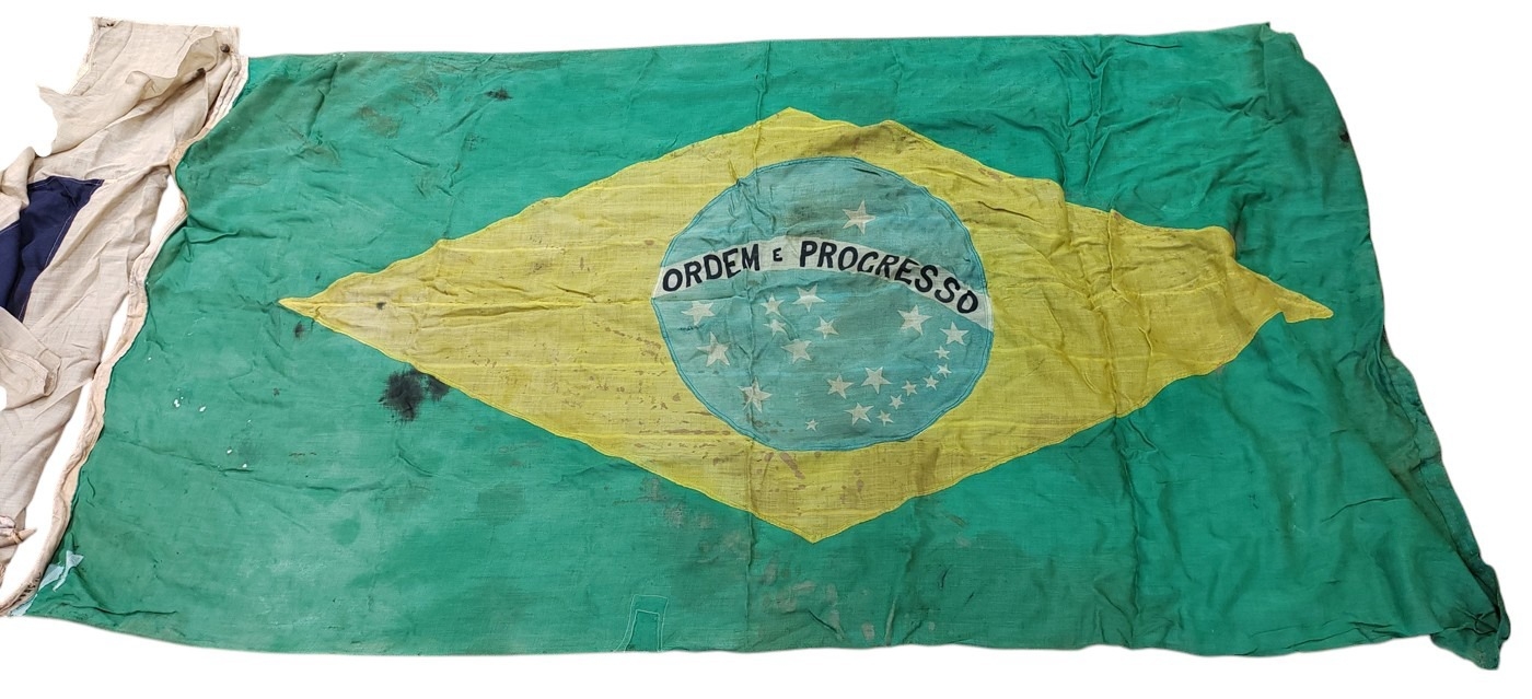 Collection of Naval flags 3 yards to smaller, includes French flag, Brazil flag, Italy Flag, Red Ensign, House flag Donaldson Line, Royal Mail Lines signal flags with Alpha, Sierra etc., acquired by vendors father who worked at London docks during WWII trading various items with crew members, mixed condition some with tears, holes and general wear. Qty 20 (B)