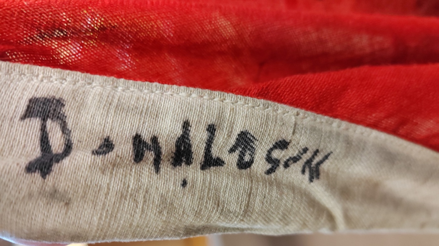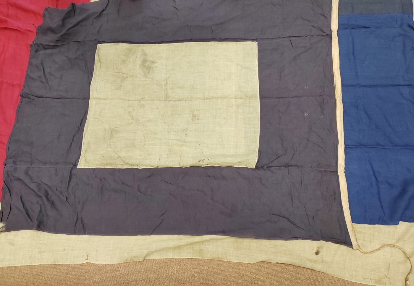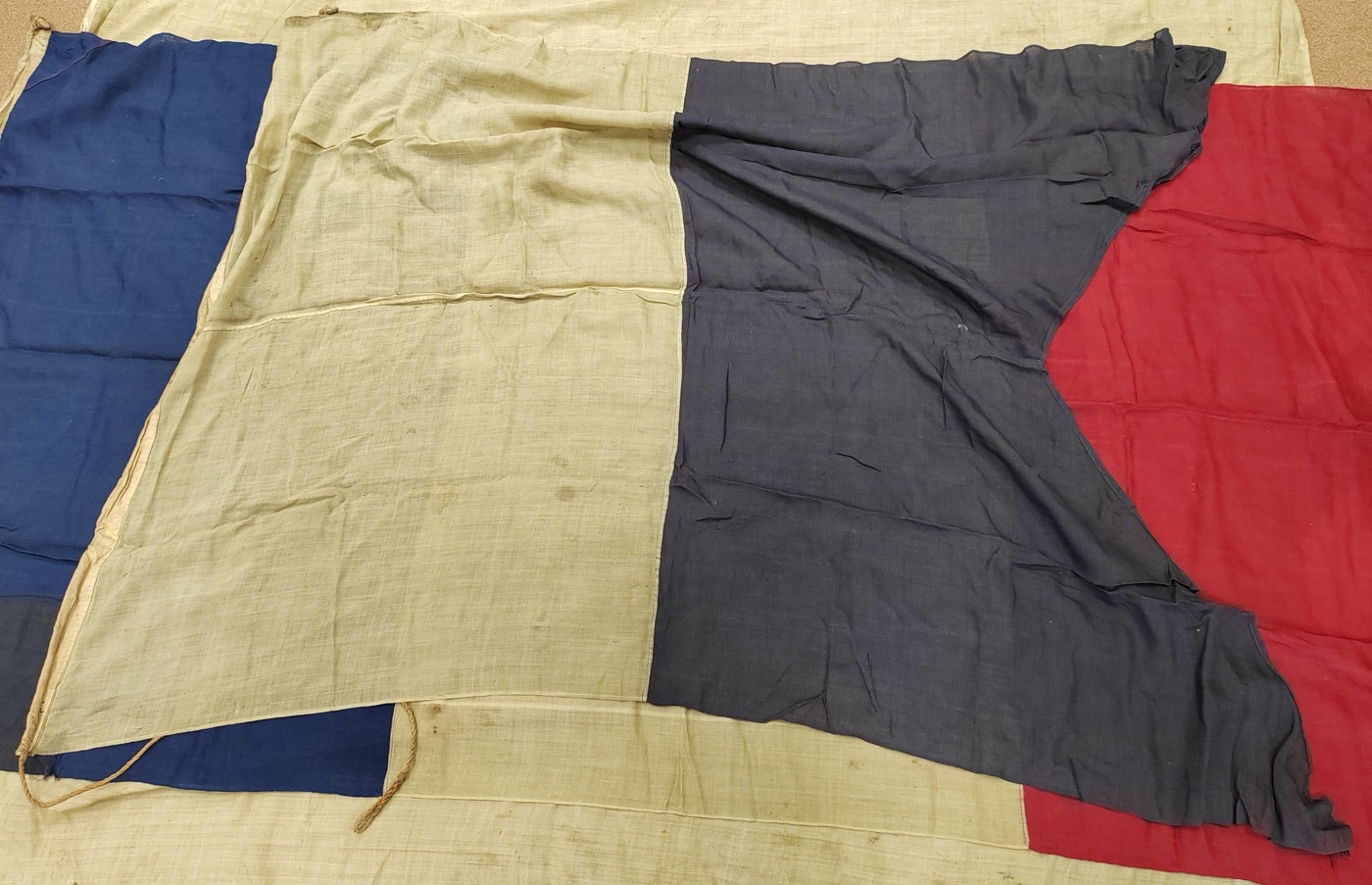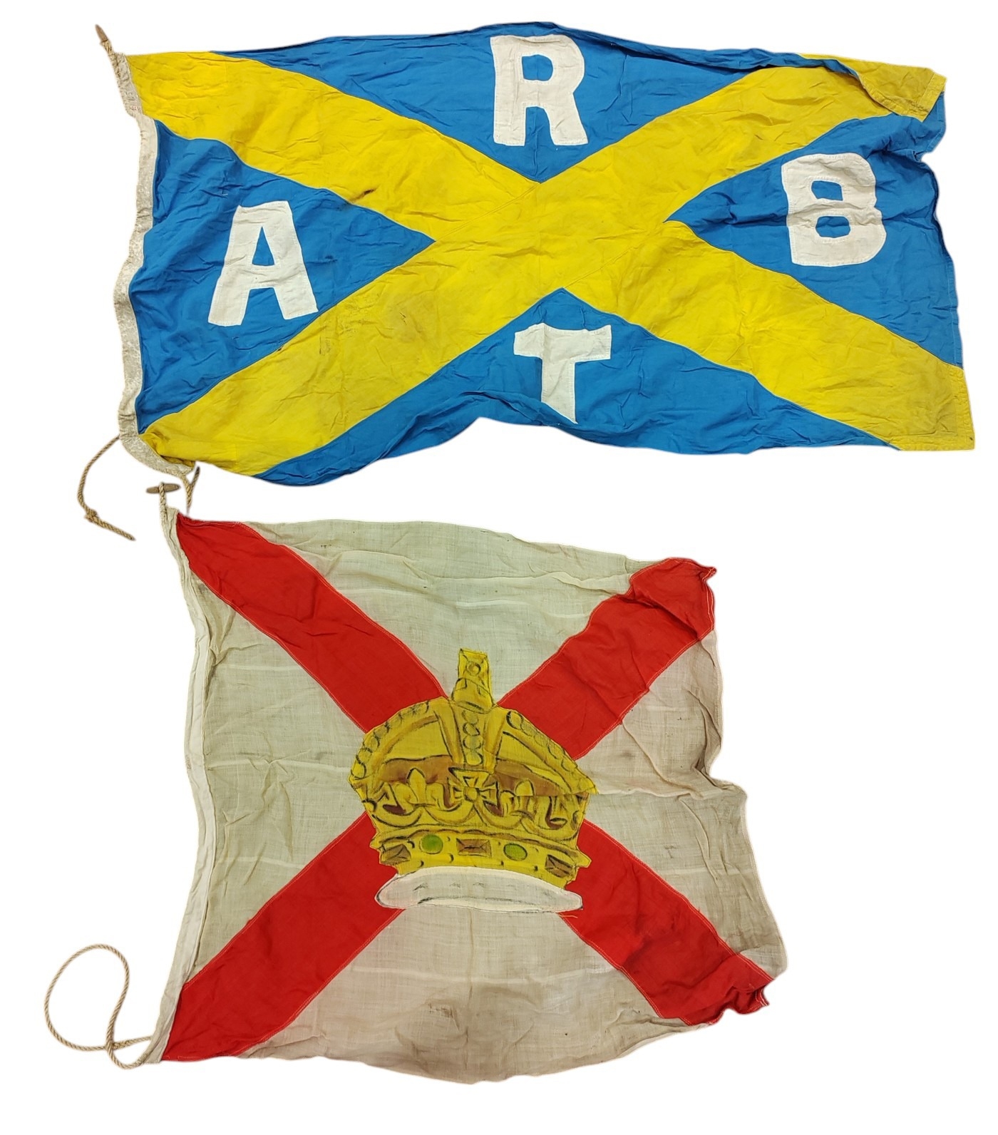 Collection of Naval flags 3 yards to smaller, includes French flag, Brazil flag, Italy Flag, Red Ensign, House flag Donaldson Line, Royal Mail Lines signal flags with Alpha, Sierra etc., acquired by vendors father who worked at London docks during WWII trading various items with crew members, mixed condition some with tears, holes and general wear. Qty 20 (B)