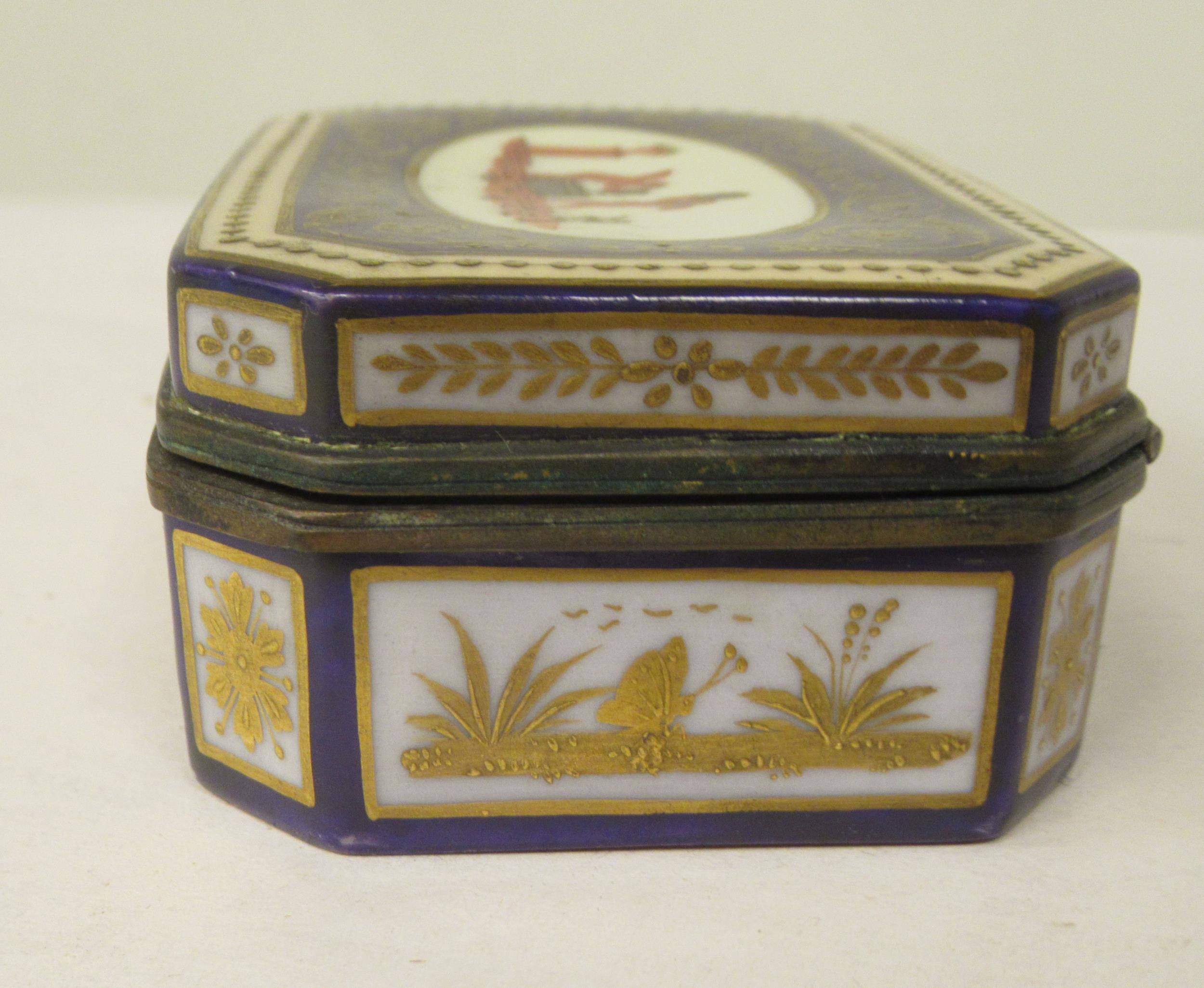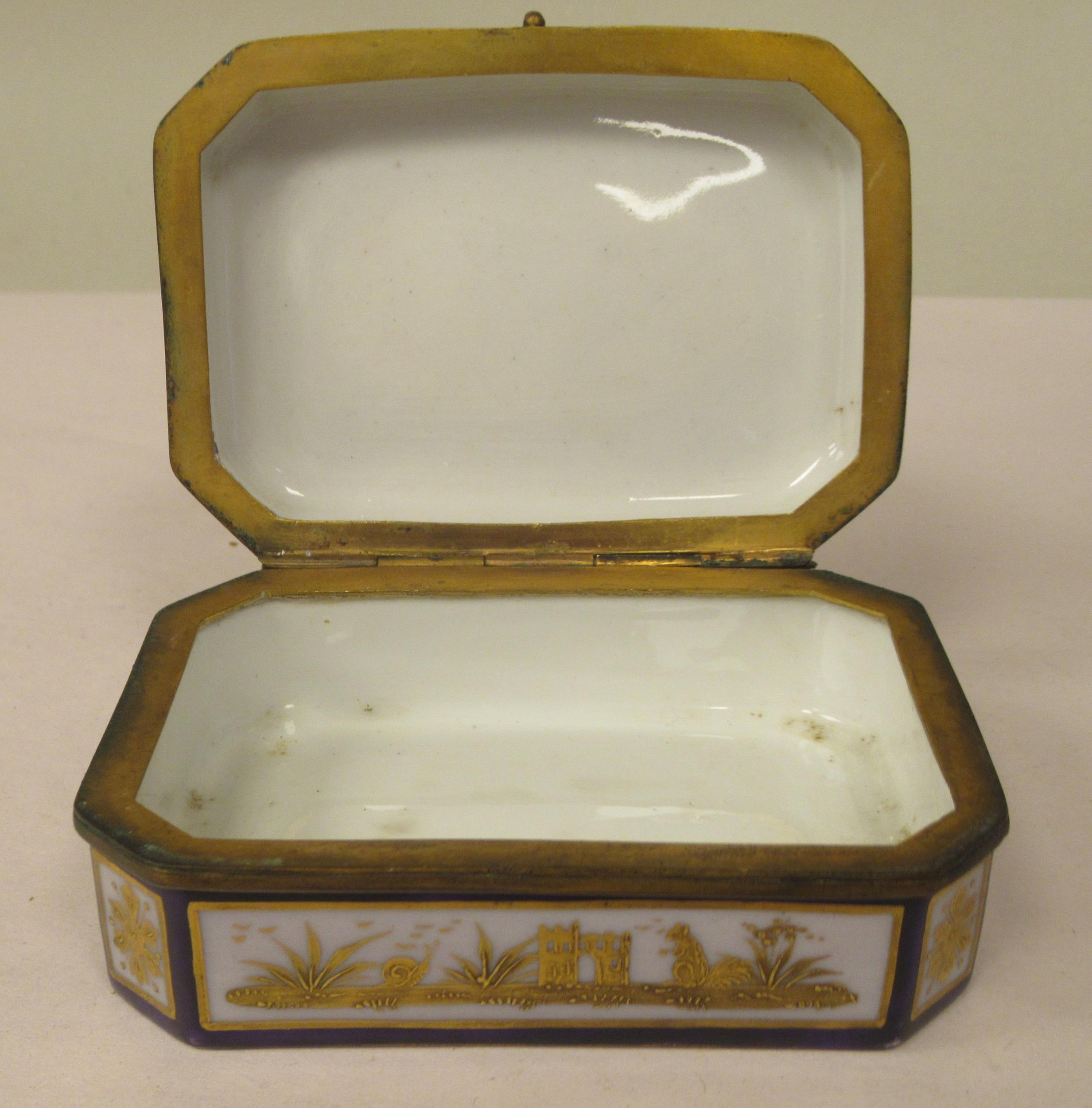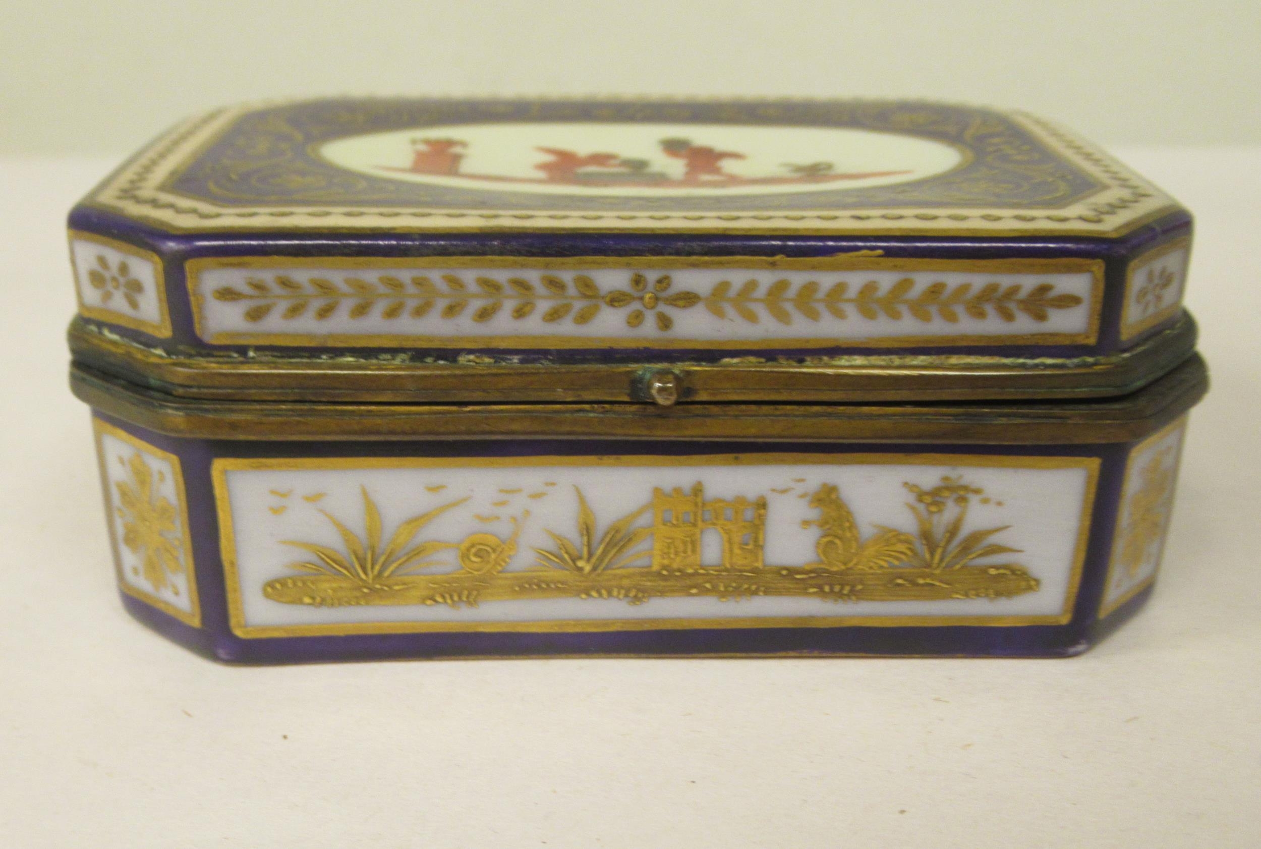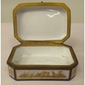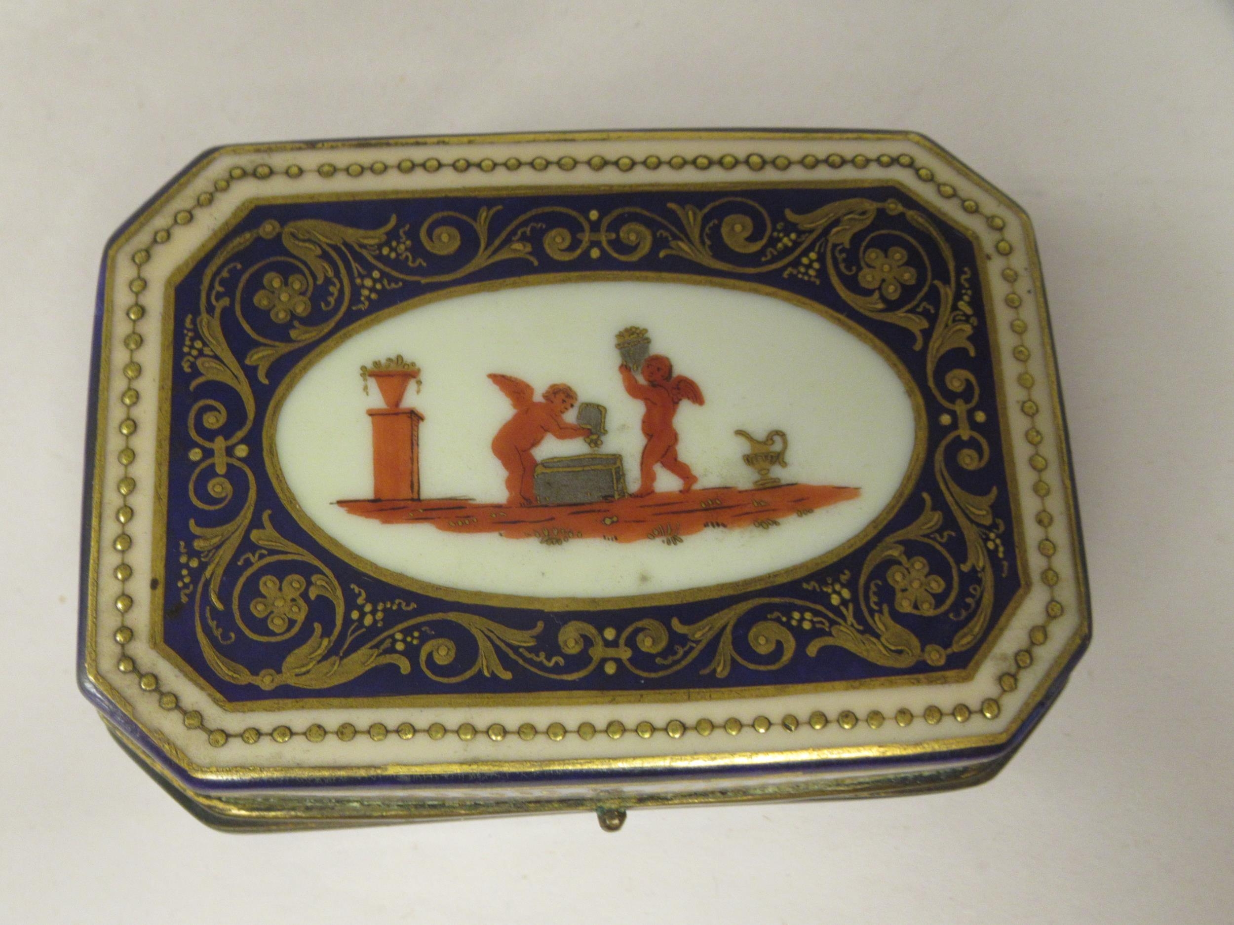 A 19thC Vienna porcelain trinket box of elongated, octagonal form, having a gilt metal collar and hinged lid, allover decorated with painted gilt vignette classical cherubic studies, ancient buildings, birds and insects 3.5"w