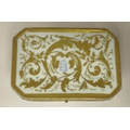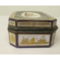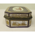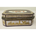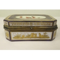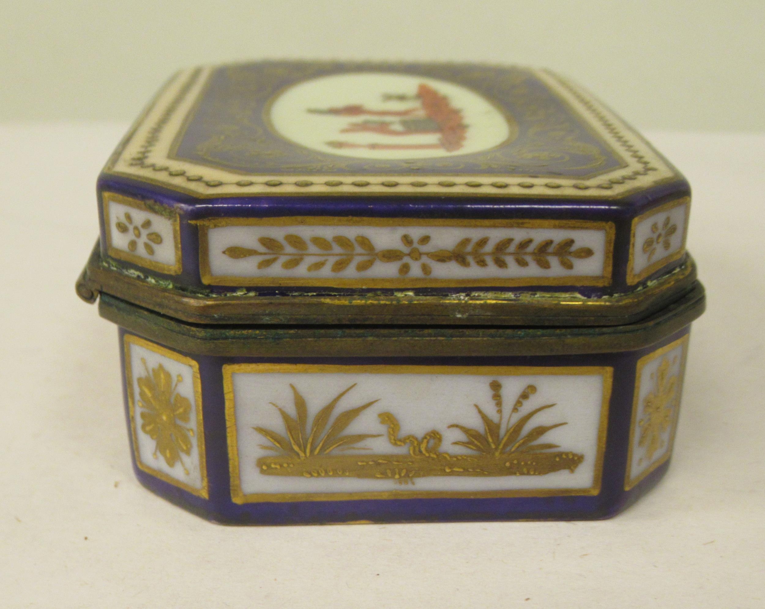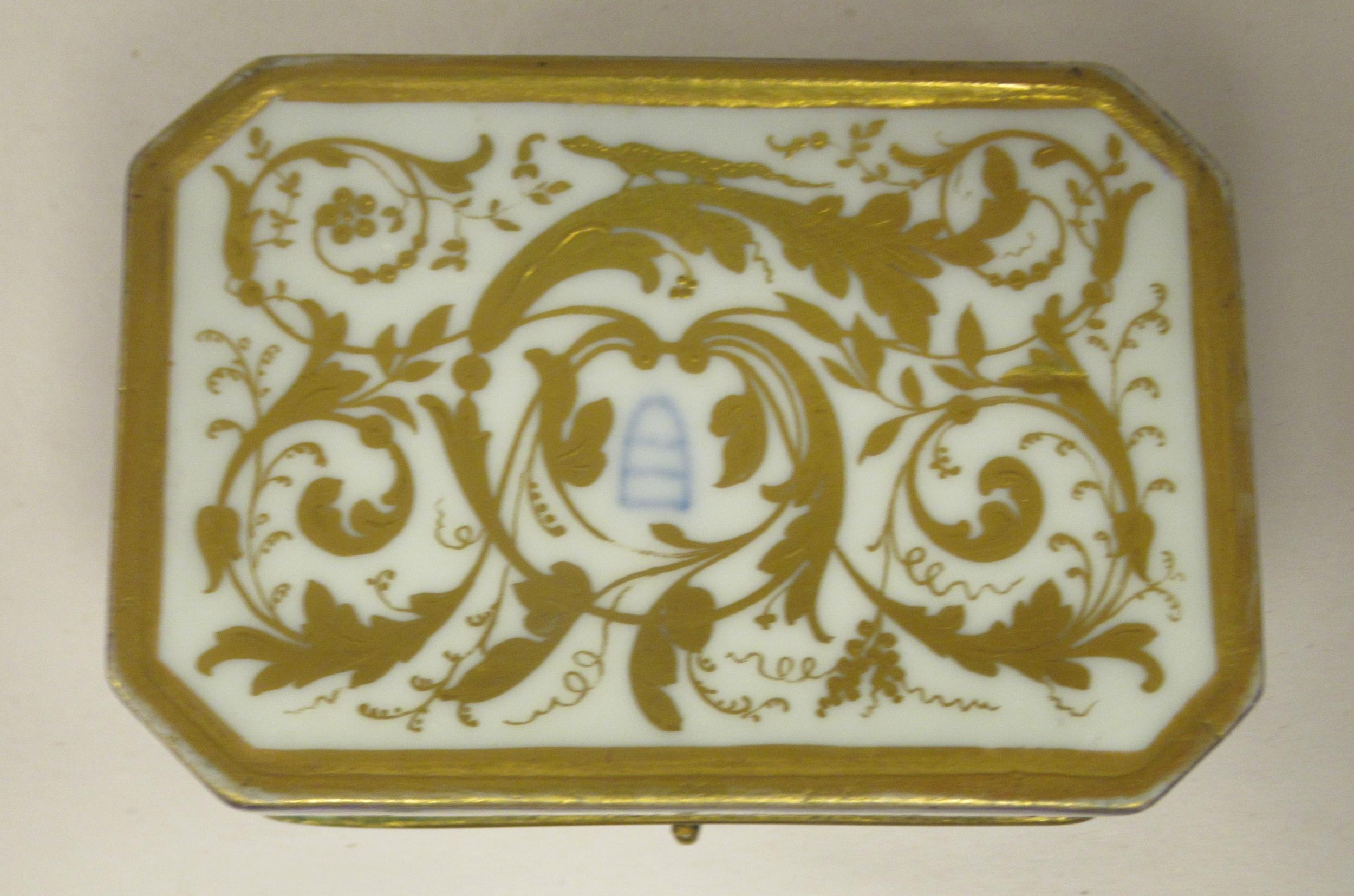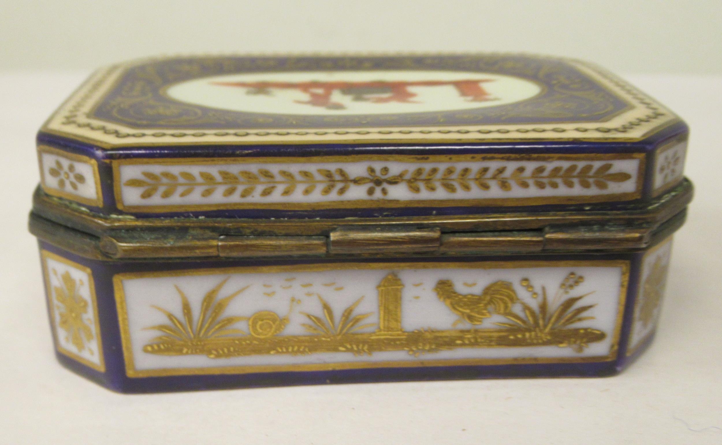 A 19thC Vienna porcelain trinket box of elongated, octagonal form, having a gilt metal collar and hinged lid, allover decorated with painted gilt vignette classical cherubic studies, ancient buildings, birds and insects 3.5"w