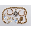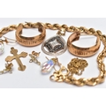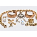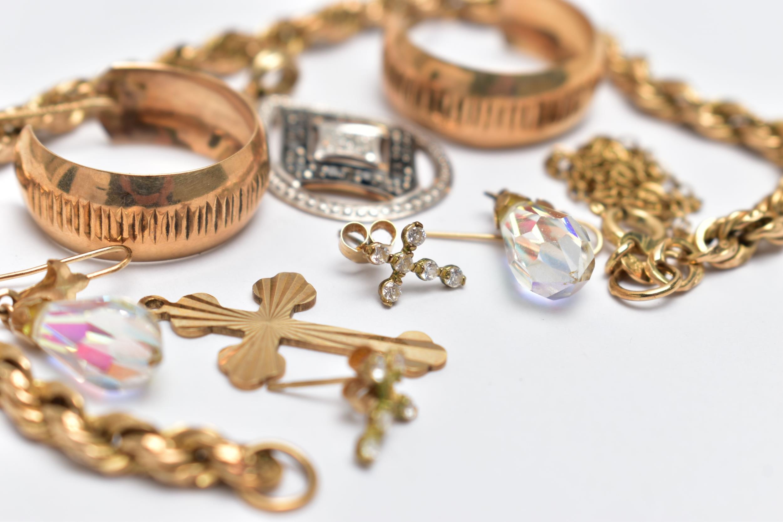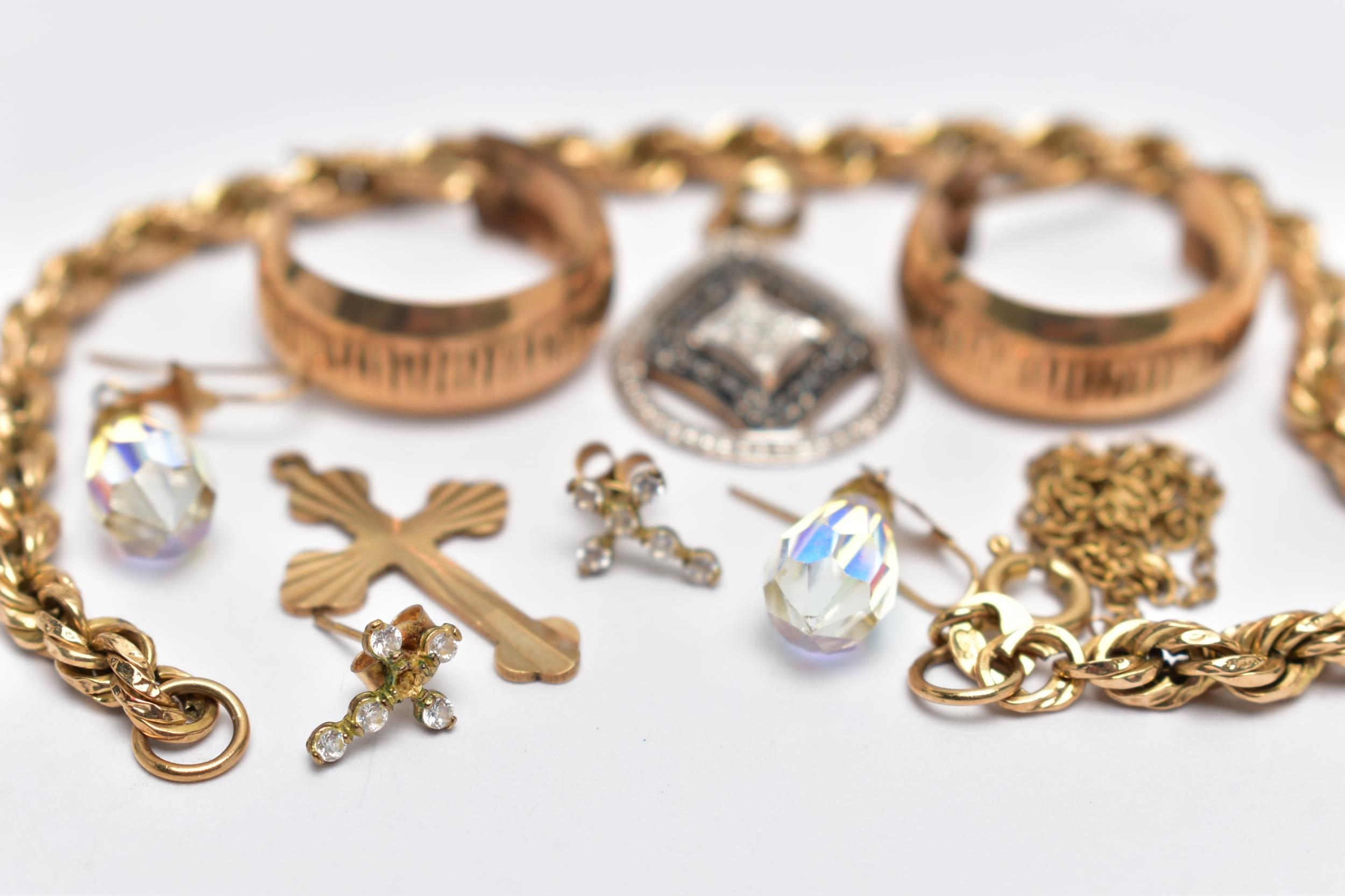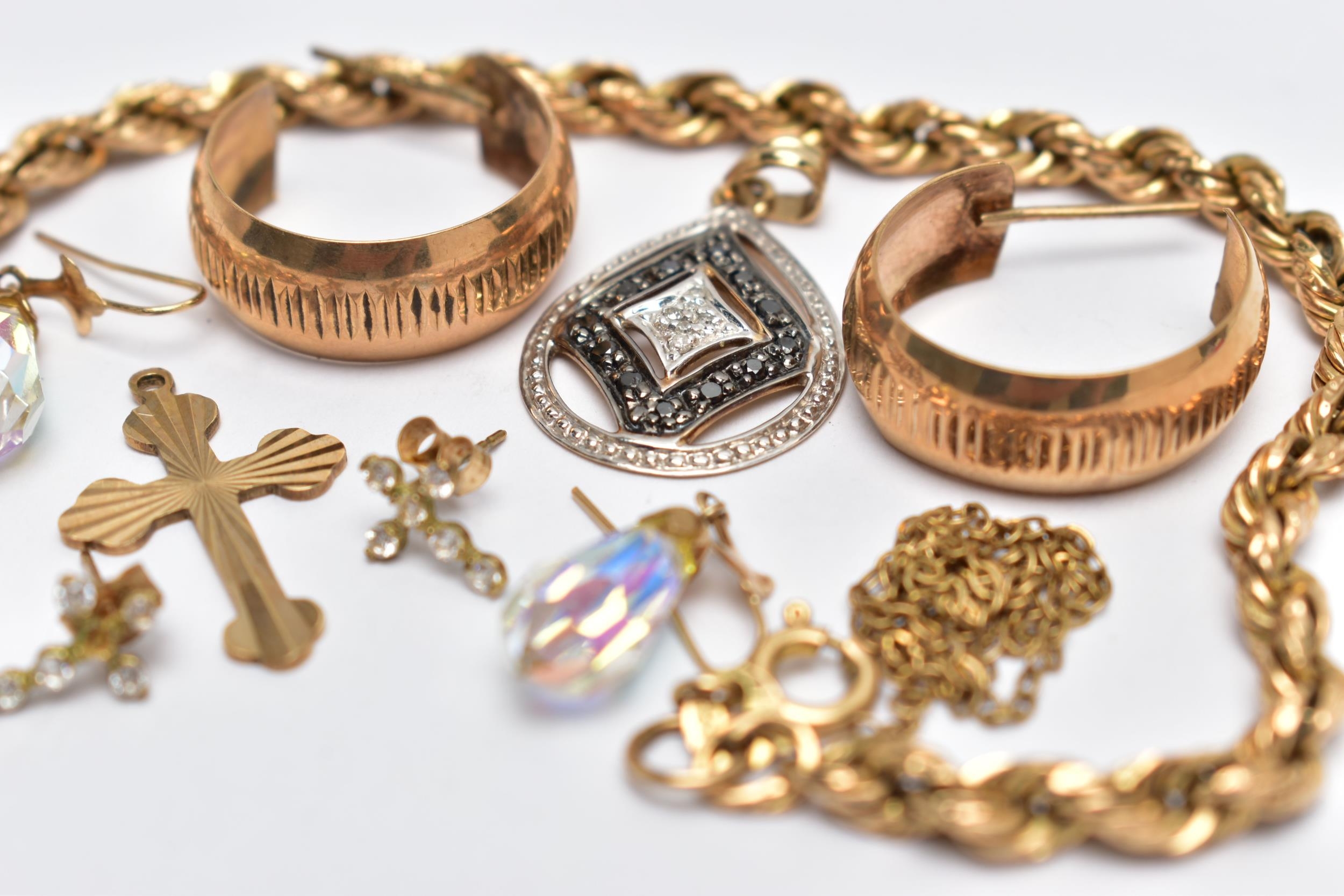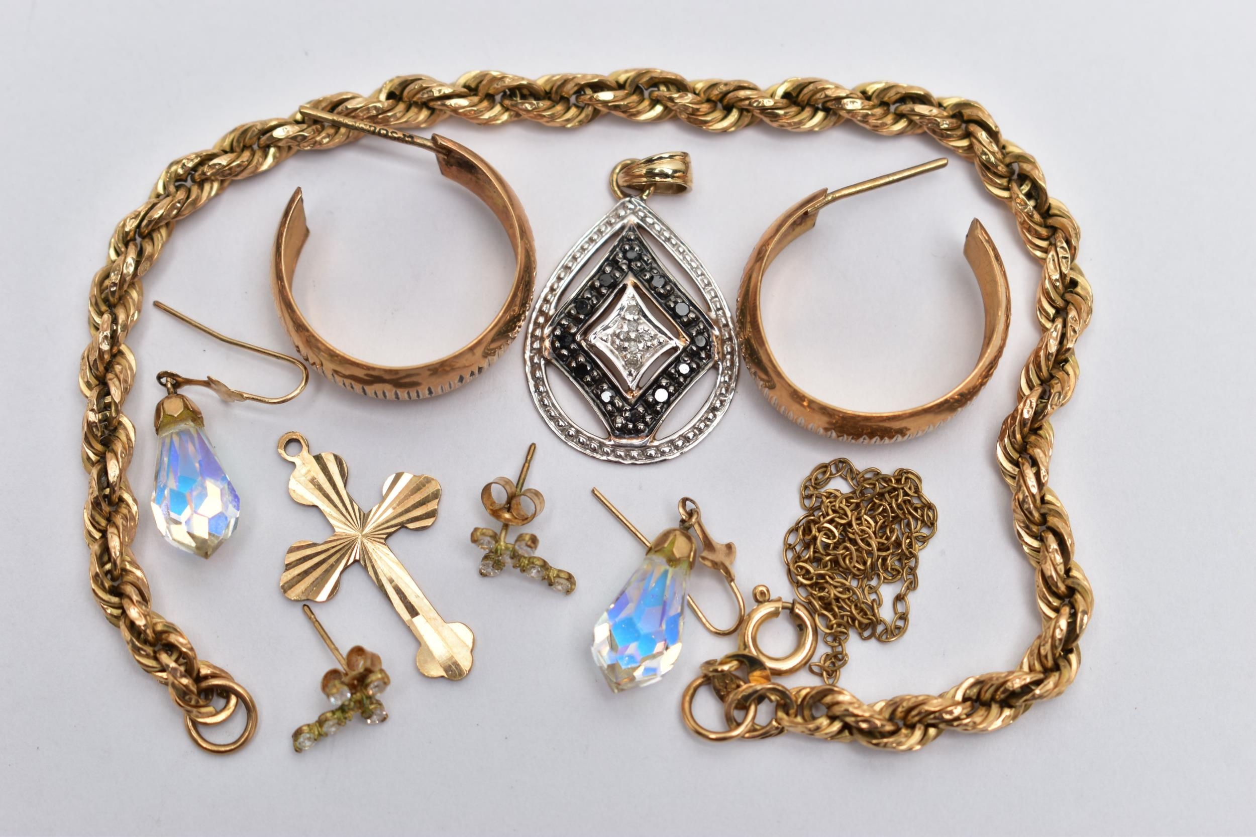 A BAG OF ASSORTED JEWELLERY, to include a 9ct rope twist bracelet, fitted with a spring clasp, hallmarked 9ct Birmingham, length 190mm, an openwork pear shape pendant, set with single cut colourless and black diamonds, fitted with a tapered bail, hallmarked 9ct London, a pair of half hoop textured earrings, post fittings hallmarked 9ct London, a 9ct gold cross pendant, hallmarked 9ct Birmingham, approximate gross weight 7.3 grams, together with a pair of aura borealis briolette drop earrings, with fish hook fittings, a pair of small cross stud earrings with post and scroll backs stamped 9ct, and a broken yellow metal chain (condition report: general light wear, would benefit from a gentle clean, overall condition good)