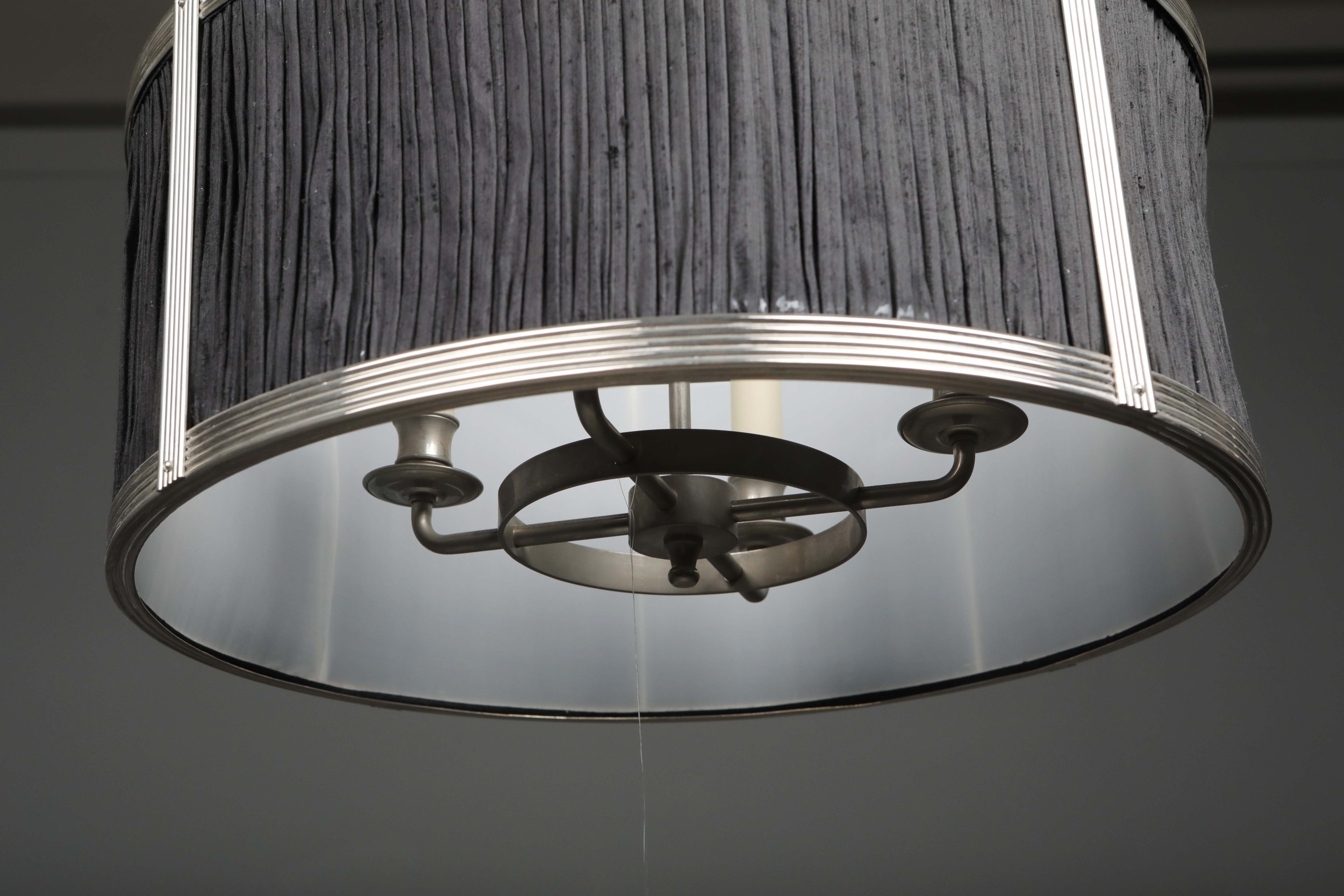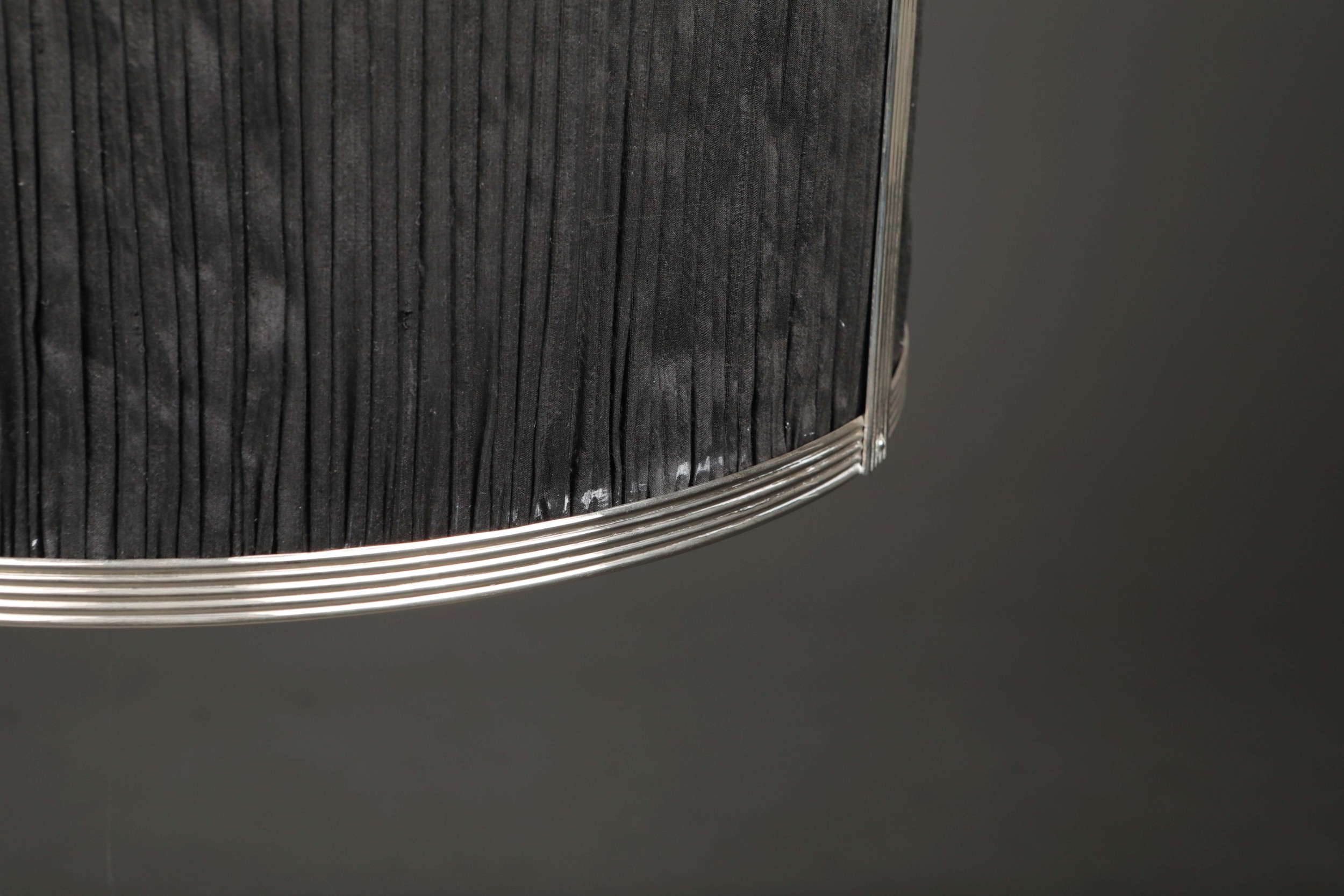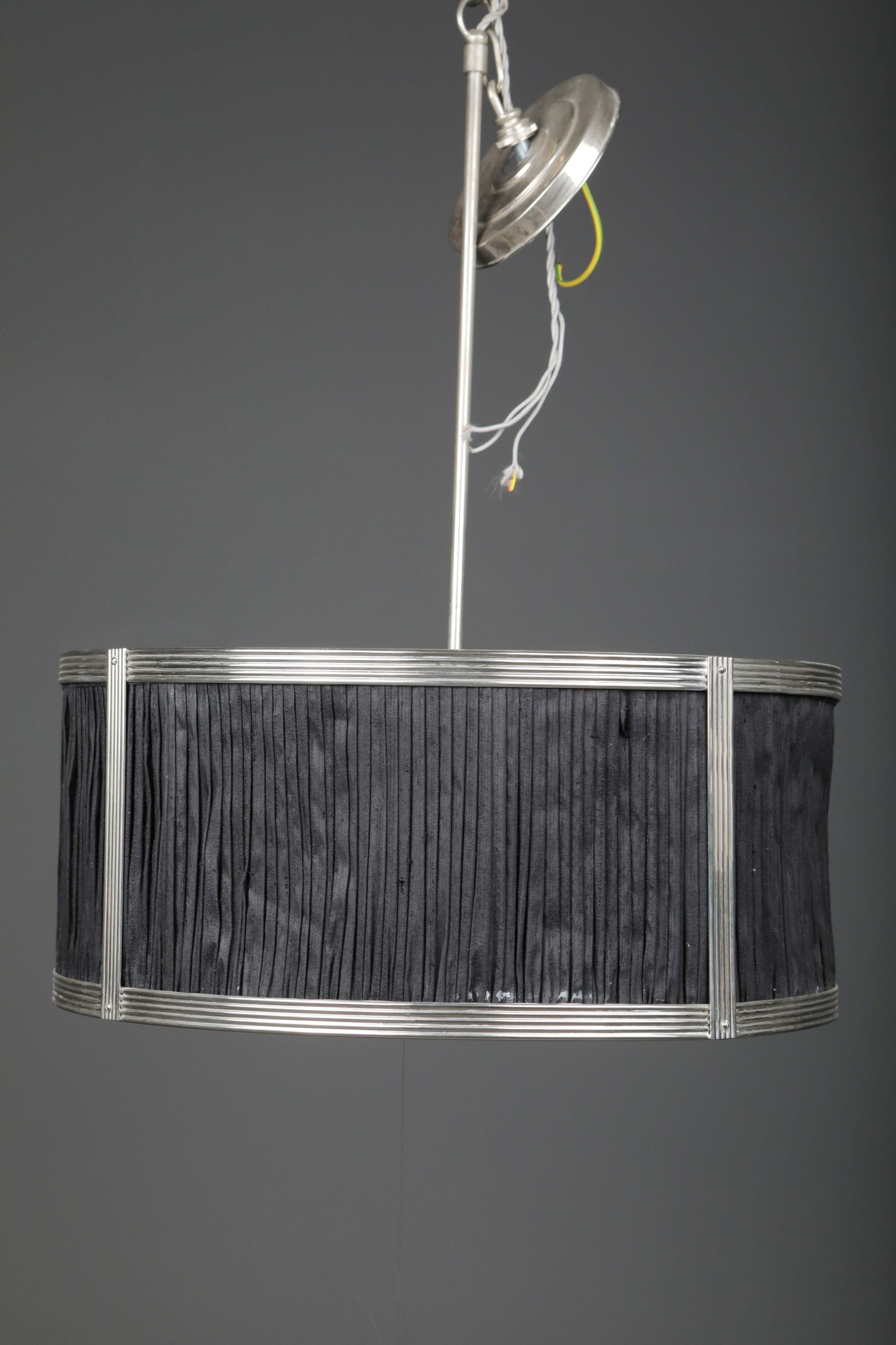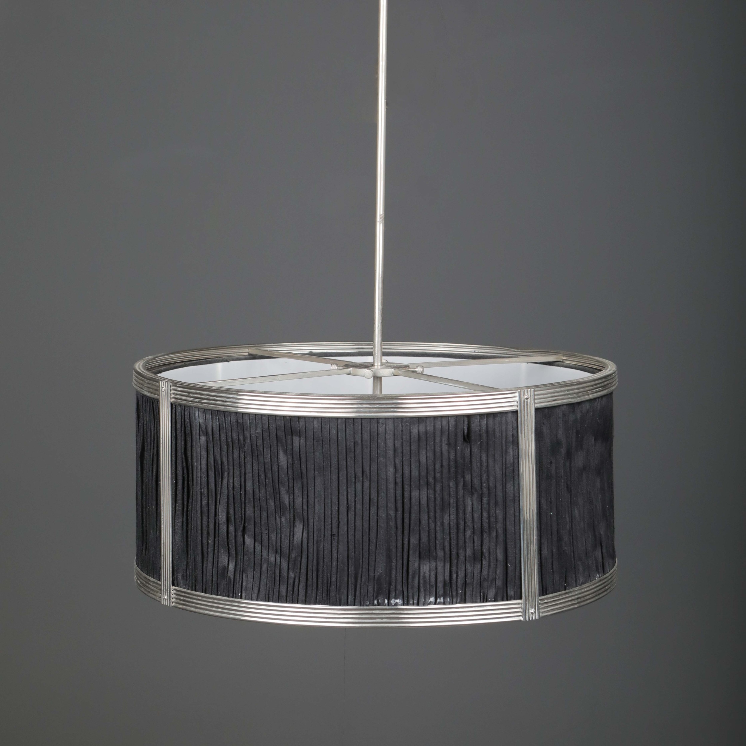 CHARLES EDWARDS HANGING SILK DRUM SHADE LIGHT. 85cm t x 50 cm w approx.