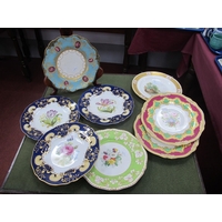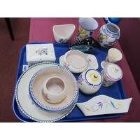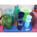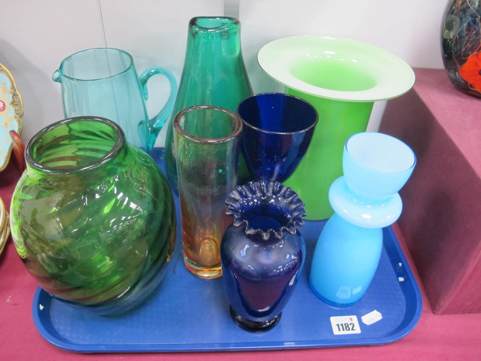 A Green Glass Ovoid Vase with Wrythen Decoration, 20cm high, Bristol blue glass goblet, cylinder vase with wide brim, etc (8):- One Tray.