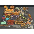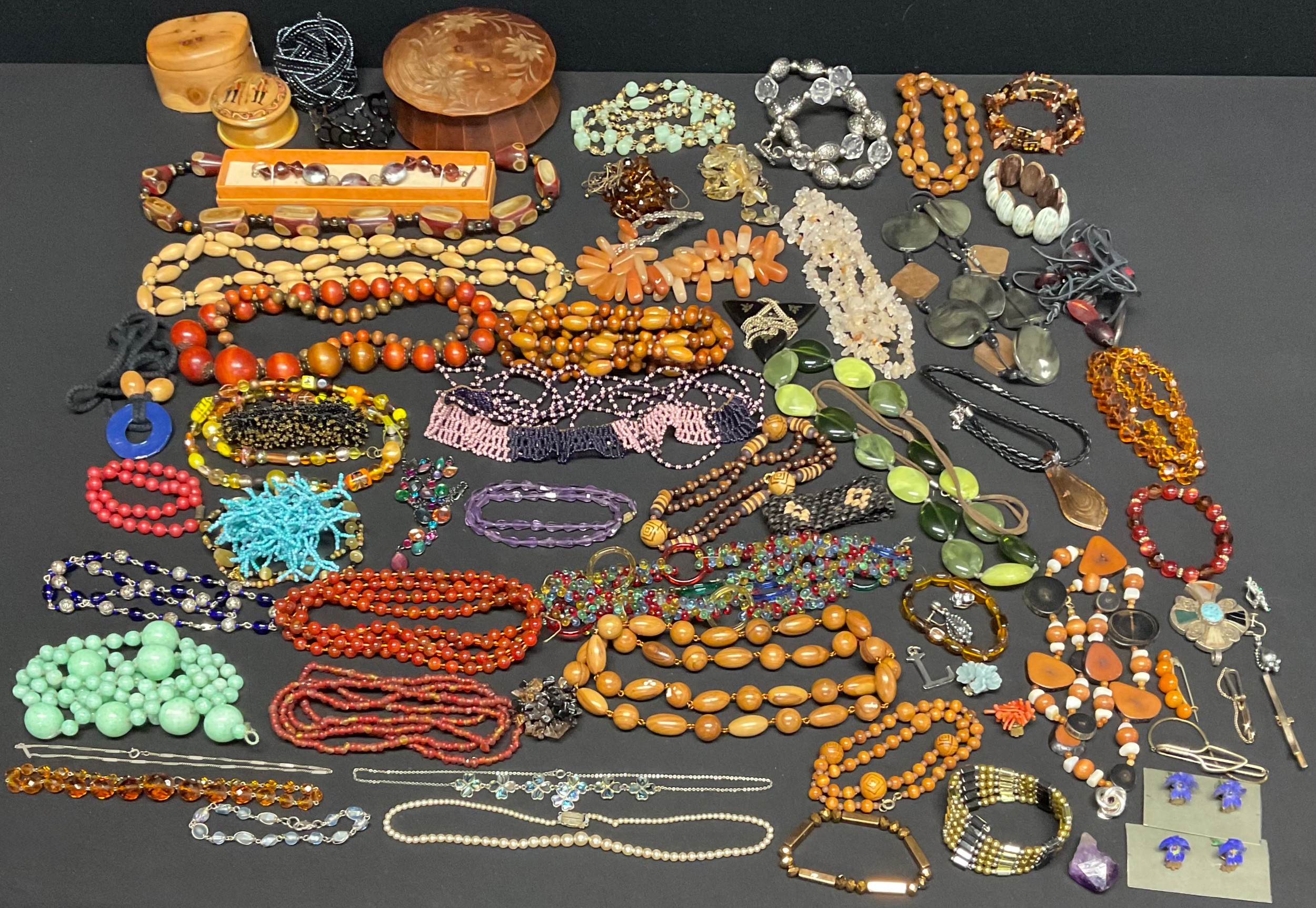 to include semi-precious tumbled stone bead necklaces, wooden, metal, plastic and glass bead necklaces, bracelets, tie clips, odd clip on earrings, little wooden trinket boxes and small fabric drawstring bags and beading wire and beading thread still in packaging, a/f