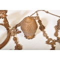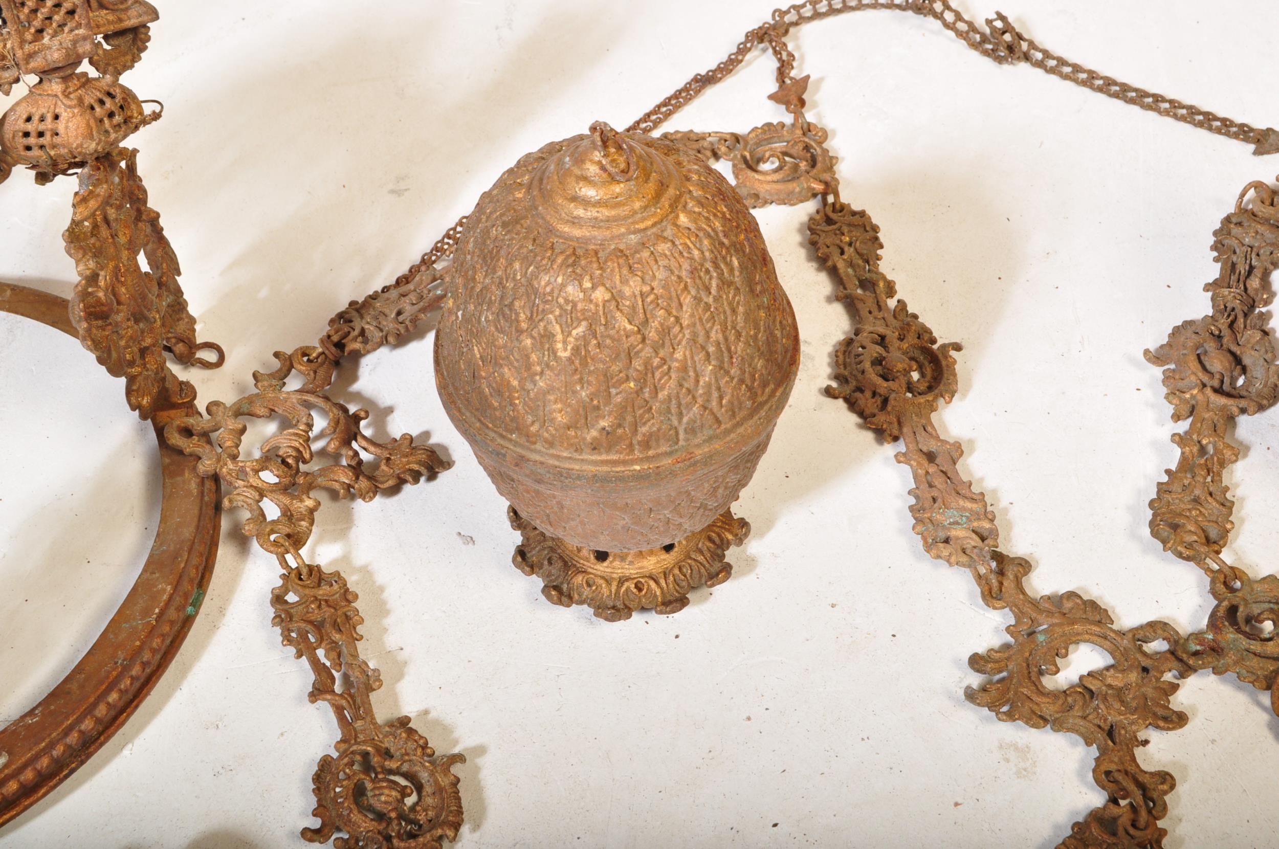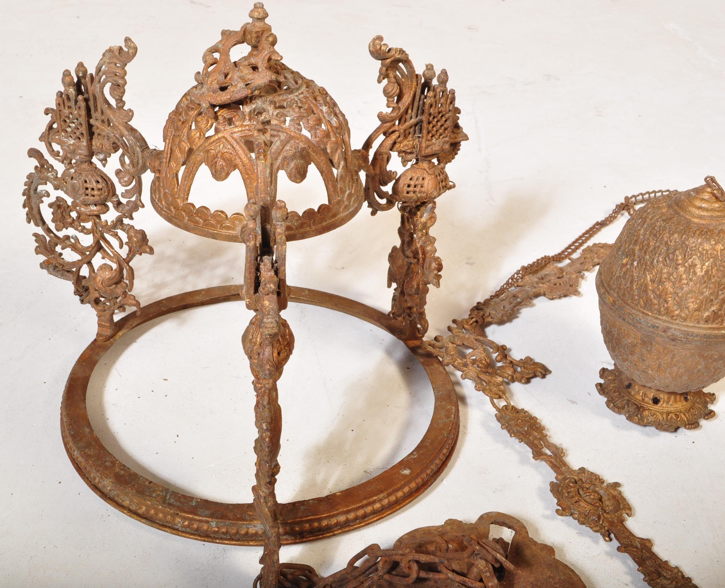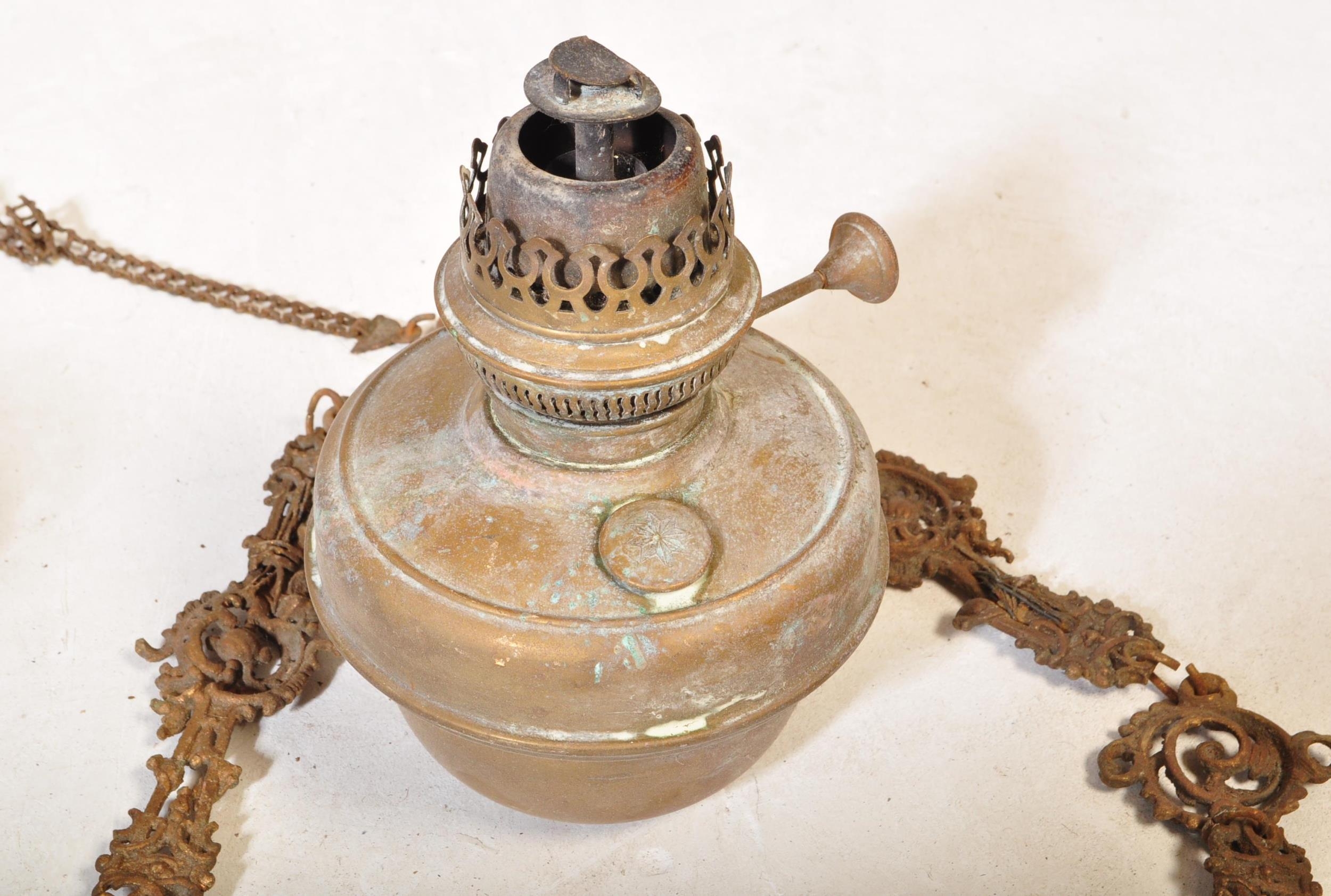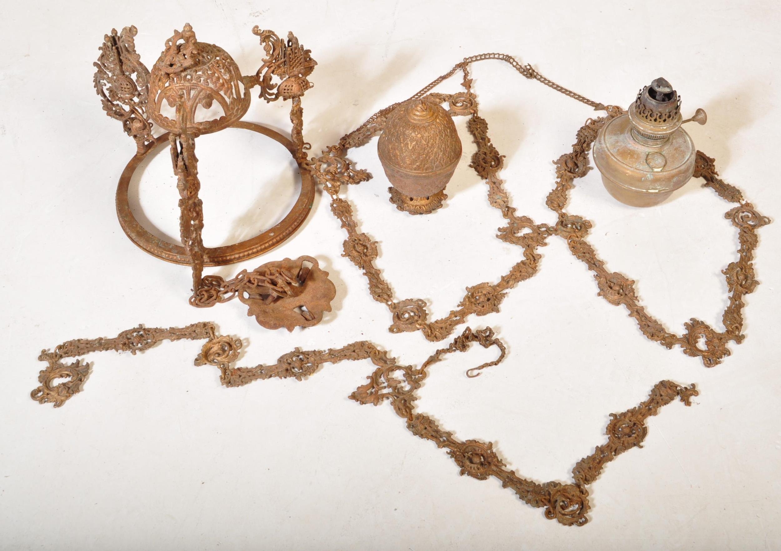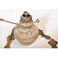 An Edwardian early 20th century cast iron rise & fall oil ceiling lamp chandelier with foliate shaped decorations. Without glass dome.