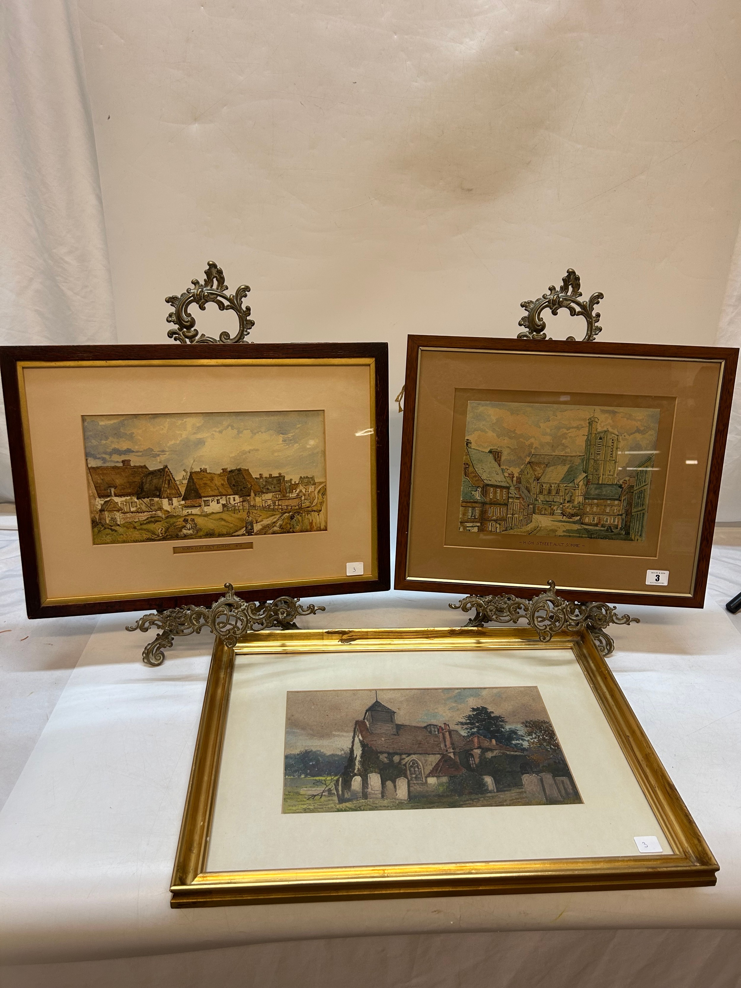 Two watercolours - High Street Ault Somme, North Cliff Ault Somme each 7 1/2in. x 11in. and a watercolour of a church, mounted, framed and glazed