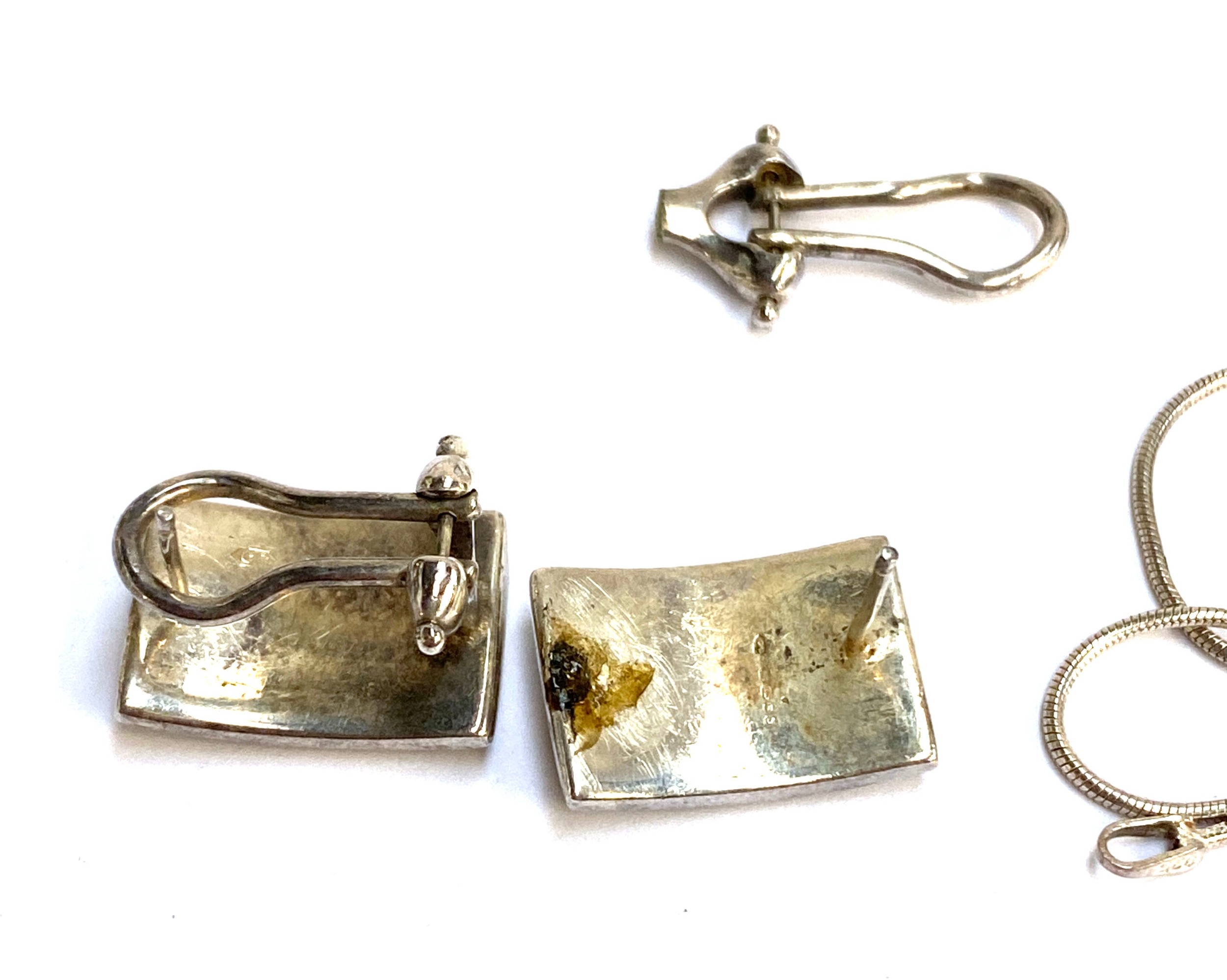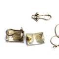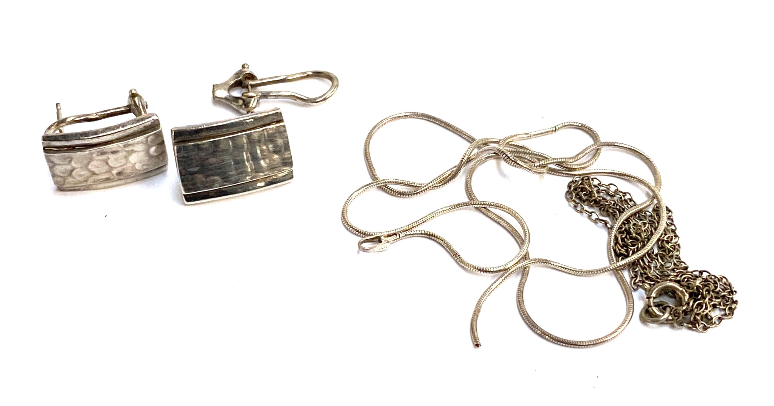 A pair of silver earrings (one safety clip af), broken silver chains etc, gross weight 14.6g