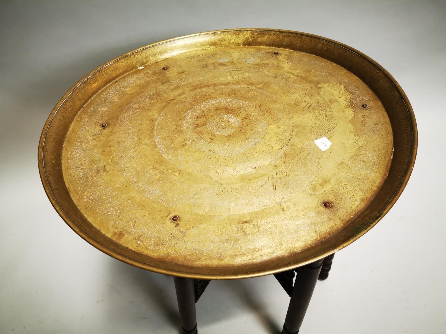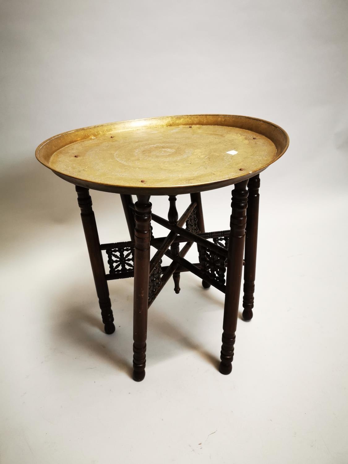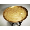 Edwardian brass topped mahogany folding table { 60 cm H x 57 cm Diam}.