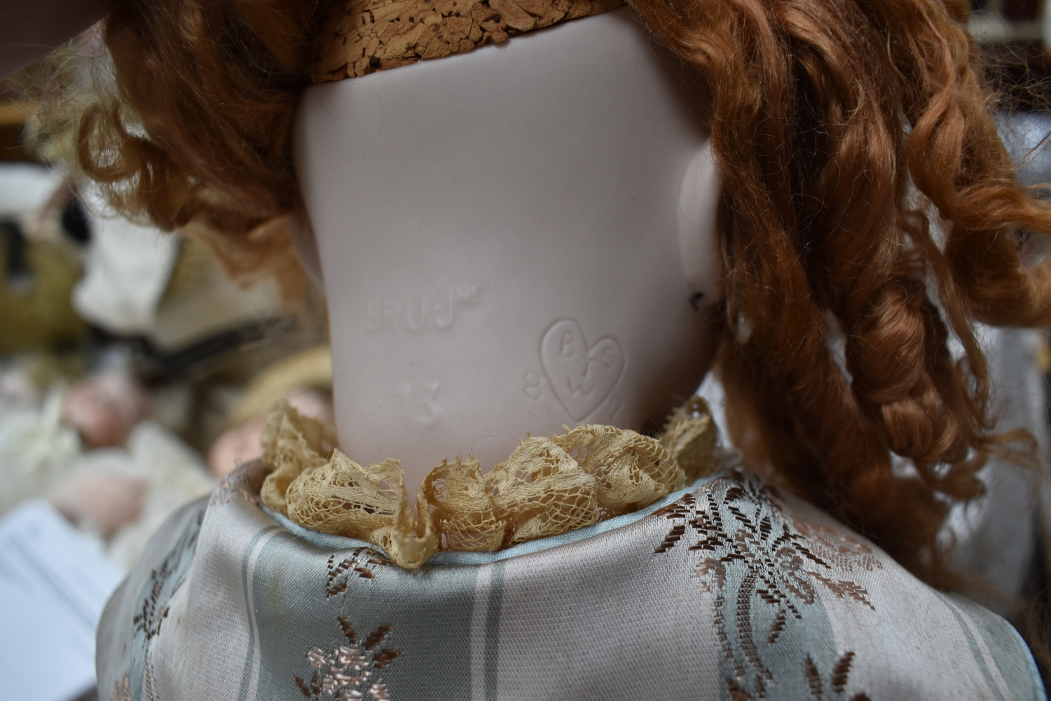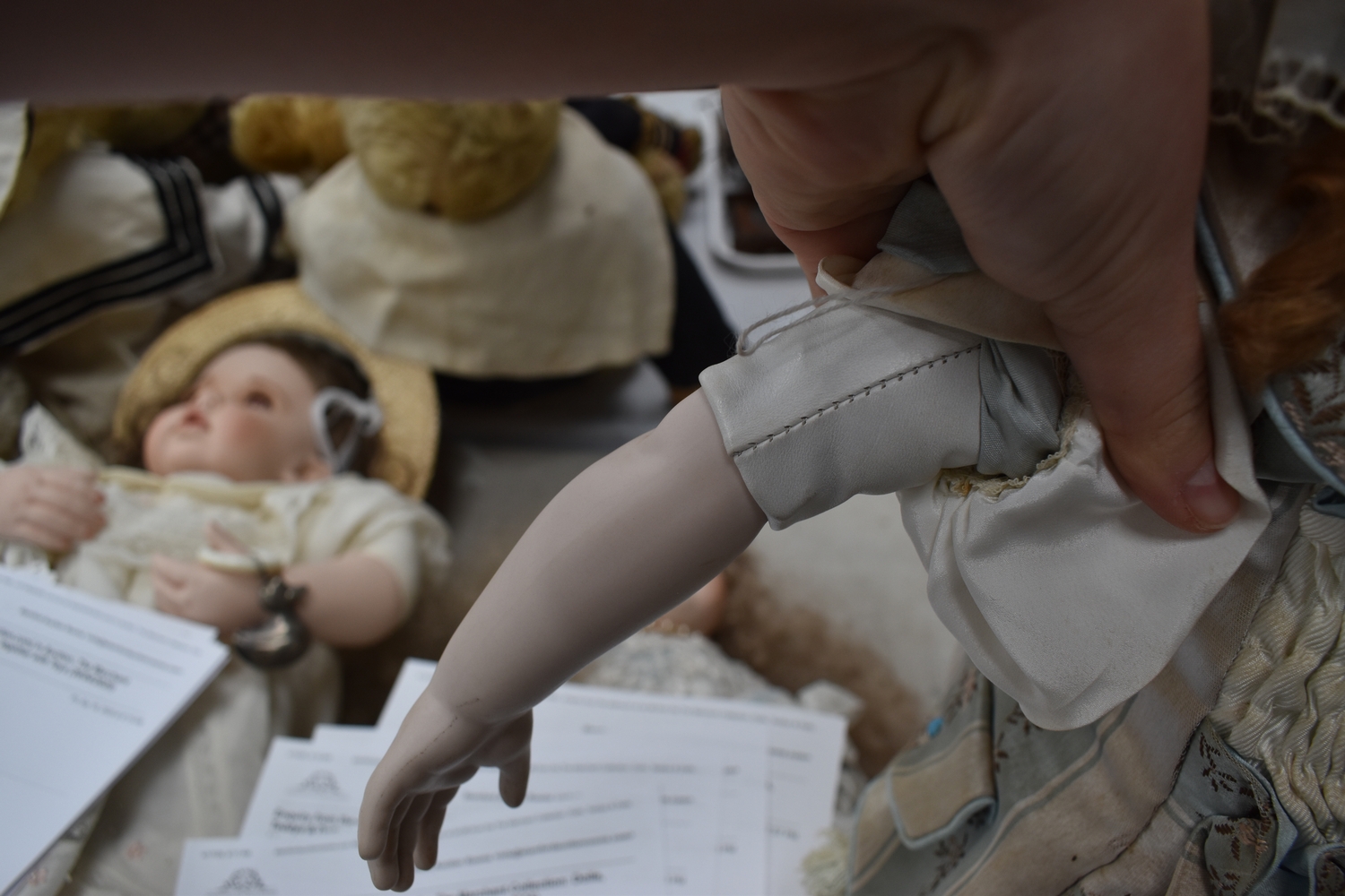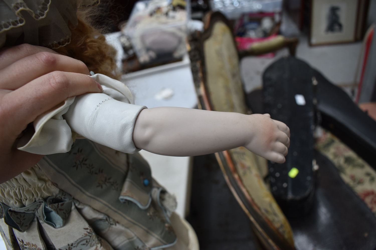 A German porcelain bisque head doll, with composition body and articulated arms.
