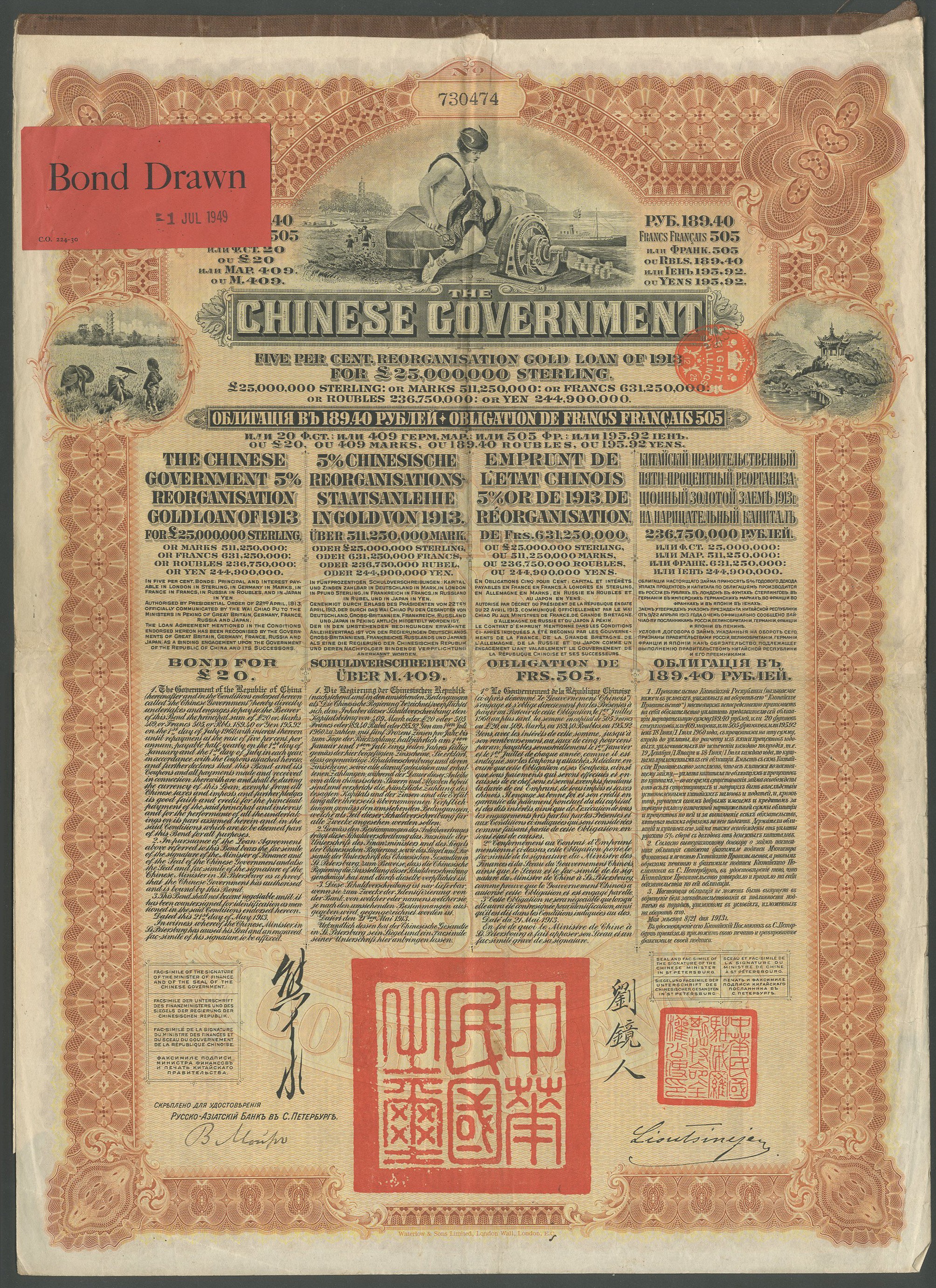 China: 1913 5% Reorganisation Gold Loan, 189.50 roubles bond, issued by the Russo Asiatic Bank, #730474, Mercury at top, brown, with coupons, Drawn sticker top left. GVF