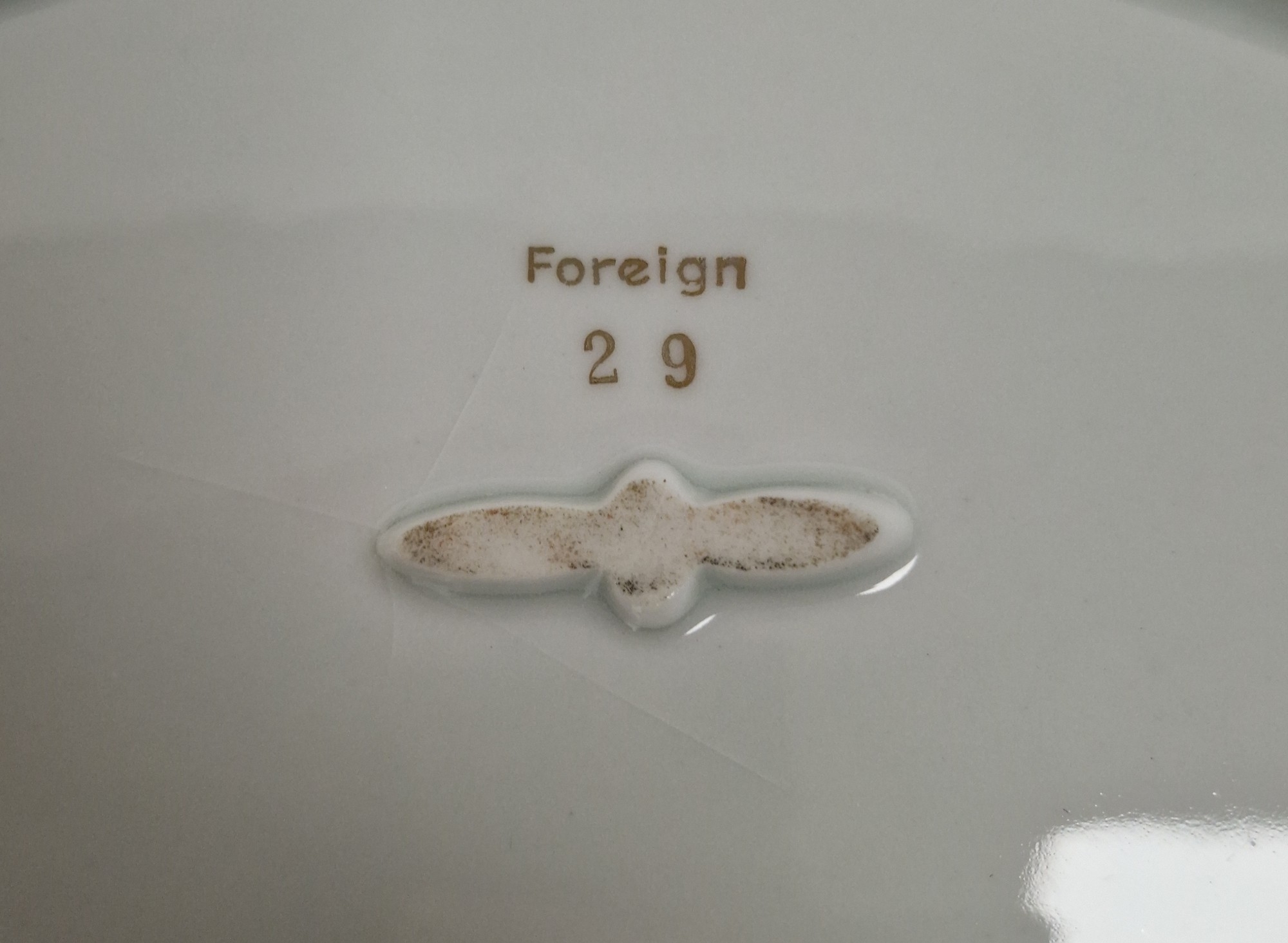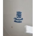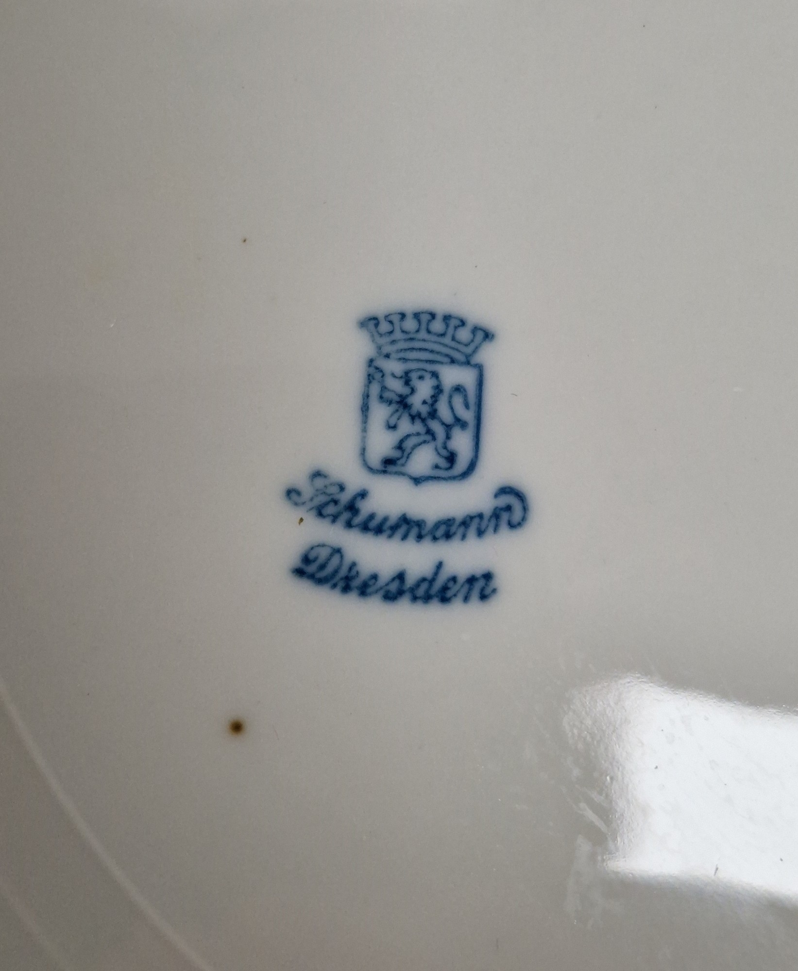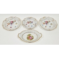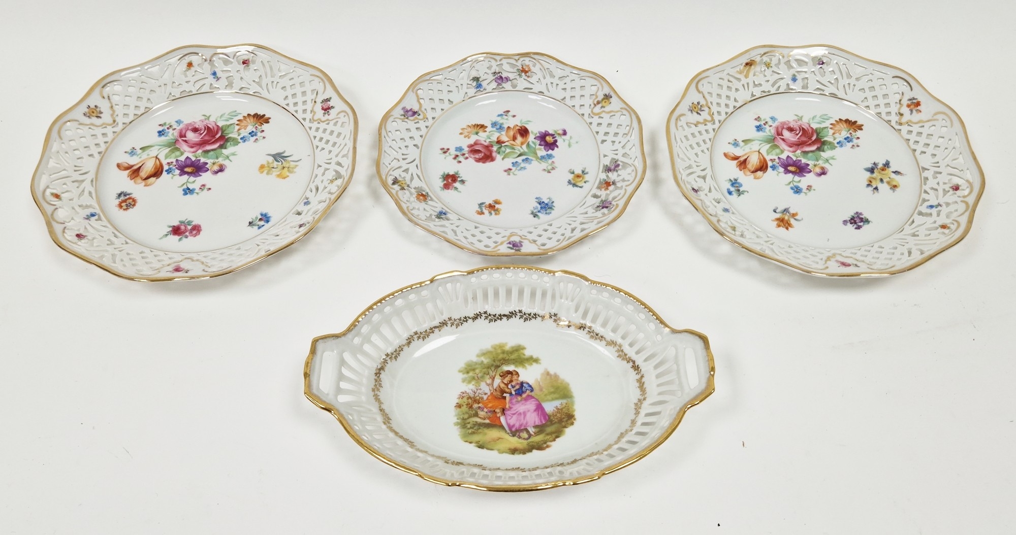 Three 20th century Dresden pierced dessert plates, in sizes and a continental porcelain two-handled oval basket, printed blue and gilt marks, the plates printed with bouquets of flowers and scattered flowersprays within pierced basketwork shaped gilt lined borders, two larger 23.5cm diameter, smaller side plate 20.7cm, the oval basket printed after Fragonard, figures in parkland, 25.5cm wide (4)