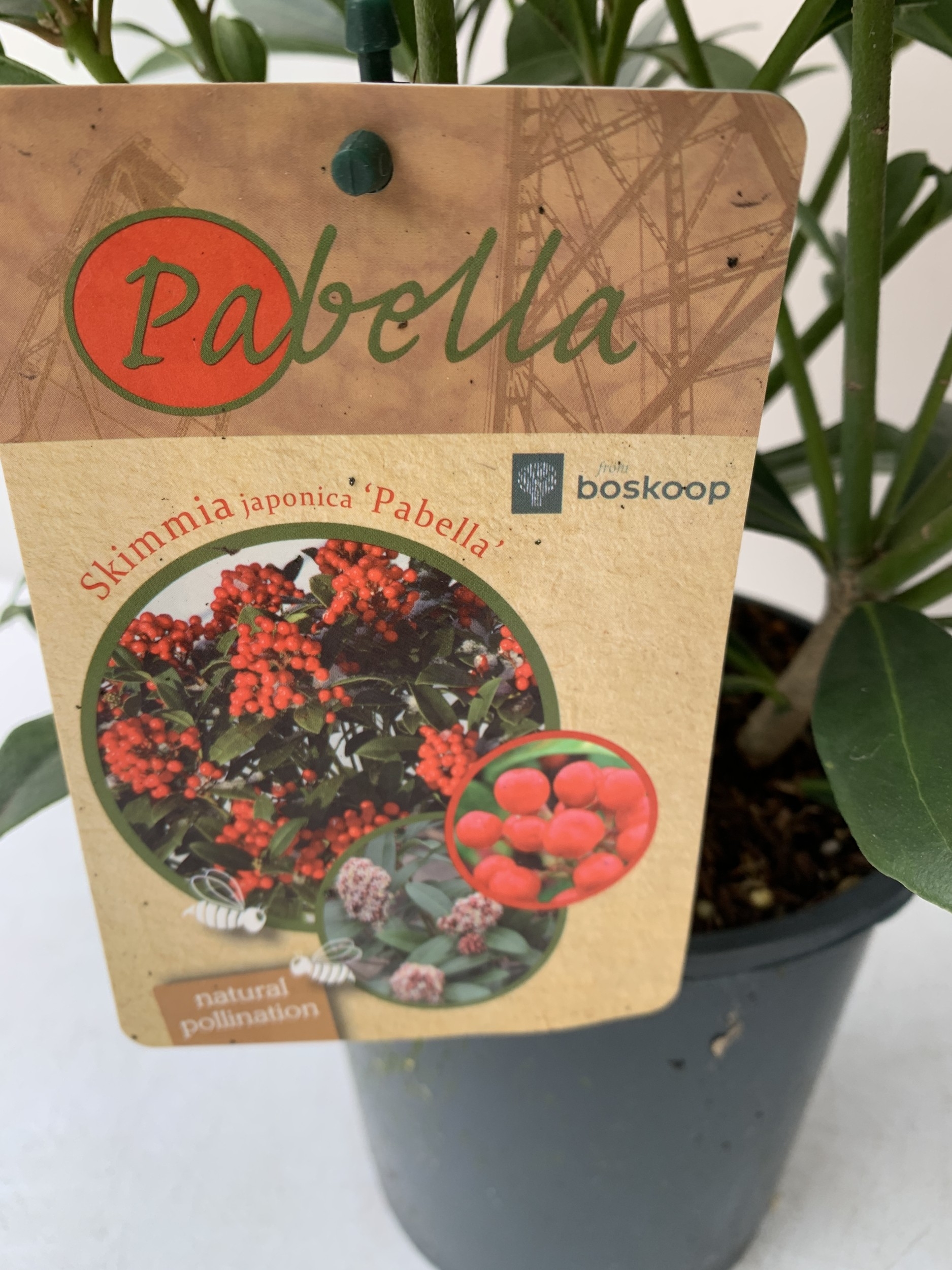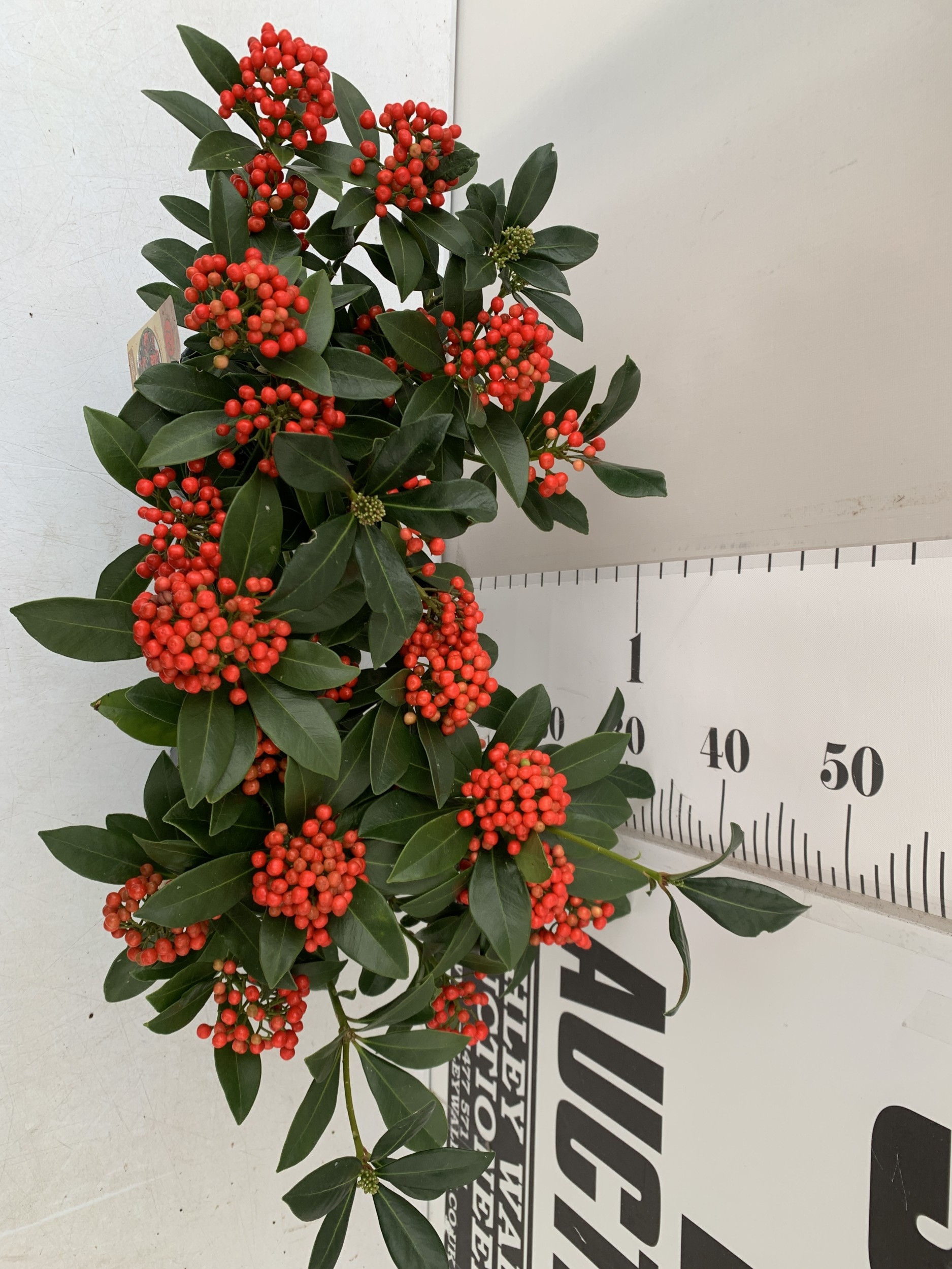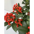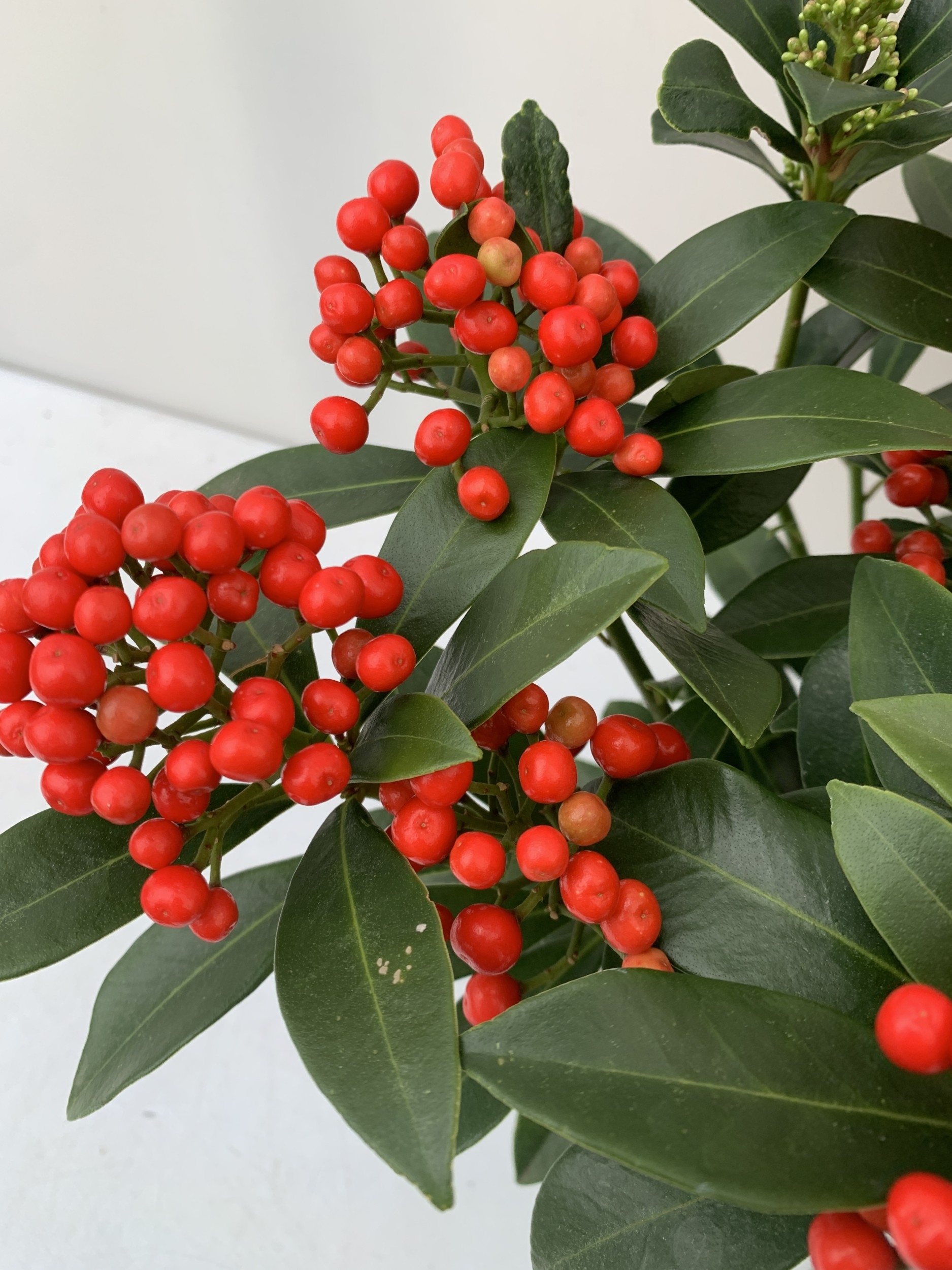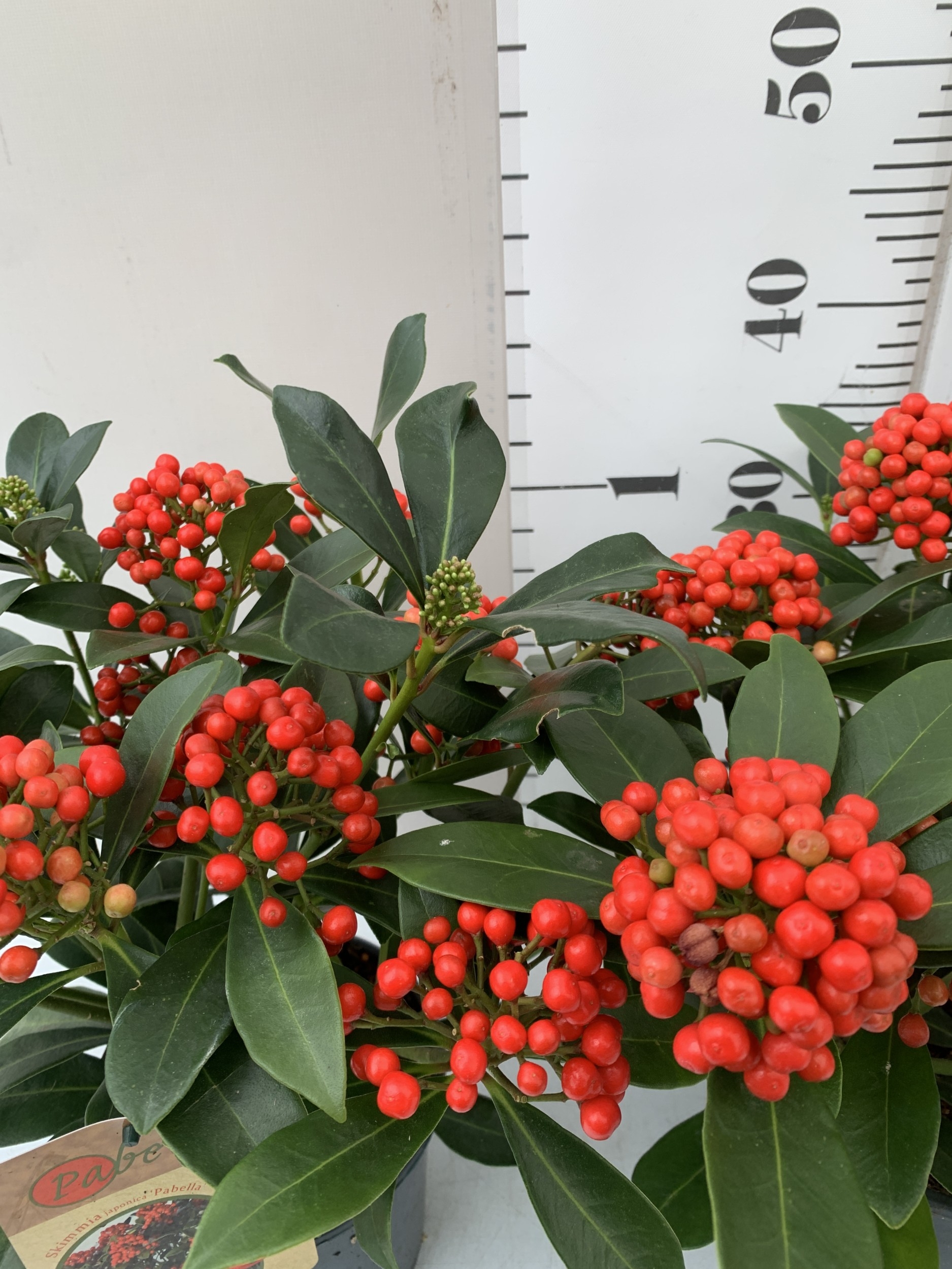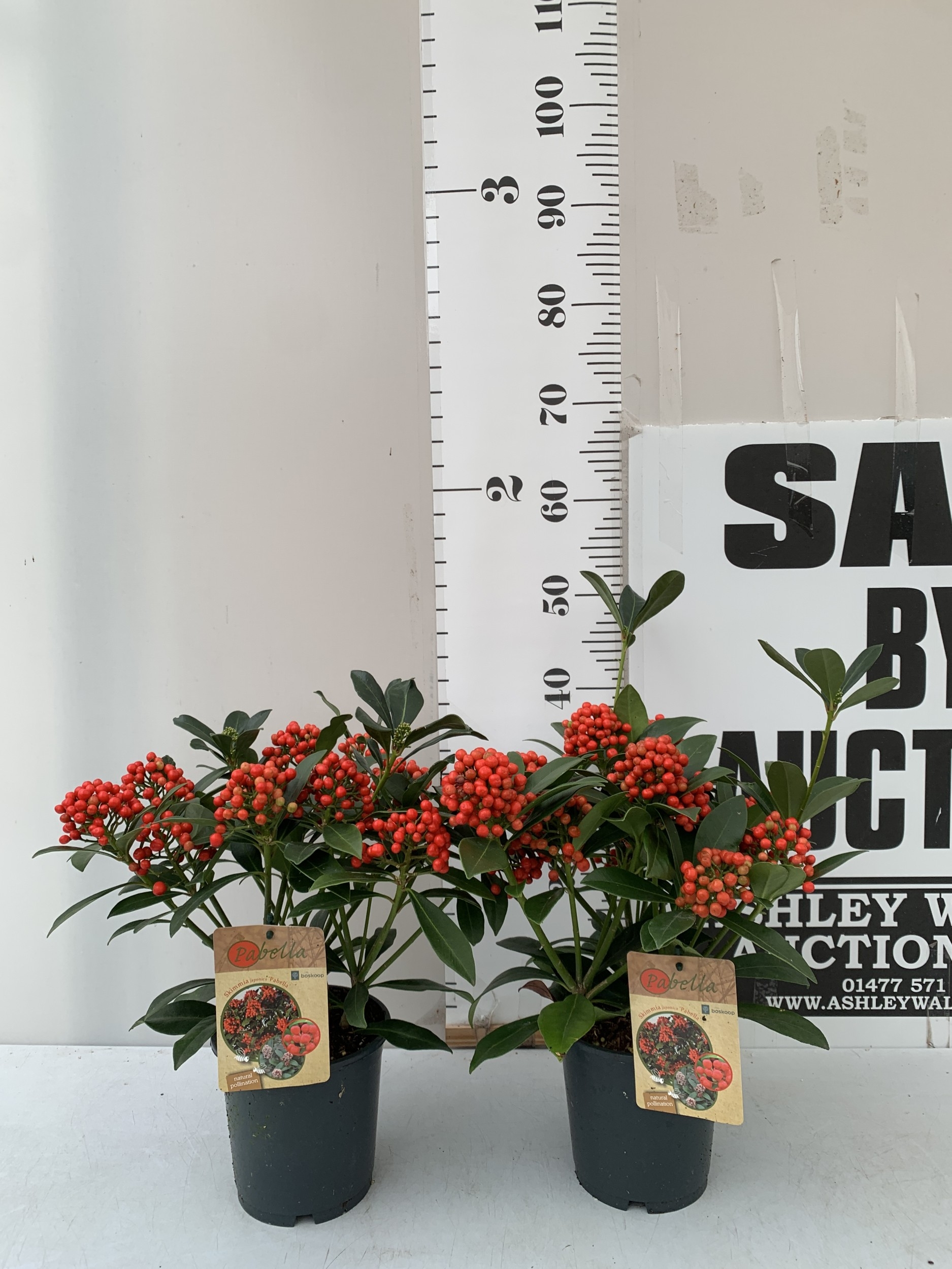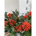 TWO SKIMMIA JAPONICA 'PABELLA' IN 2 LTR POTS. LADEN WITH RED BERRIES. APPROX 40CM TALL, TO BE SOLD FOR THE PAIR